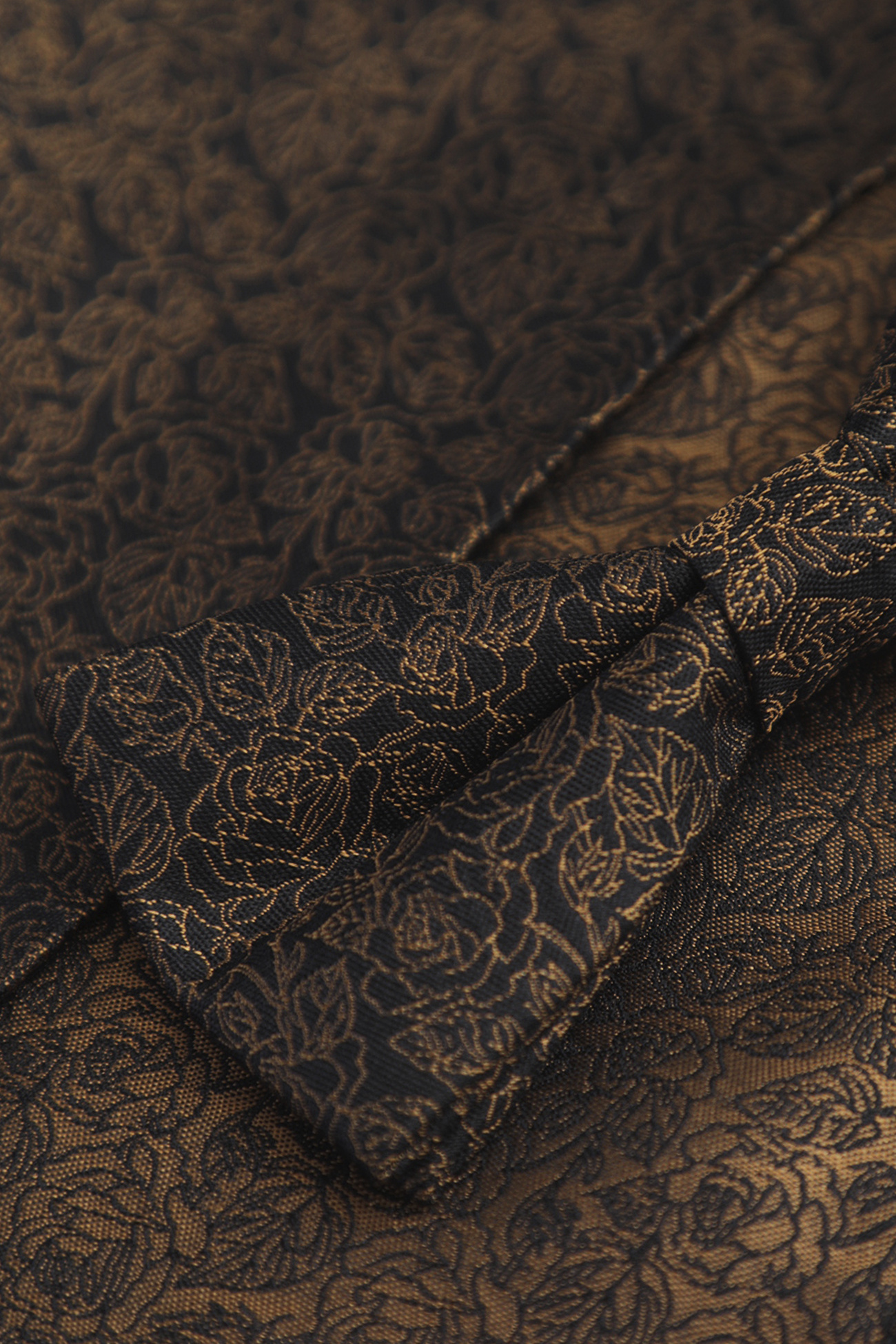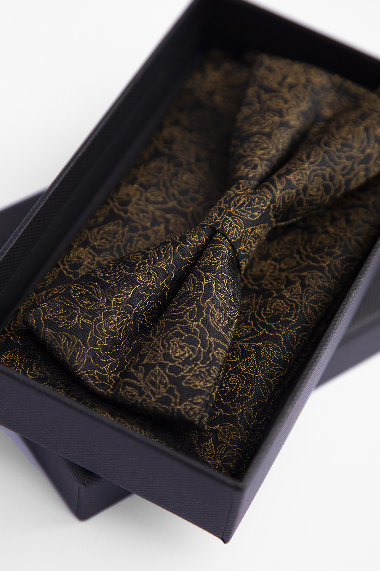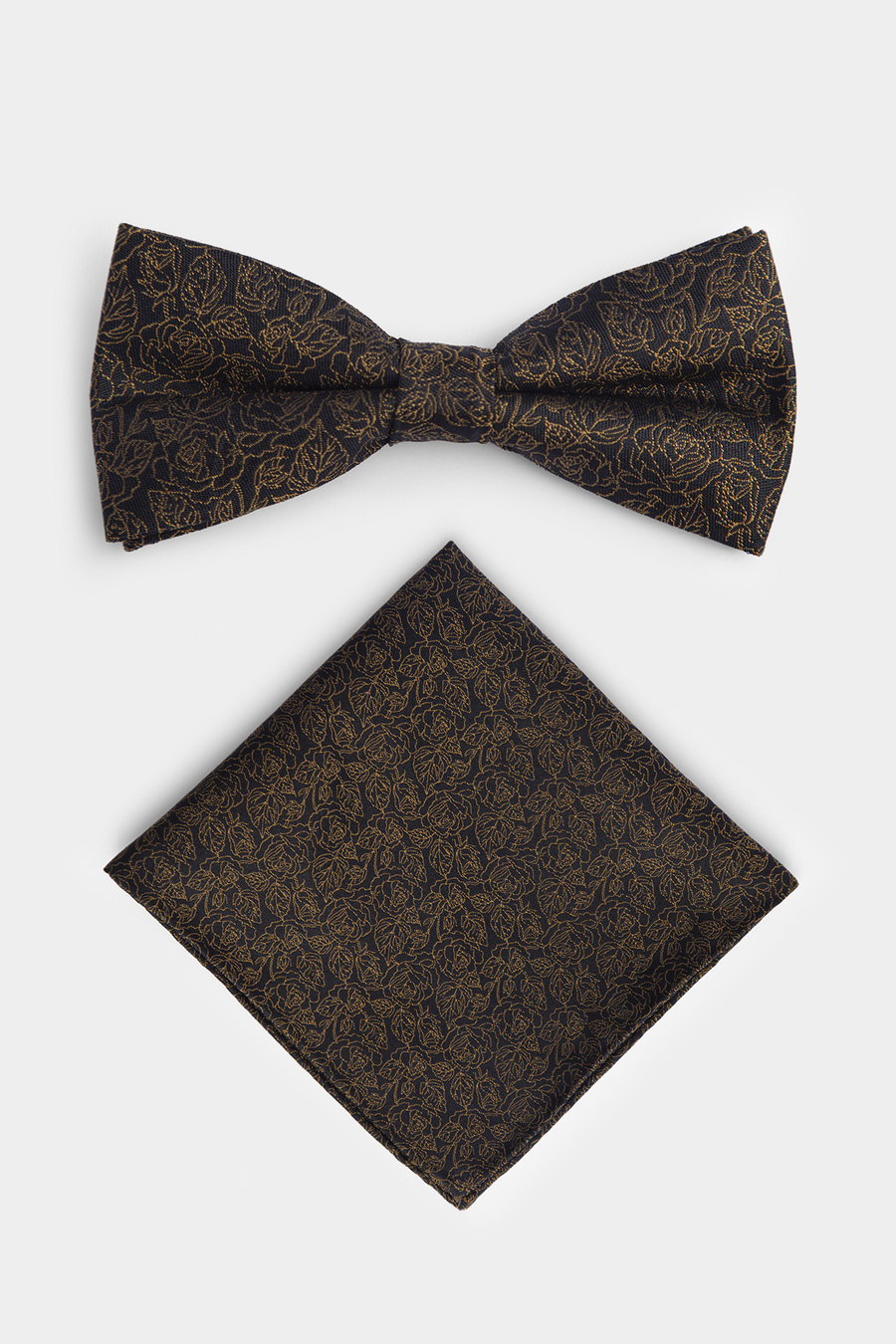 Czarna baza przełamana czarno-złotym deseniem nadaje całości klasyczny, a zarazem wyrazisty charakter. Spójność wzoru muchy i poszetki pozwala stworzyć harmonijną, dopracowaną stylizację.