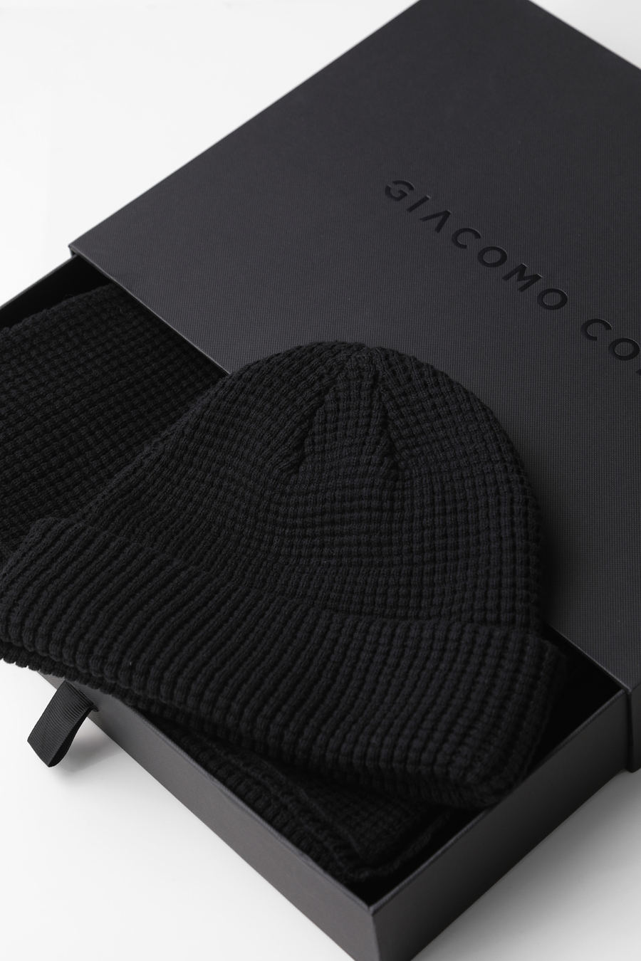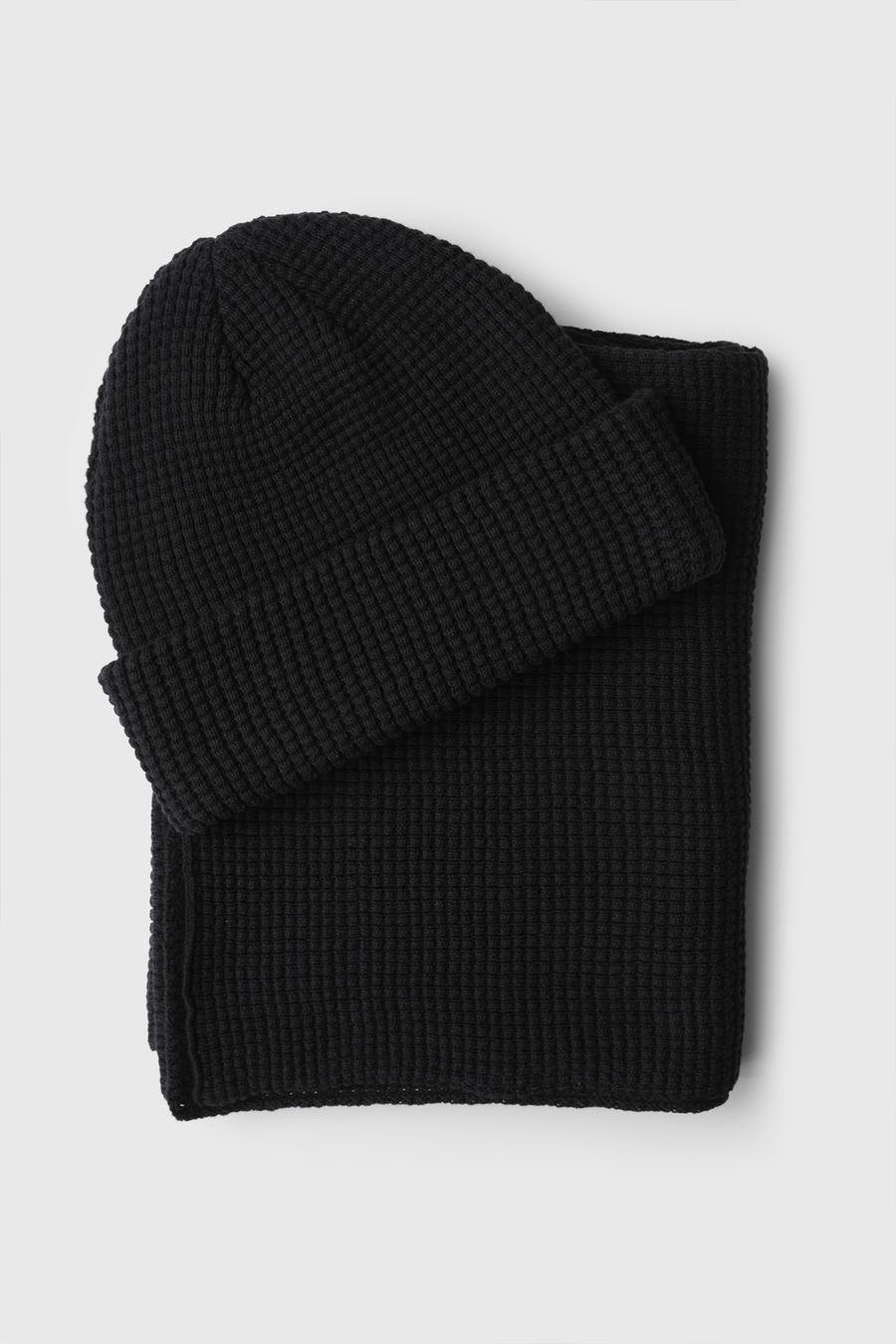 Czarny zestaw: czapka i szal z dzianiny wykonanej w 100% z naturalnej bawełny.