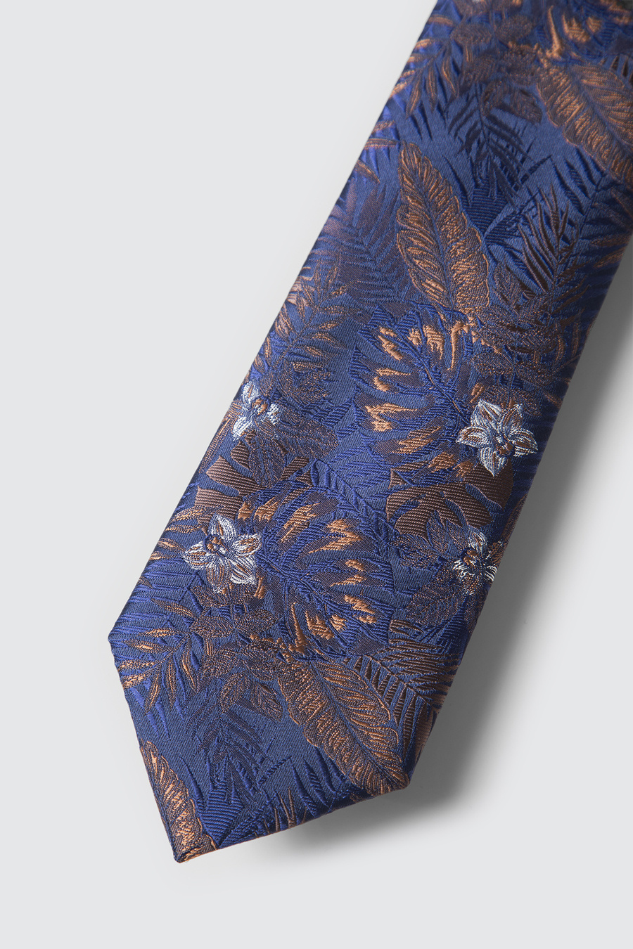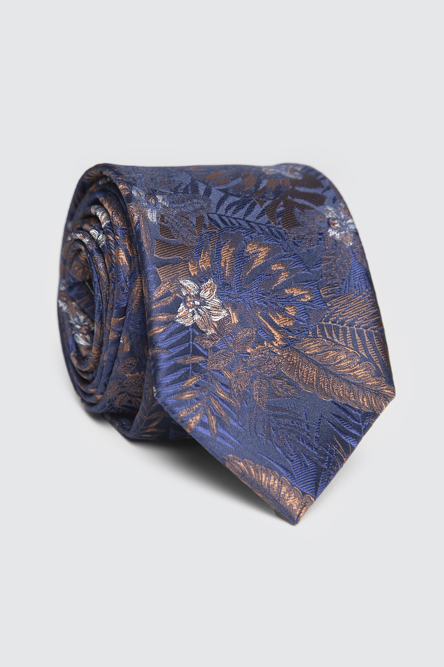 Granatowy kolor w połączeniu z wyrazistym, tropikalnym wzorem sprawia, że model świetnie sprawdzi się zarówno w stylizacjach biznesowych, jak i na mniej formalne okazje, dodając im indywidualnego charakteru.