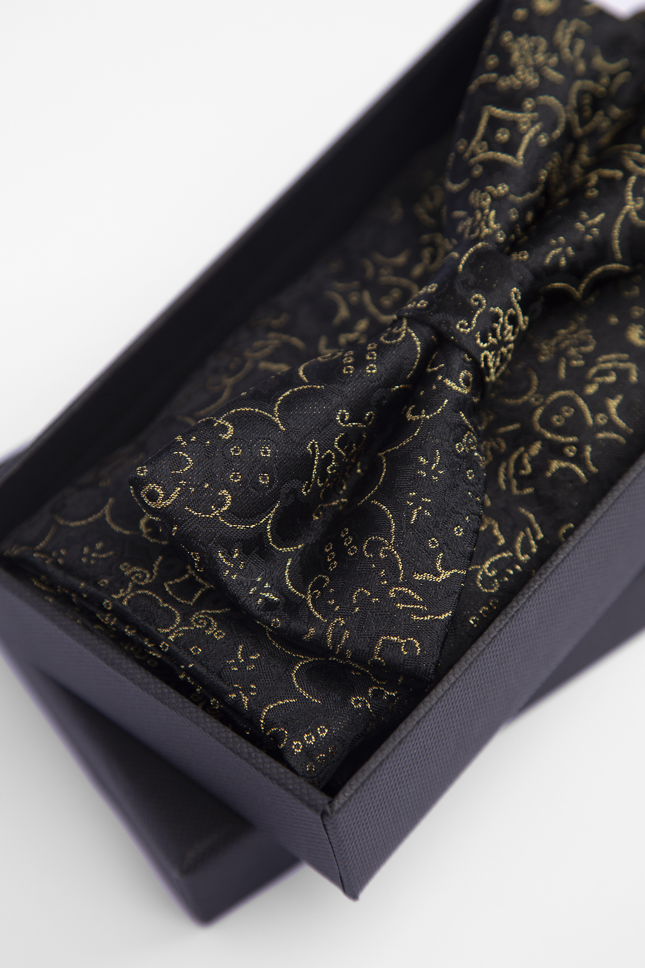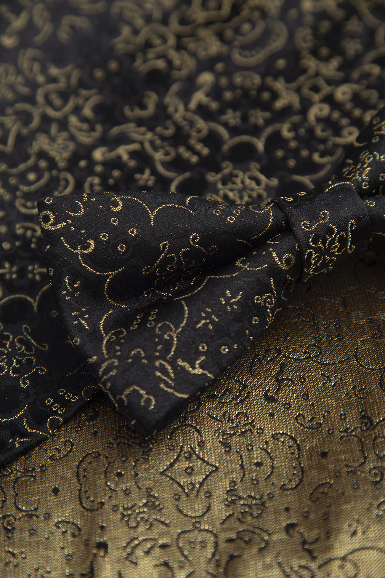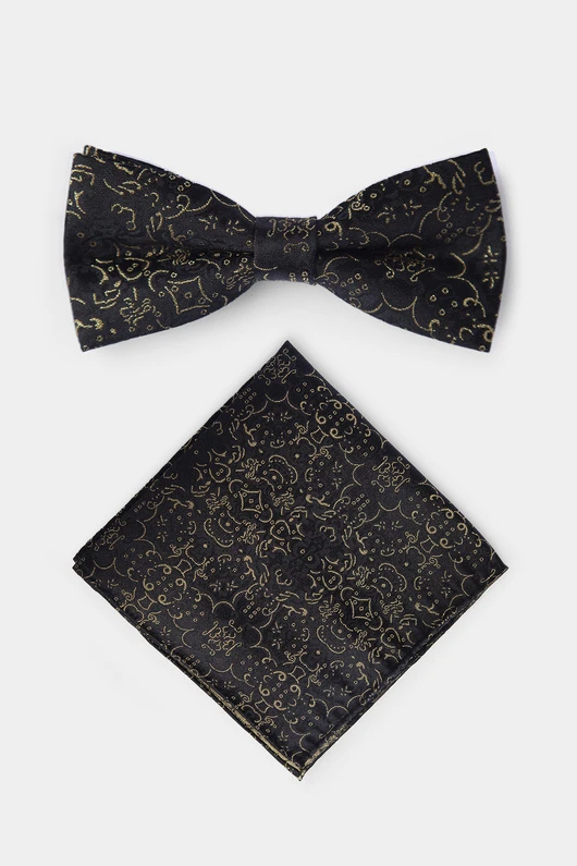 Czarny model został ozdobiony żakardowym wzorem wyszytym złotą nicią, co dodaje mu elegancji, blasku i szlachetnego wyrazu. Doskonale sprawdzi się zarówno na formalnych okazjach, jak i w nowoczesnych zestawieniach smart casual.