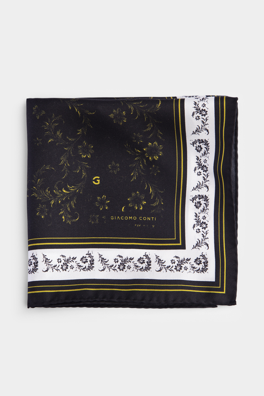 Model został wykonany z wysokiej jakości jedwabnej tkaniny o subtelnym połysku, która pięknie układa się w brustaszy. Dominująca czerń została przełamana kontrastującymi akcentami bieli oraz złota, tworząc efektowną, a jednocześnie harmonijną kompozycję. Ozdobny motyw oraz delikatnie wkomponowana litera „G” – symbol marki – podkreślają ekskluzywny charakter produktu.