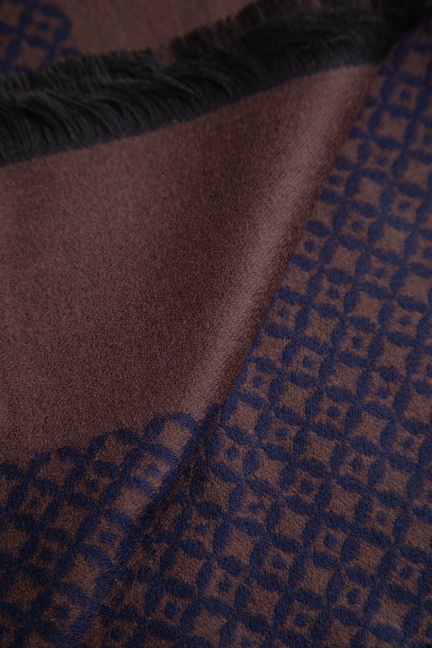 Brązowy szal z eleganckim granatowym mikrowzorem nadaje klasy i subtelnego charakteru każdej jesienno-zimowej stylizacji. Stonowana kolorystyka w połączeniu z delikatnym wzorem sprawia, że model doskonale komponuje się zarówno z formalnymi płaszczami, jak i bardziej casualowymi okryciami.