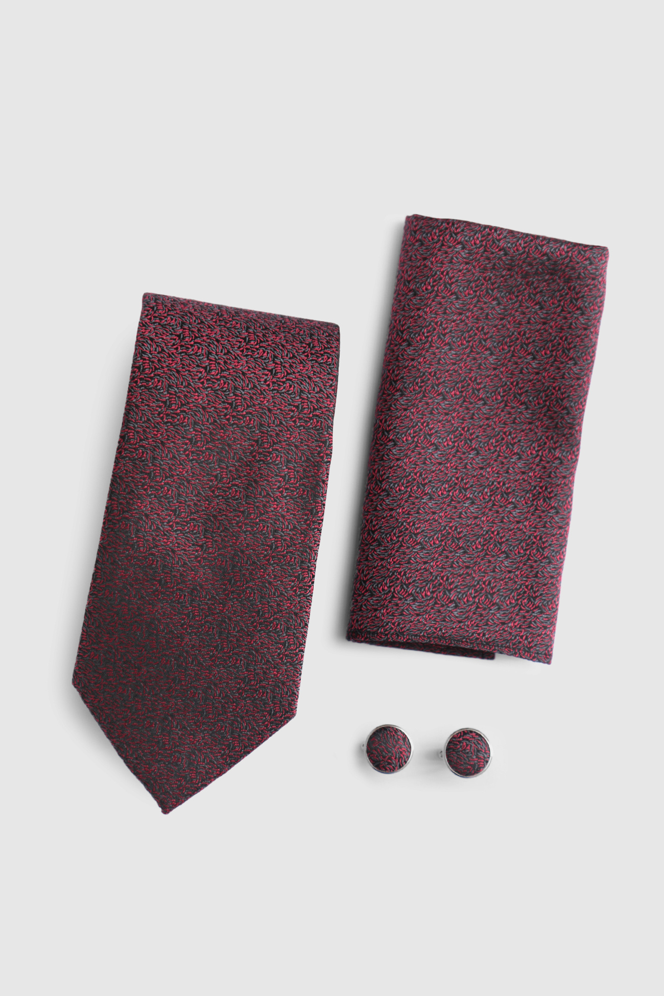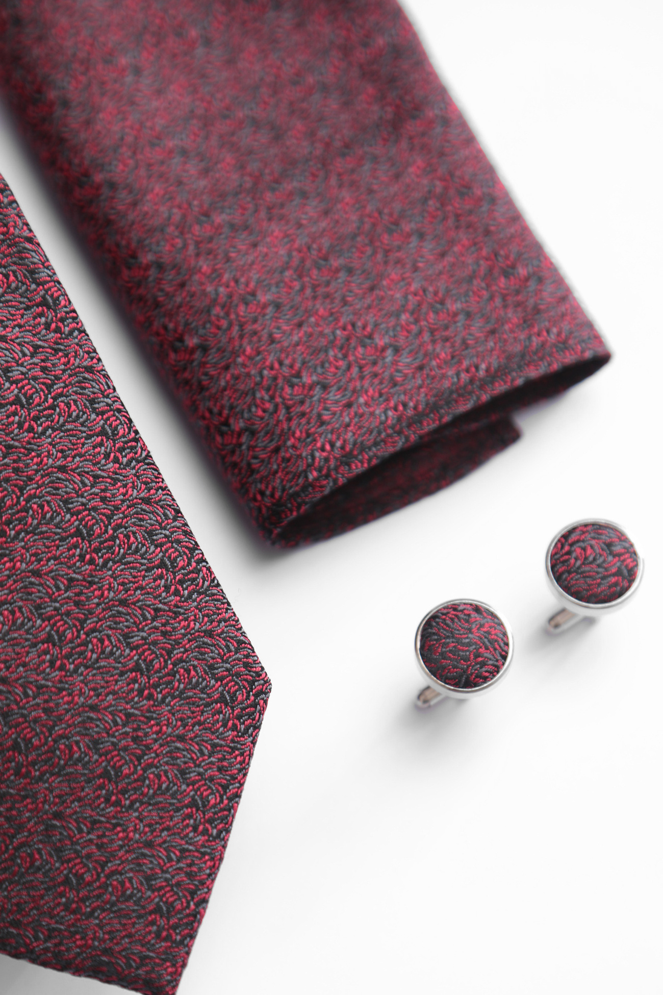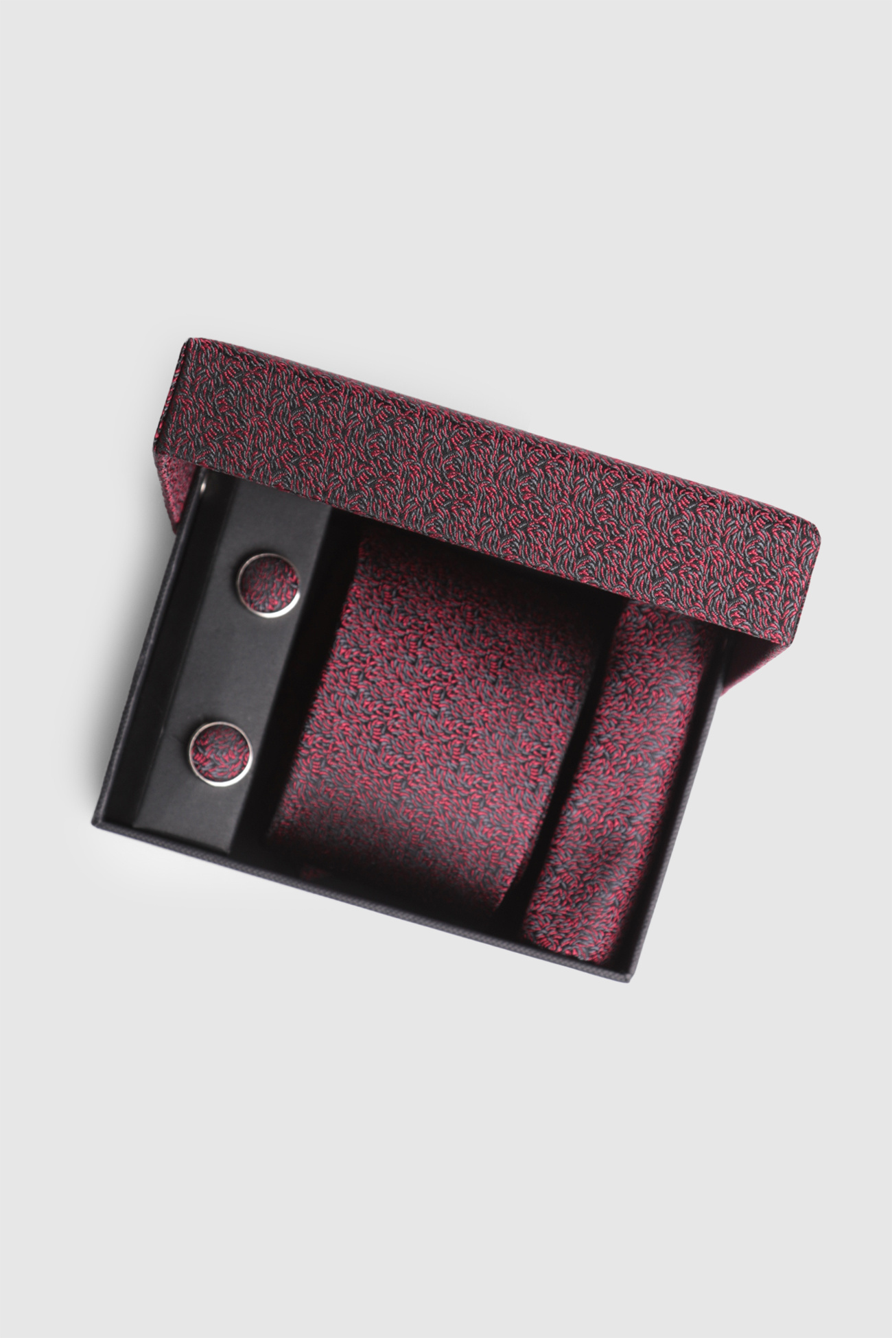 Ekskluzywny zestaw męskich akcesoriów wykonany z najwyższej jakości materiałów. Krawat oraz poszetka zostały uszyte w 100% z jedwabiu, który zachwyca subtelnym połyskiem i żakardową fakturą. Spinki do mankietów wykonano w całości z mosiądzu, dzięki czemu są trwałe i stylowe. Całość zapakowana w eleganckie, bordowe pudełko o spójnym wzornictwie, co sprawia, że zestaw prezentuje się wyjątkowo luksusowo – idealny jako prezent dla mężczyzny ceniącego klasę i ponadczasową elegancję.
