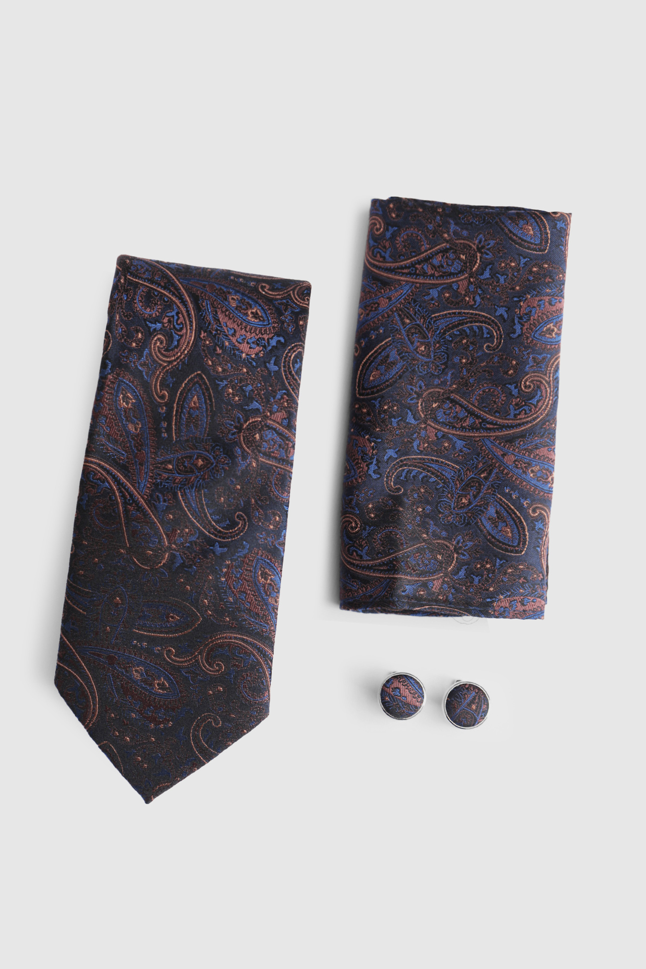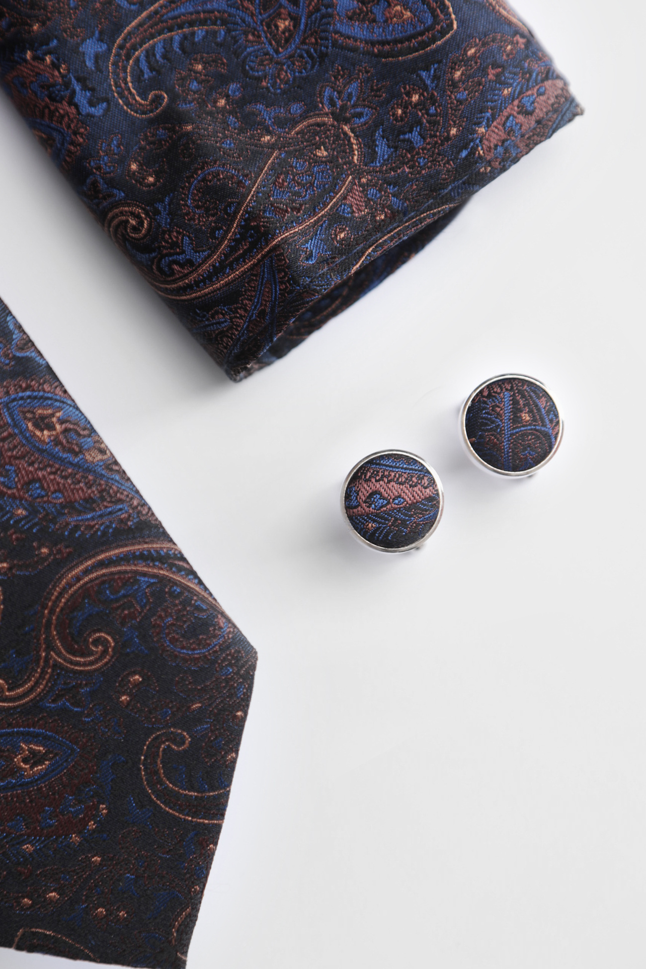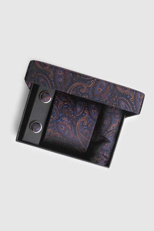 Zestaw krawat z poszetką i spinką to propozycja dla mężczyzn, którzy cenią dopracowane detale i perfekcyjne wykonanie. Krawat wraz z poszetką zostały stworzone z czystego jedwabiu, wyróżniającego się delikatnym połyskiem oraz eleganckim, żakardowym splotem dodającym głębi i wyrafinowania. Uzupełnieniem kompletu są solidne spinki do mankietów wykonane z trwałego mosiądzu, które podkreślają klasyczny charakter zestawu.