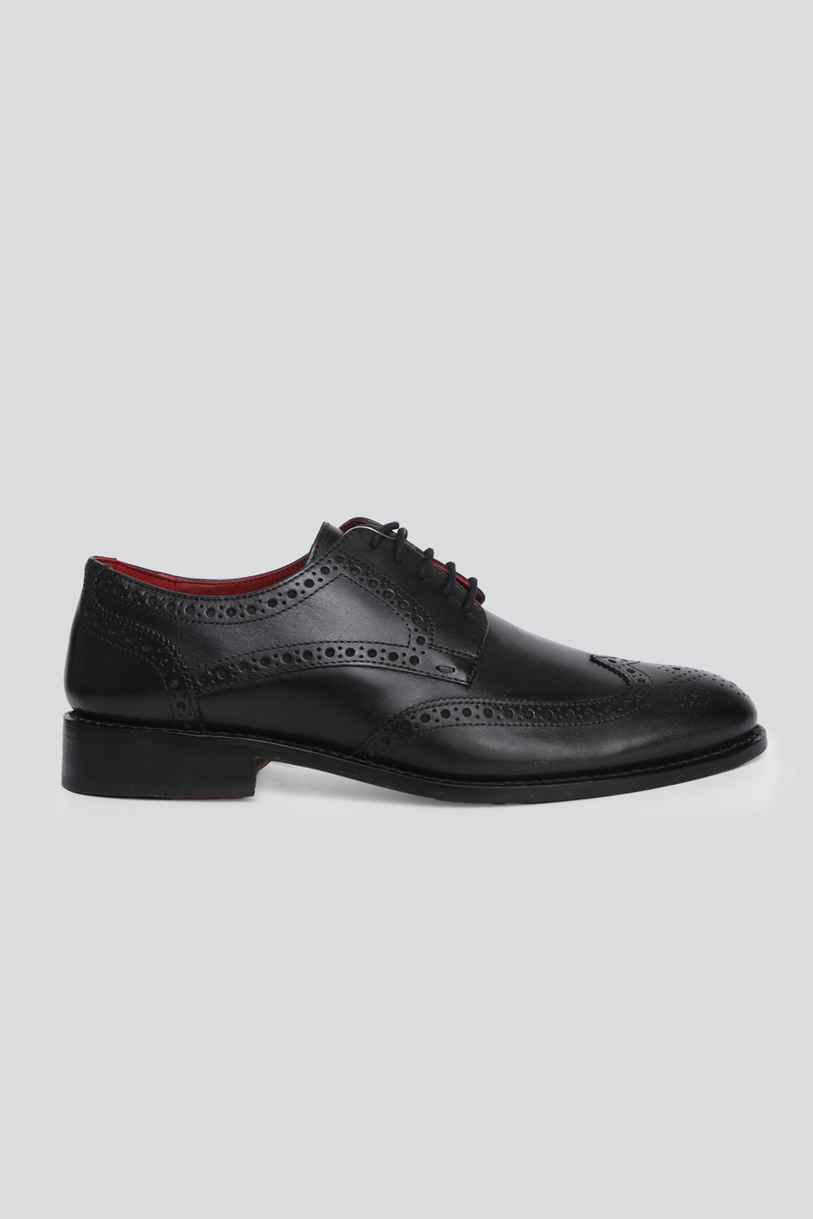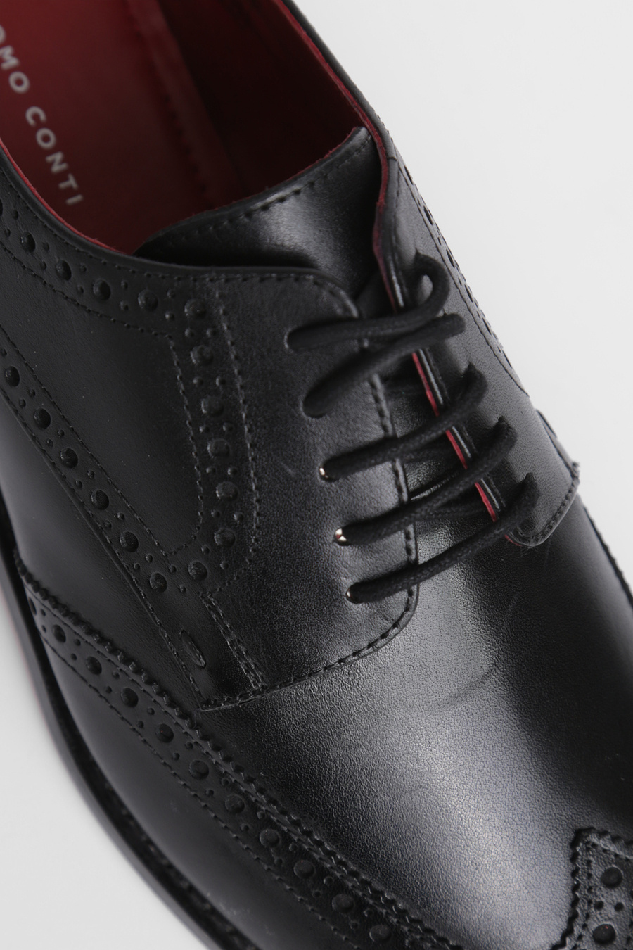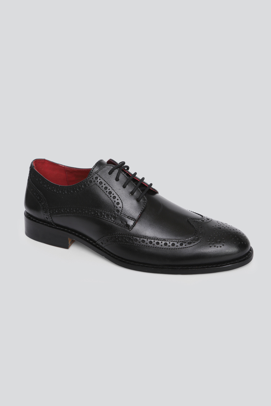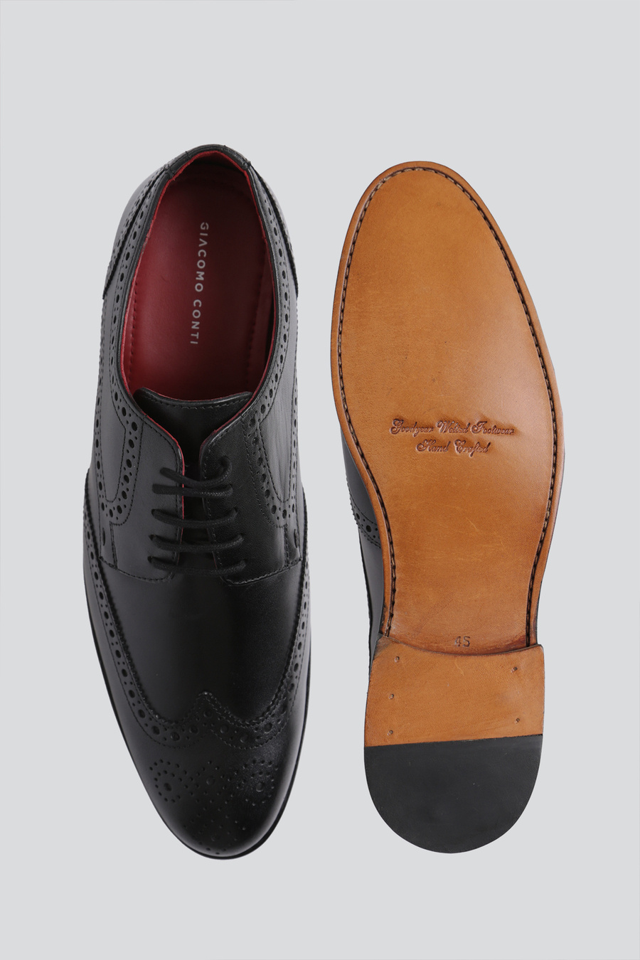 Brogsy w kolorze czarnym to buty, które charakteryzują się ażurowymi perforacjami – wzorem ułożonym z dziurek w materiale. Z zewnątrz buty uszyte zostały ze skóry bydlęcej, która jest bardzo wytrzymałym materiałem, co wpływa na trwałość obuwia. Wnętrze buta czyli podszewka oraz wkładka została uszyta z kolei ze skóry owczej. Materiał ten cechuję się miękkością oraz lekkością. Czerwony kolor podszewki, dodaje modelowi oryginalności. Podeszwa uszyta ręcznie, a unikatowości dodaje jej detal w postaci delikatnie ściętego rogu obcasa, taki zabieg świadczy o wysokiej klasie buta. Całość uzupełniona obcasem wykonanym z drewna. Sposób szycia obuwia został zainspirowany technologią zbliżoną do obuwia typu ‘goodyear’.