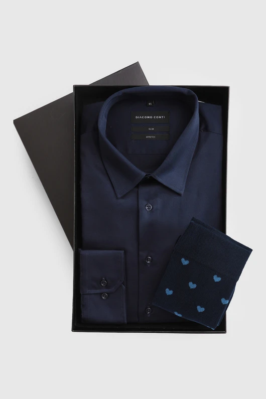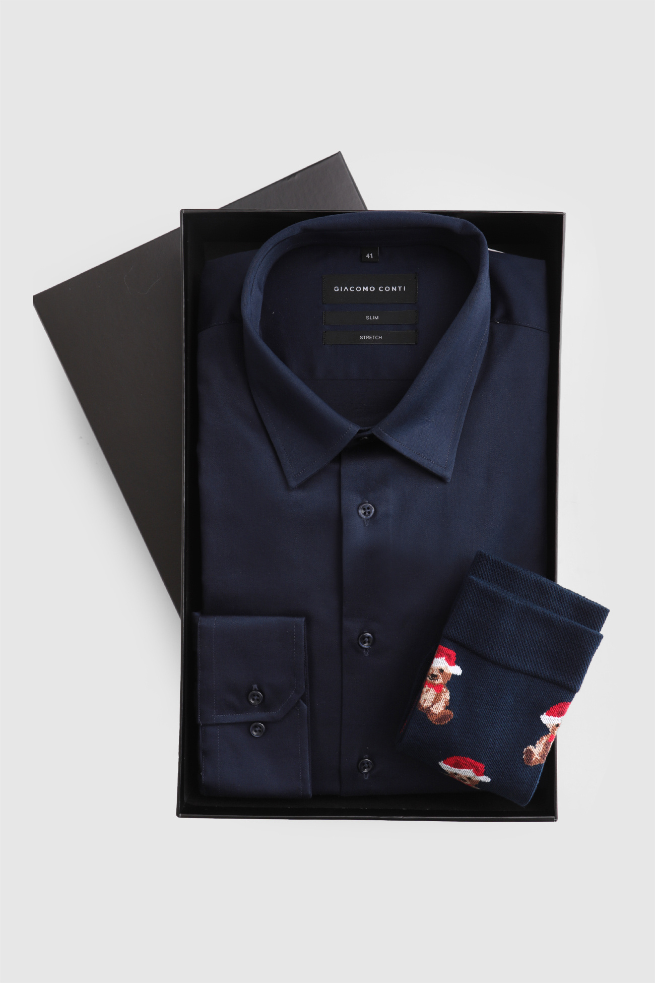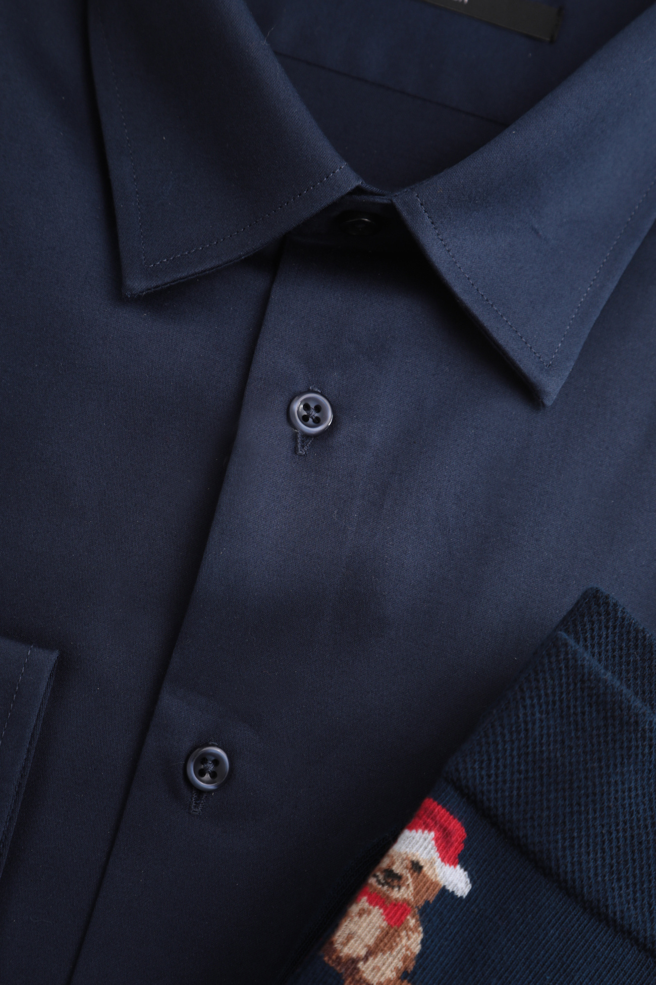 Elegancki wygląd – granatowa koszula w klasycznym stylu dodaje szyku każdej stylizacji.