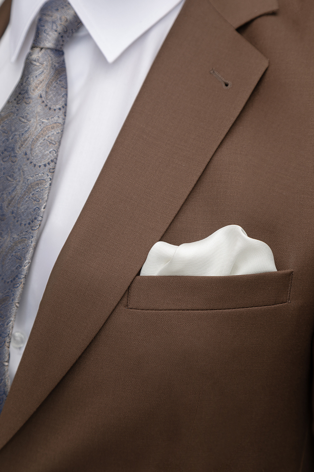 Głęboki, szlachetny odcień brązu stanowi stylową alternatywę dla klasycznych barw męskiej garderoby, dodając stylizacji charakteru i wyrazistości. Dopasowana linia garnituru podkreśla sylwetkę, a precyzyjne wykonanie detali – m.in. klapy w szpic, kieszenie z patkami czy elegancki układ zapięcia – wprowadza harmonijną równowagę między klasyką a nowoczesnością.