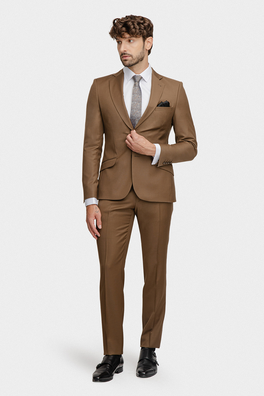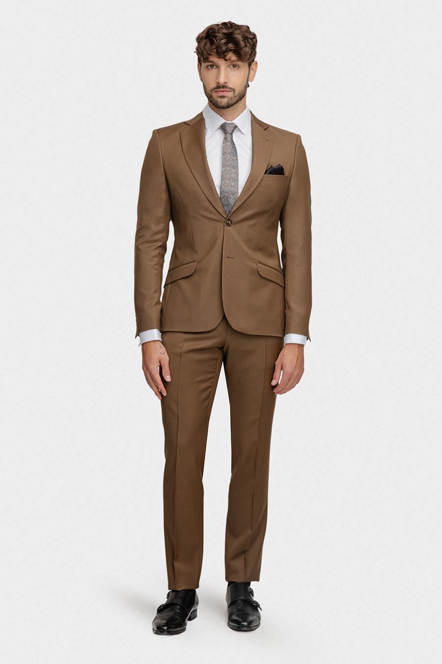 Szlachetny odcień brązu podkreśla indywidualny styl i stanowi doskonałą alternatywę dla klasycznych granatów czy szarości. Dopasowany krój akcentuje męską sylwetkę, a starannie skrojone detale – takie jak klapy w szpic, kieszenie z patkami i jednozapięciowy front – nadają całości wyrafinowanego charakteru.