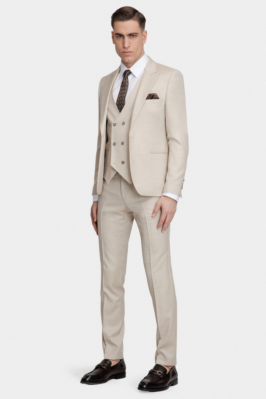 Garnitur CESARE 03113A15SSB to trzyczęściowy model w beżowym kolorze o kroju slim, łączący nowoczesną elegancję z luksusową tkaniną składającą się w z wełny