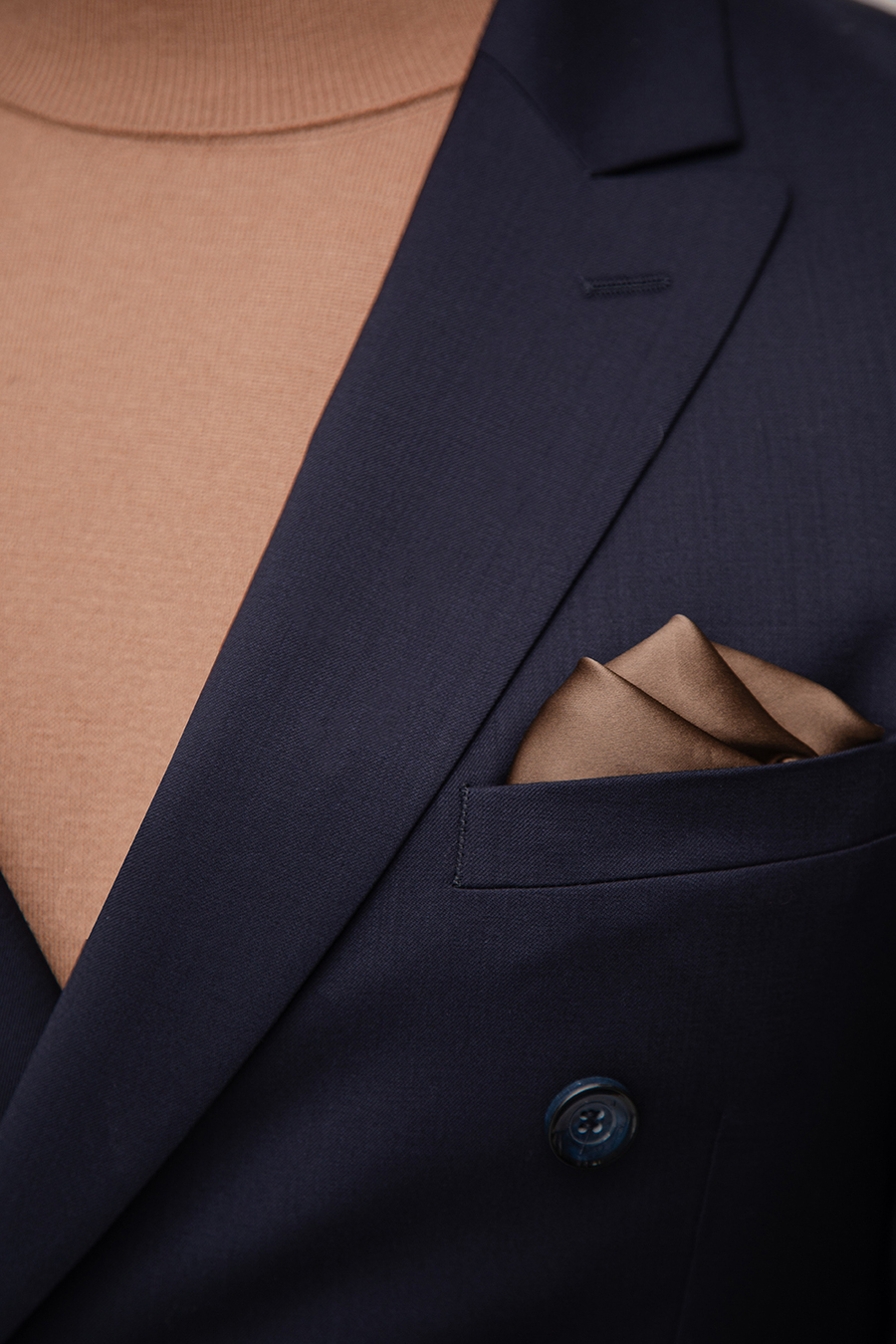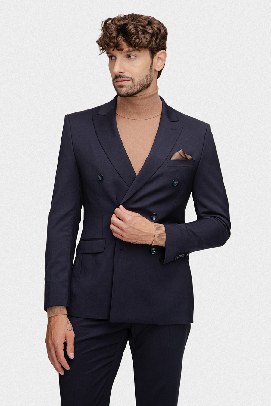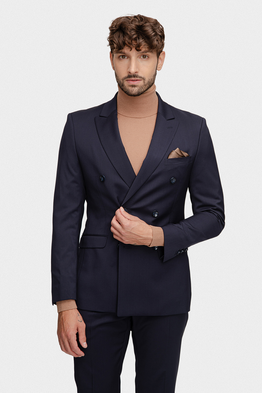 Marynarka w klasycznym granatowym kolorze o gładkim wykończeniu nadaje stylizacji ponadczasowej elegancji i wyrafinowanego charakteru. Dwurzędowe zapięcie oraz boczne kieszenie z patkami to detale, które harmonijnie łączą tradycyjny krój z nowoczesnym akcentem. Fason typu slim doskonale podkreśla sylwetkę, zapewniając elegancki i dopasowany wygląd. Dodatkowo, cięta brustasza umożliwia indywidualne wystylizowanie marynarki, na przykład z użyciem poszetki.