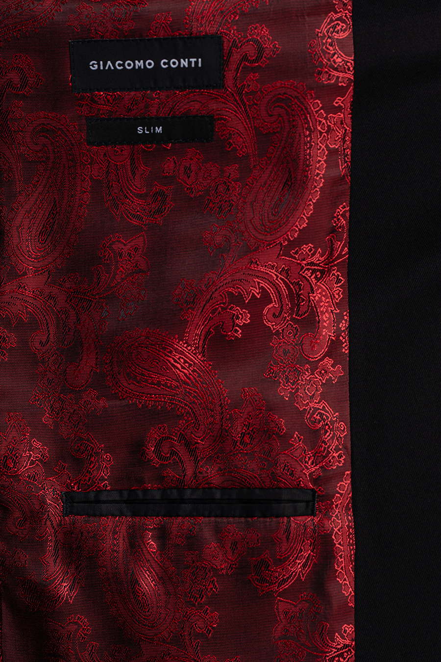 Czarna marynarka o gładkiej strukturze i dopasowanym kroju typu slim to klasyczny i ponadczasowy element męskiej garderoby, który doskonale sprawdzi się w eleganckich stylizacjach. Jej minimalistyczny charakter podkreślają jednorzędowe zapięcie na dwa guziki oraz prosto wszyte kieszenie z patkami, a wyjątkowego wyrazu dodaje kontrastowa, bogato zdobiona podszewka o intensywnym kolorze i oryginalnym wzorze – stylowy detal, który wprowadza nutę zaskoczenia.