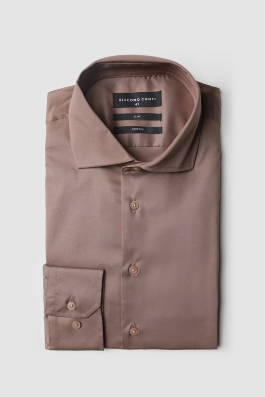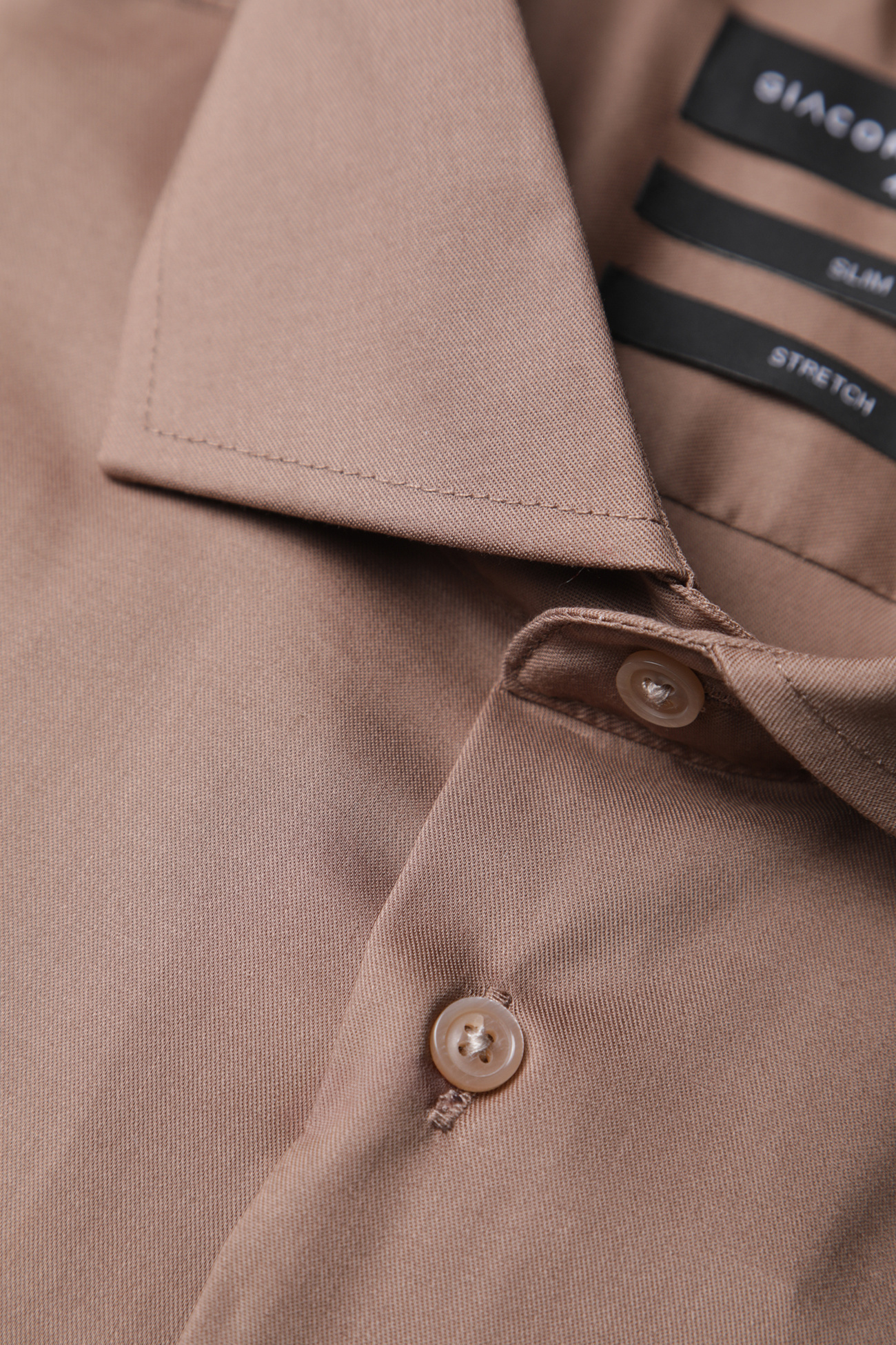 Koszula w jasnym odcieniu brązu z gładkim wzorem. Długi rękaw koszuli zakończony mankietem na klasyczny guzik. Guziki w odcieniu brązowym, o wysokim połysku. Codzienny kołnierz kent pozwoli na zestawienie koszuli z krawatem, jednakże nic nie stoi na przeszkodzie aby użytkować ją bez dodatków. Dopasowany krój podkreśla atuty sylwetki.