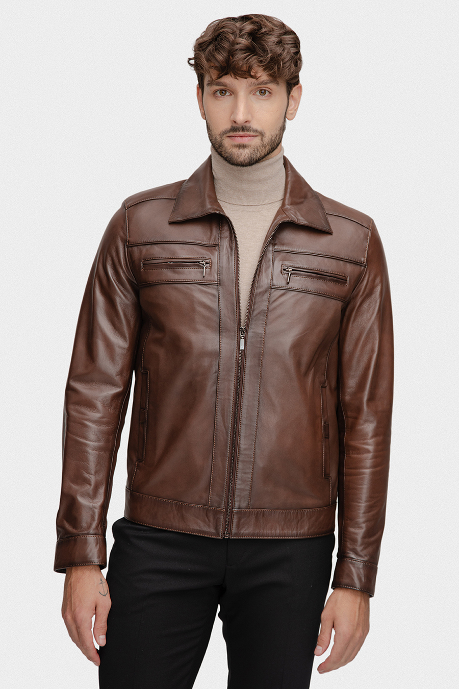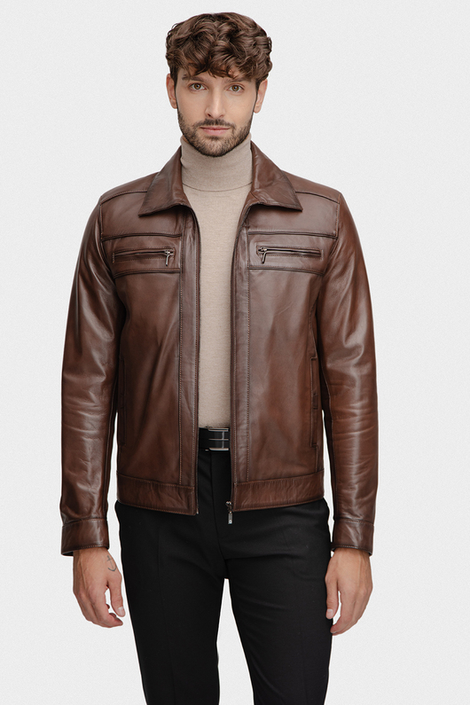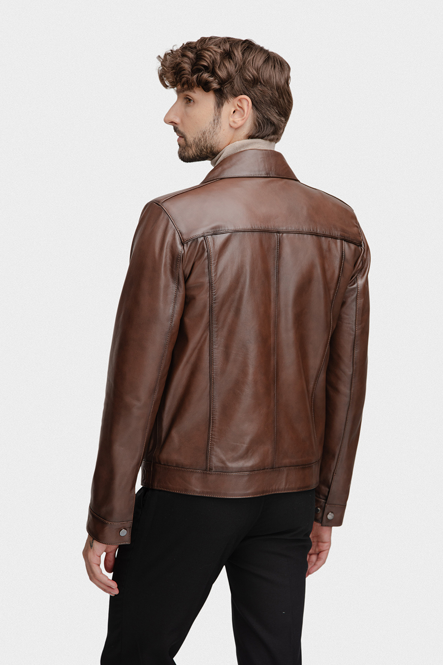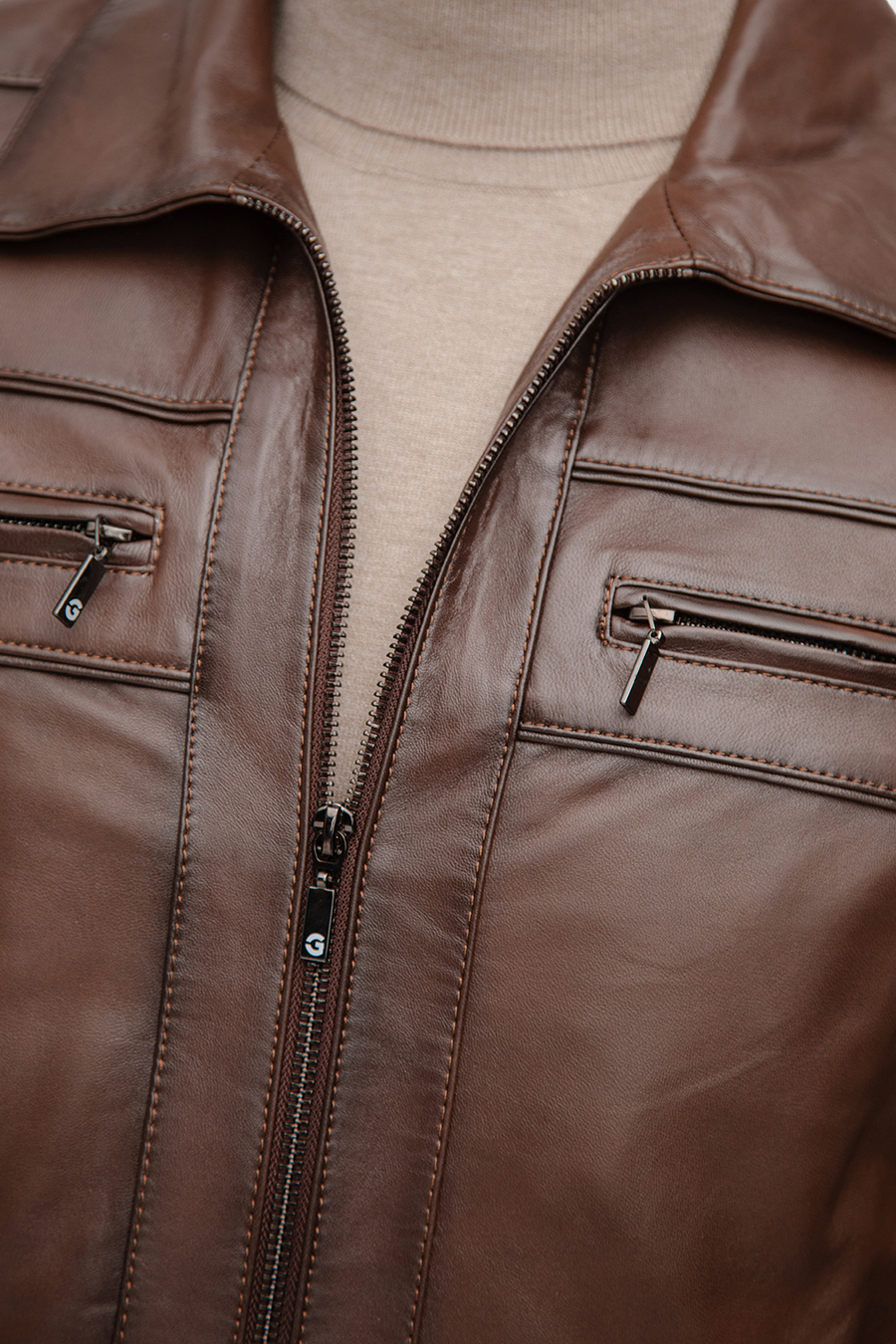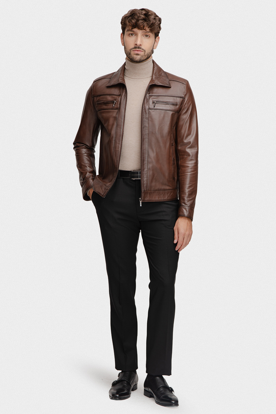 Ciemnobrązowy odcień skóry podkreśla elegancję modelu, nadając mu wyrafinowany, nieco bardziej klasyczny charakter. Kolor ten doskonale wpisuje się w męską paletę barw, świetnie komponując się zarówno z formalnymi zestawami, jak i z bardziej swobodnymi stylizacjami. Dopasowany fason subtelnie akcentuje sylwetkę, a minimalistyczne detale i funkcjonalne rozwiązania świadczą o wysokim poziomie krawieckiego kunsztu.