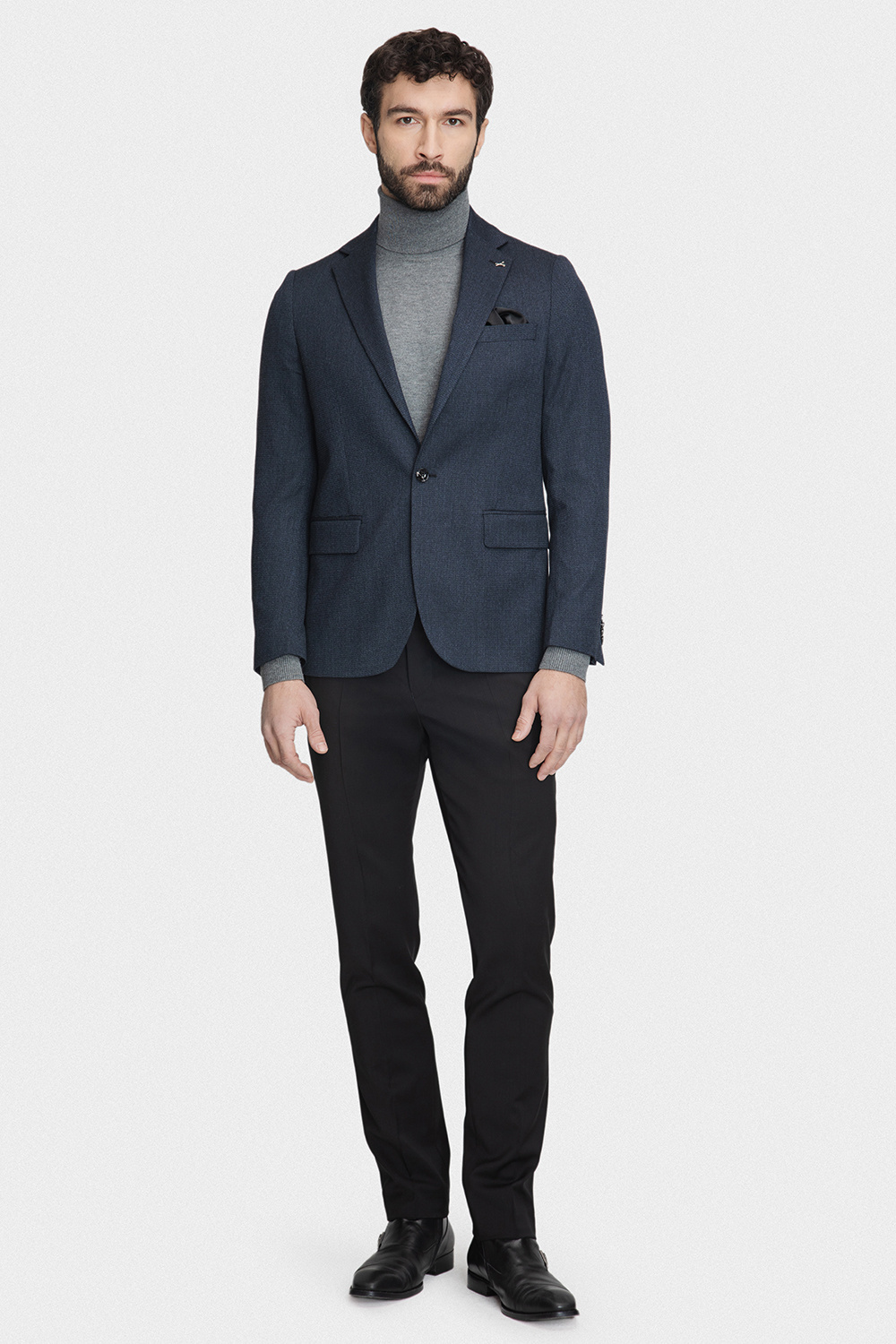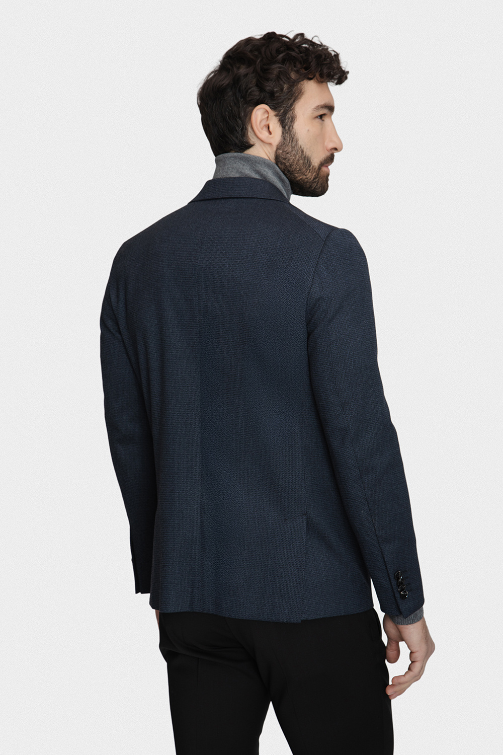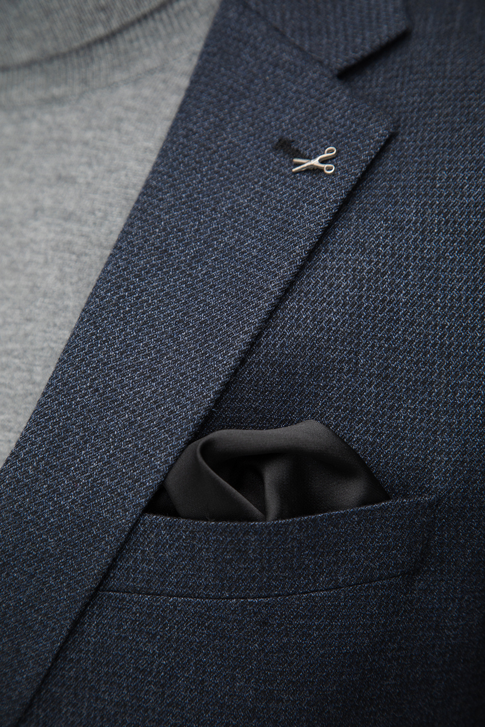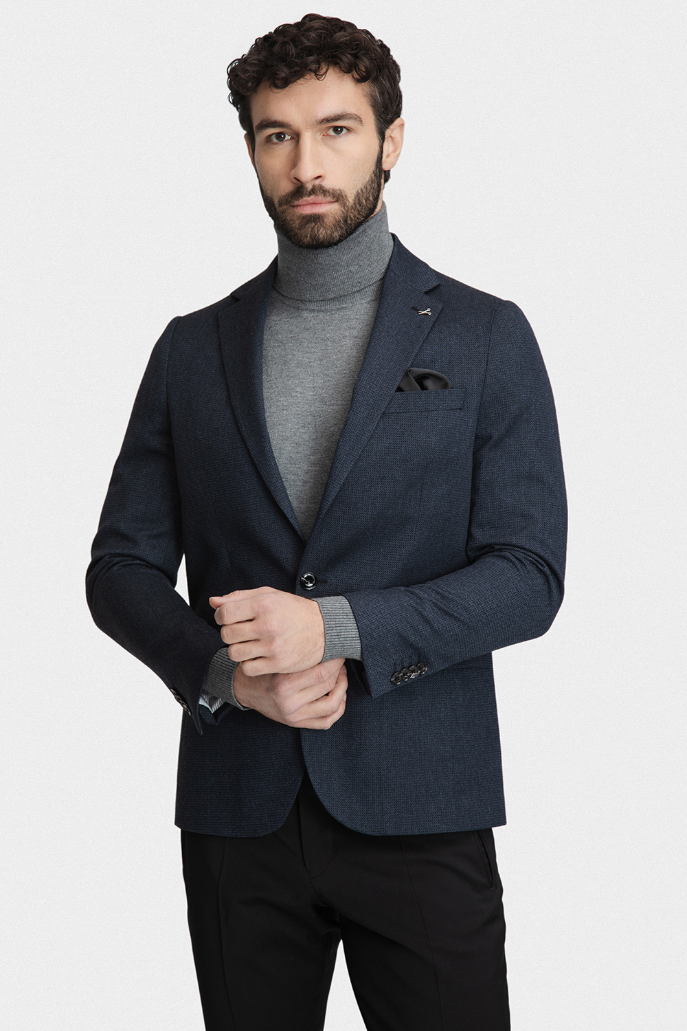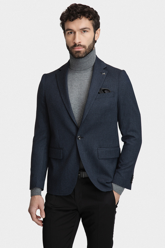Marynarka utrzymana jest w klasycznym granatowym kolorze z delikatną strukturą, która dodaje całości elegancji i głębi. Jednorzędowa konstrukcja, zapinana na pojedynczy guzik, prezentuje się stylowo i uniwersalnie, a fason comfort zapewnia swobodę ruchów i wysoki komfort użytkowania przez cały dzień.