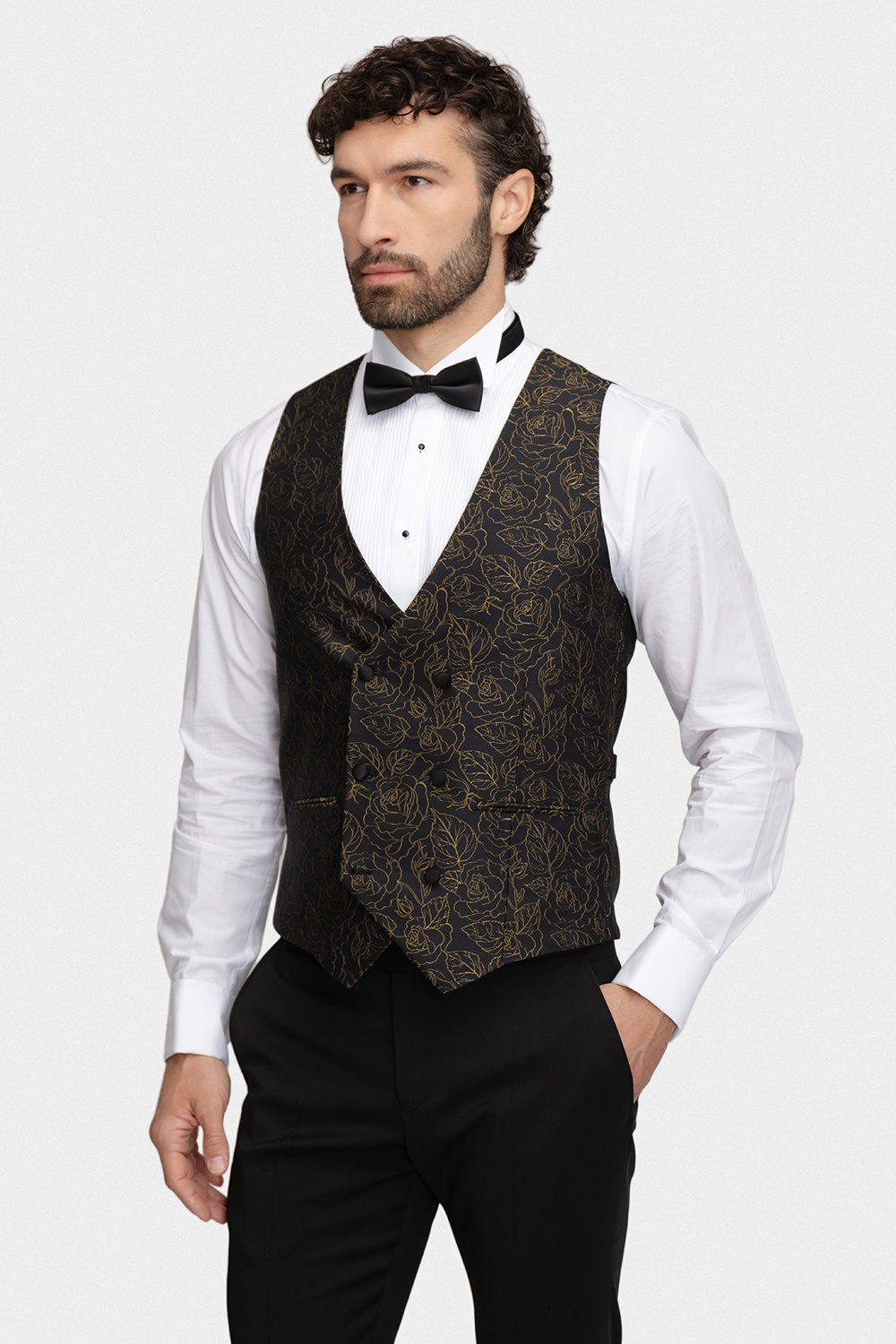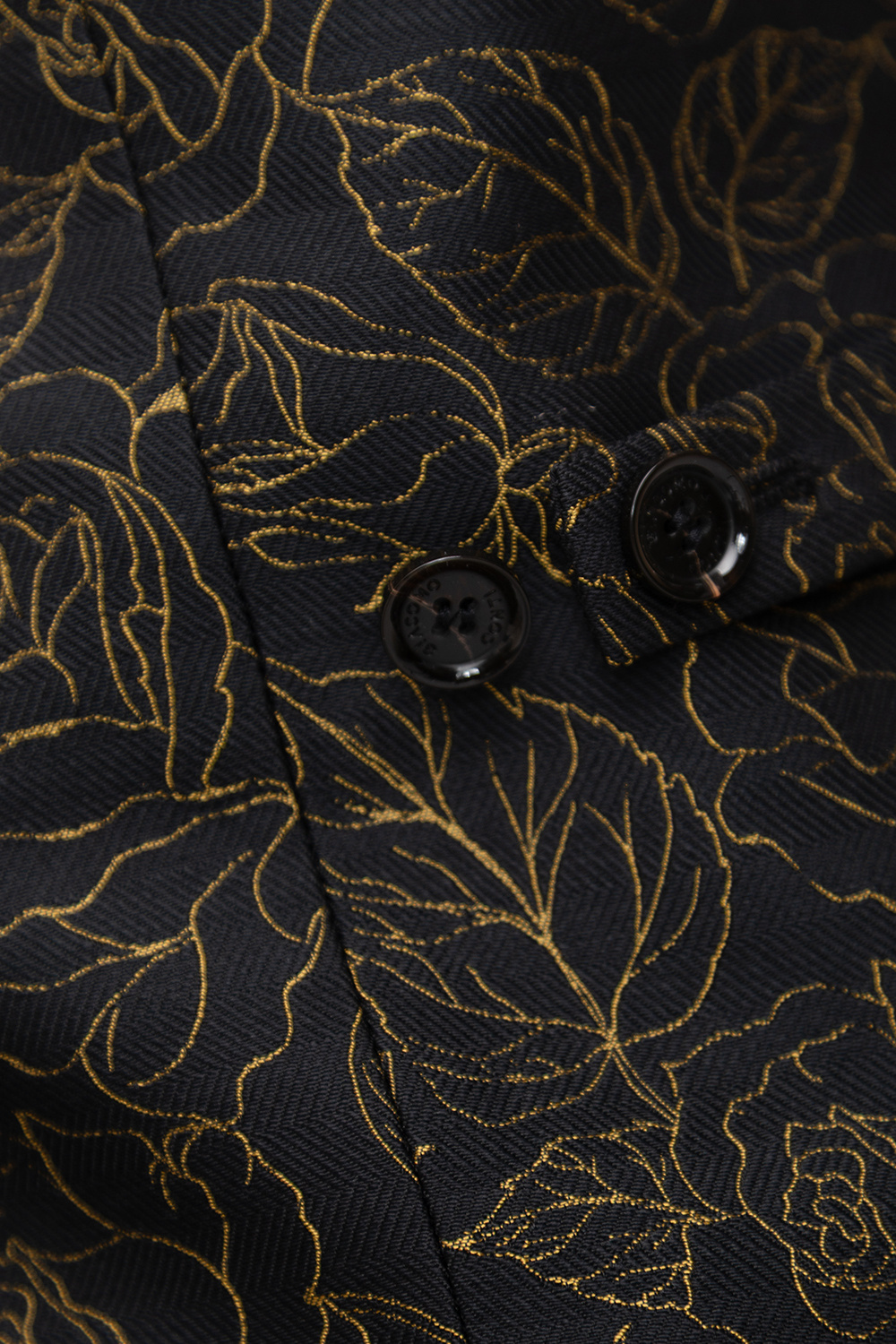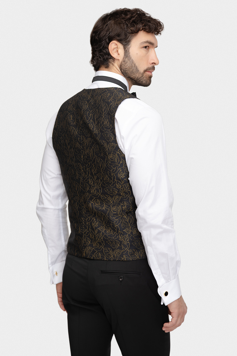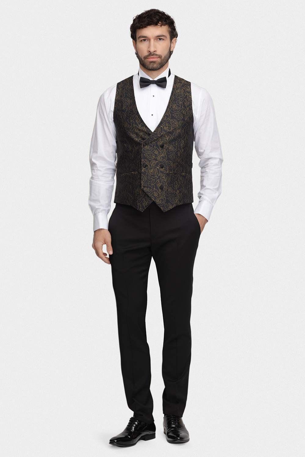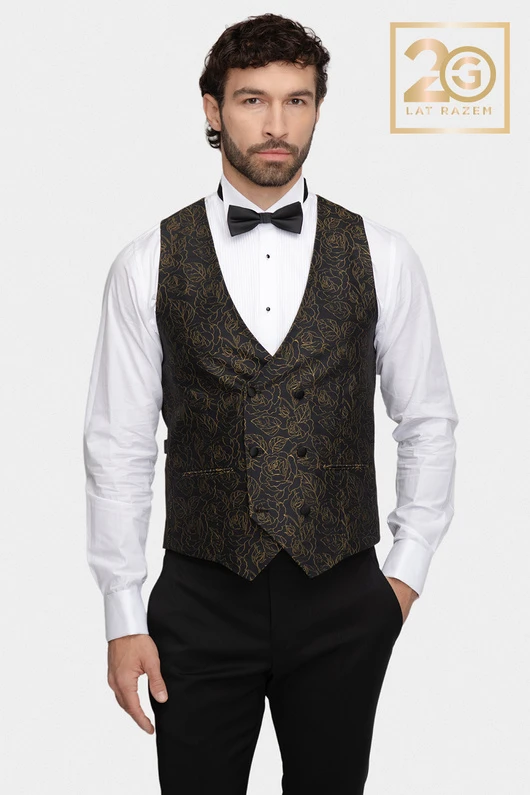 Model ten harmonijnie łączy ponadczasowy styl z nowoczesnym designem. Złoty, żakardowy wzór doskonale komponuje się z głęboką czernią tkaniny, nadając kamizelce wyrafinowanego charakteru i subtelnego blasku. To propozycja dla mężczyzn, którzy chcą wyróżnić się klasą, nie rezygnując z dobrego smaku.
