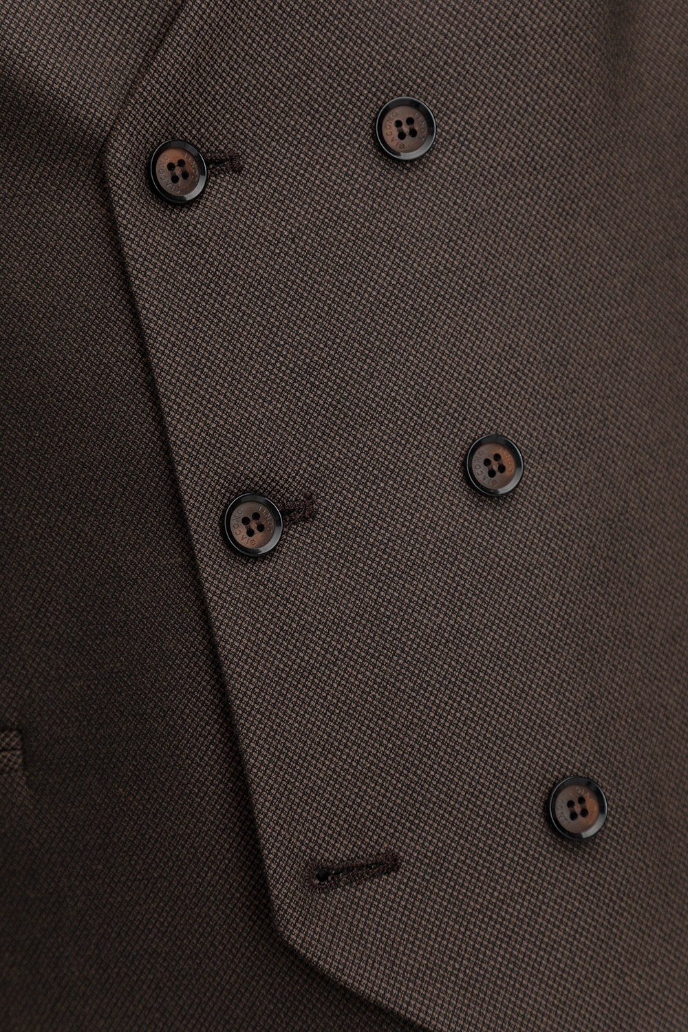 Kamizelka w chłodnym odcieniu brązu, o gładkiej strukturze i dopasowanym kroju typu slim, to połączenie klasyki z nowoczesnym wyrafinowaniem. Jej dwurzędowe zapięcie nadaje całości elegancki, formalny charakter, podkreślając wyjątkowy styl tego modelu.