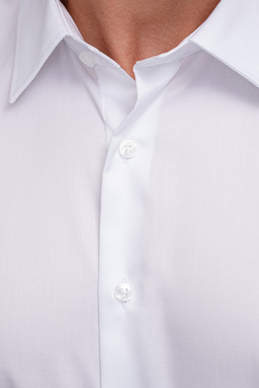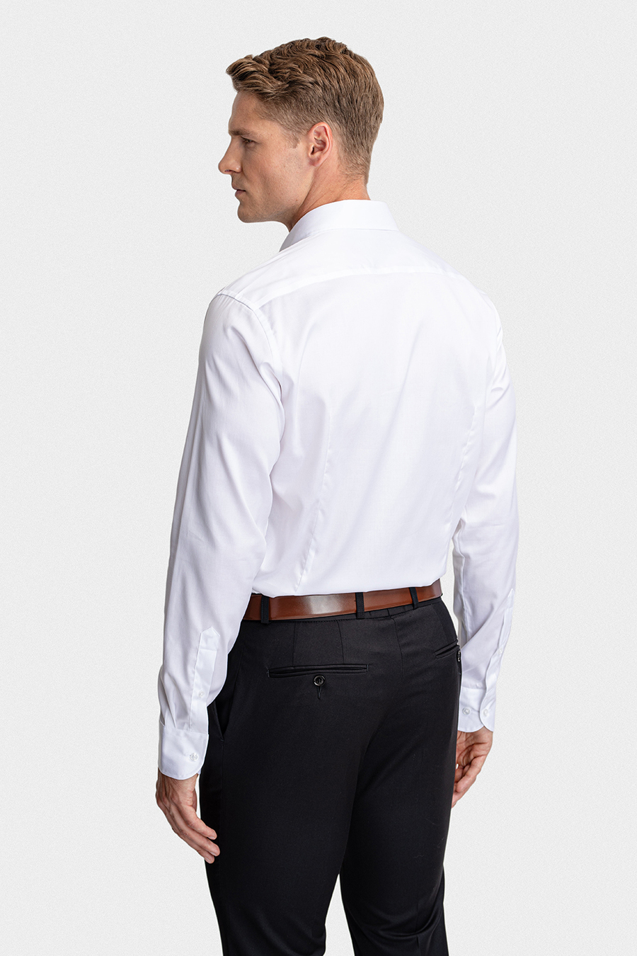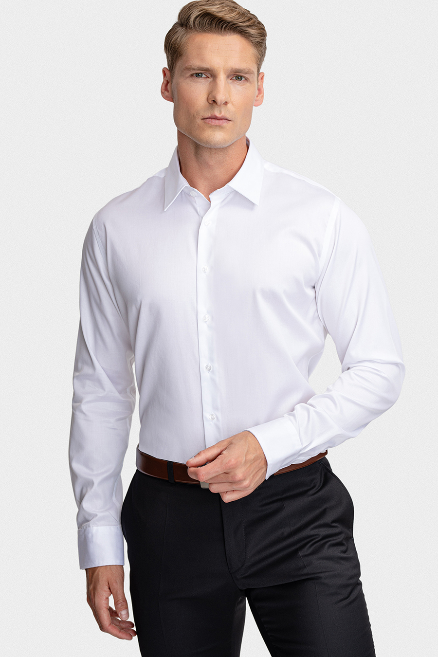 Gładki materiał oraz dopasowany fason typu slim podkreślają elegancki i schludny wygląd koszuli. Zakryta plisa, długi rękaw zakończony mankietem na spinki oraz kołnierzyk łamany świadczą o wysokim stopniu formalności tego modelu. Tego typu koszulę należy łączyć wyłącznie z muchą, co dodatkowo podkreśla jej klasyczny, wieczorowy charakter.
