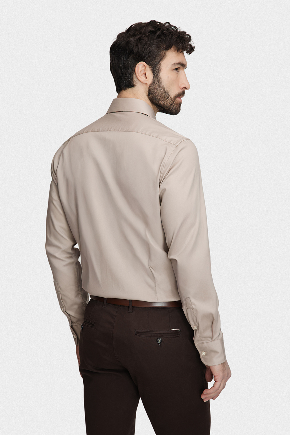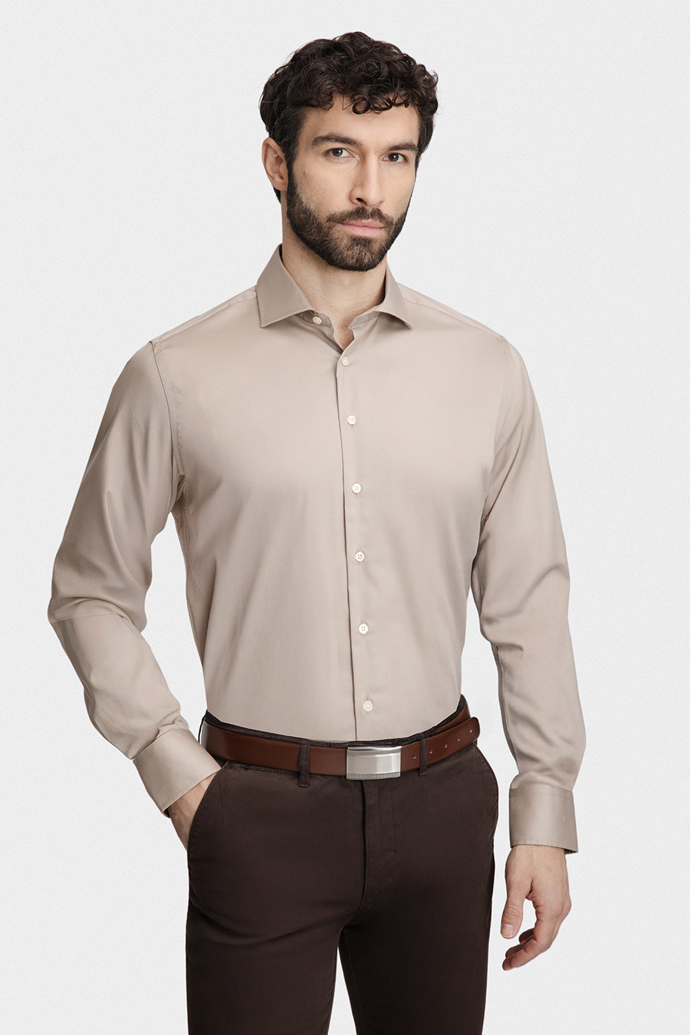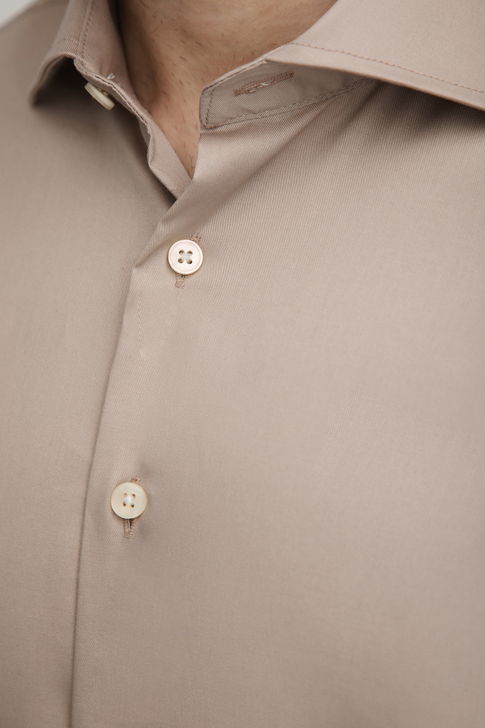 Koszula w jasnym odcieniu ecru z gładkim wzorem. Długi rękaw koszuli zakończony mankietem na klasyczny guzik. Guziki w odcieniu brązowym, o wysokim połysku. Codzienny kołnierz kent pozwoli na zestawienie koszuli z krawatem, jednakże nic nie stoi na przeszkodzie aby użytkować ją bez dodatków. Dopasowany krój podkreśla atuty sylwetki.