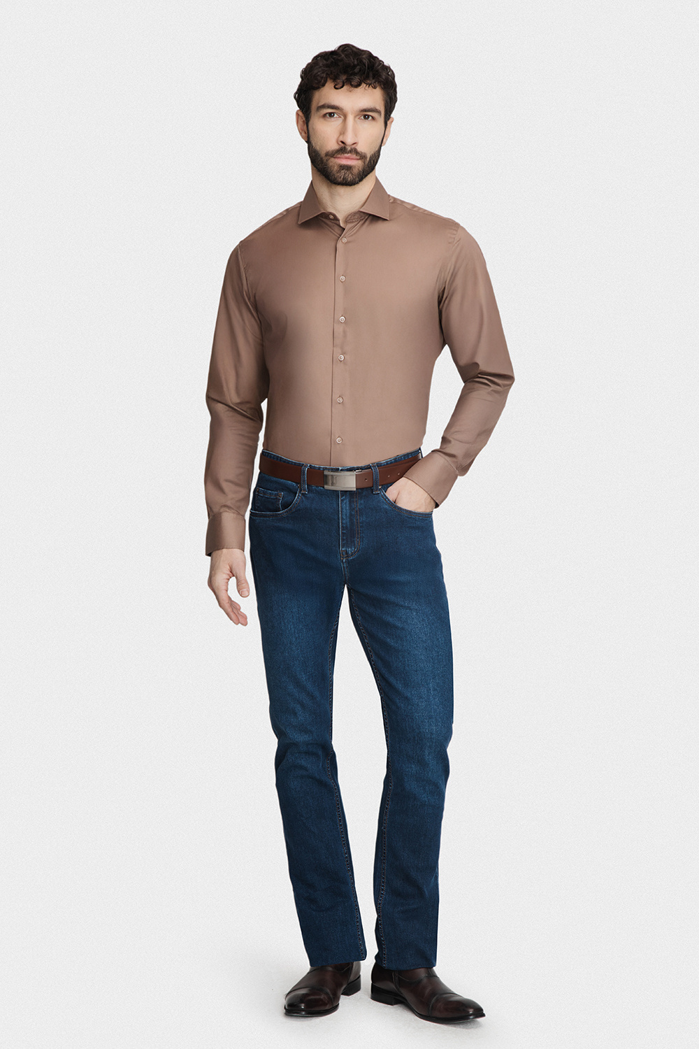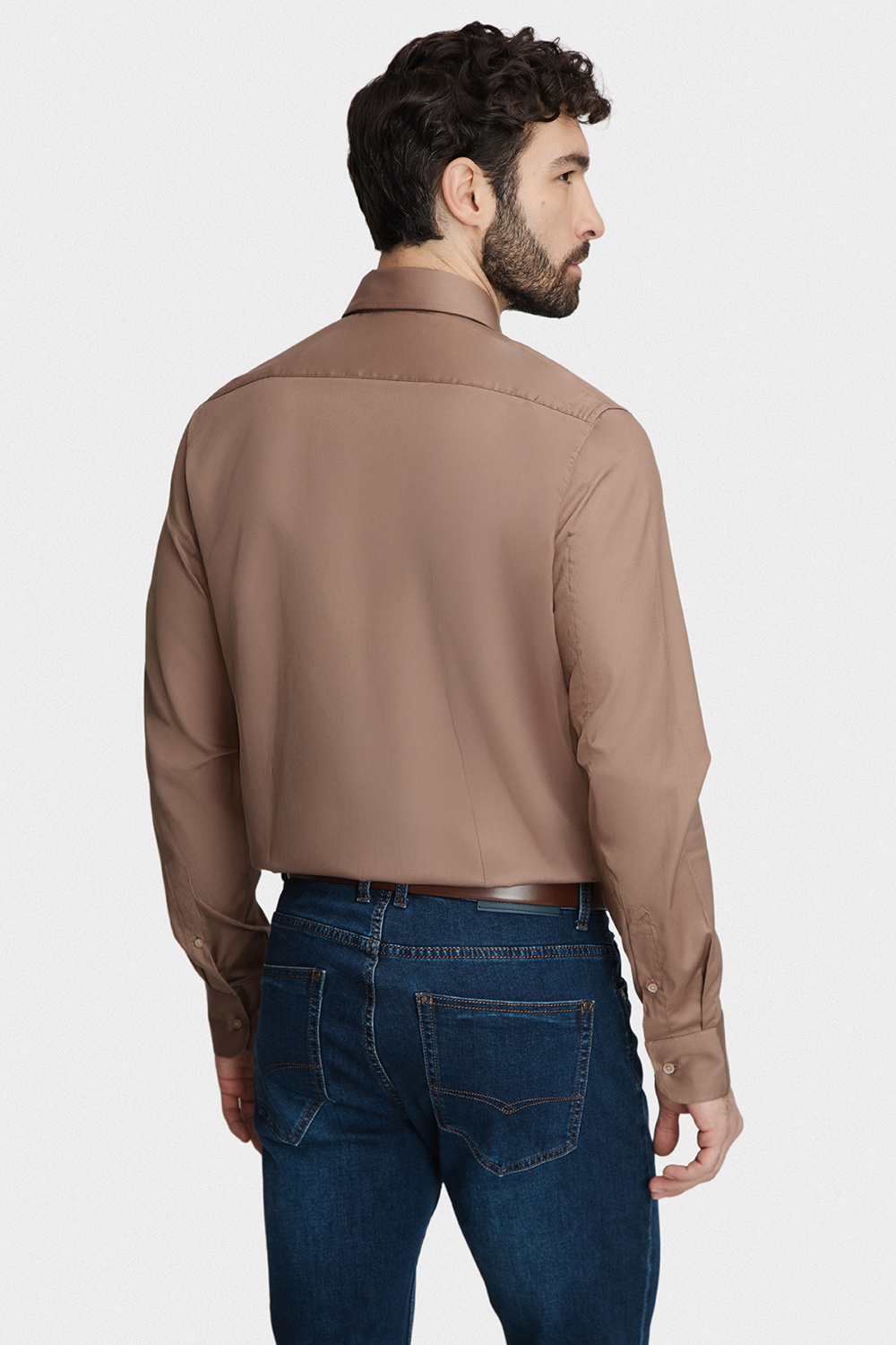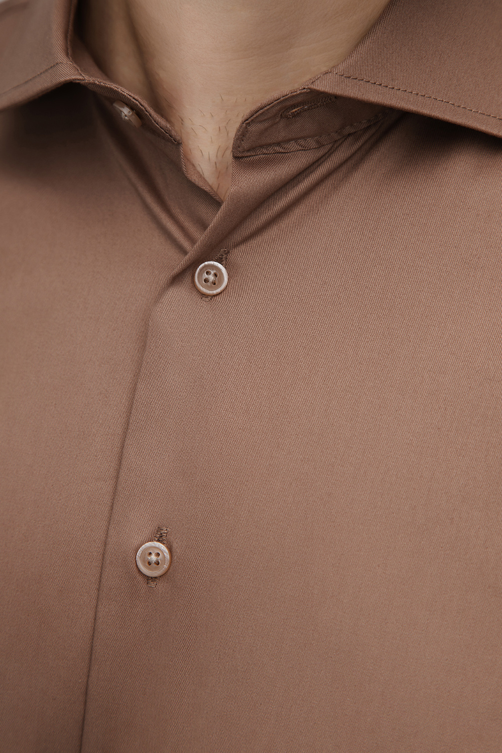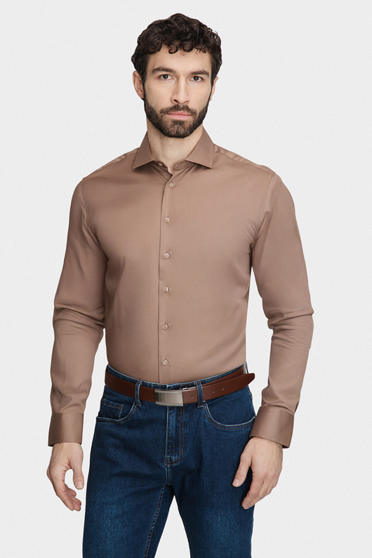 Gładka struktura materiału oraz neutralny, kremowo-beżowy ton sprawiają, że model ten wyróżnia się wyjątkową uniwersalnością — doskonale komponuje się zarówno z garniturem, jak i bardziej swobodnymi zestawami smart casual. Fason slim optycznie modeluje sylwetkę, podkreślając jej proporcje, a klasyczny kołnierzyk typu kent dodaje całości elegancji. Długie rękawy wykończone mankietami zapinanymi na guzik gwarantują wygodę i funkcjonalność w każdej sytuacji.