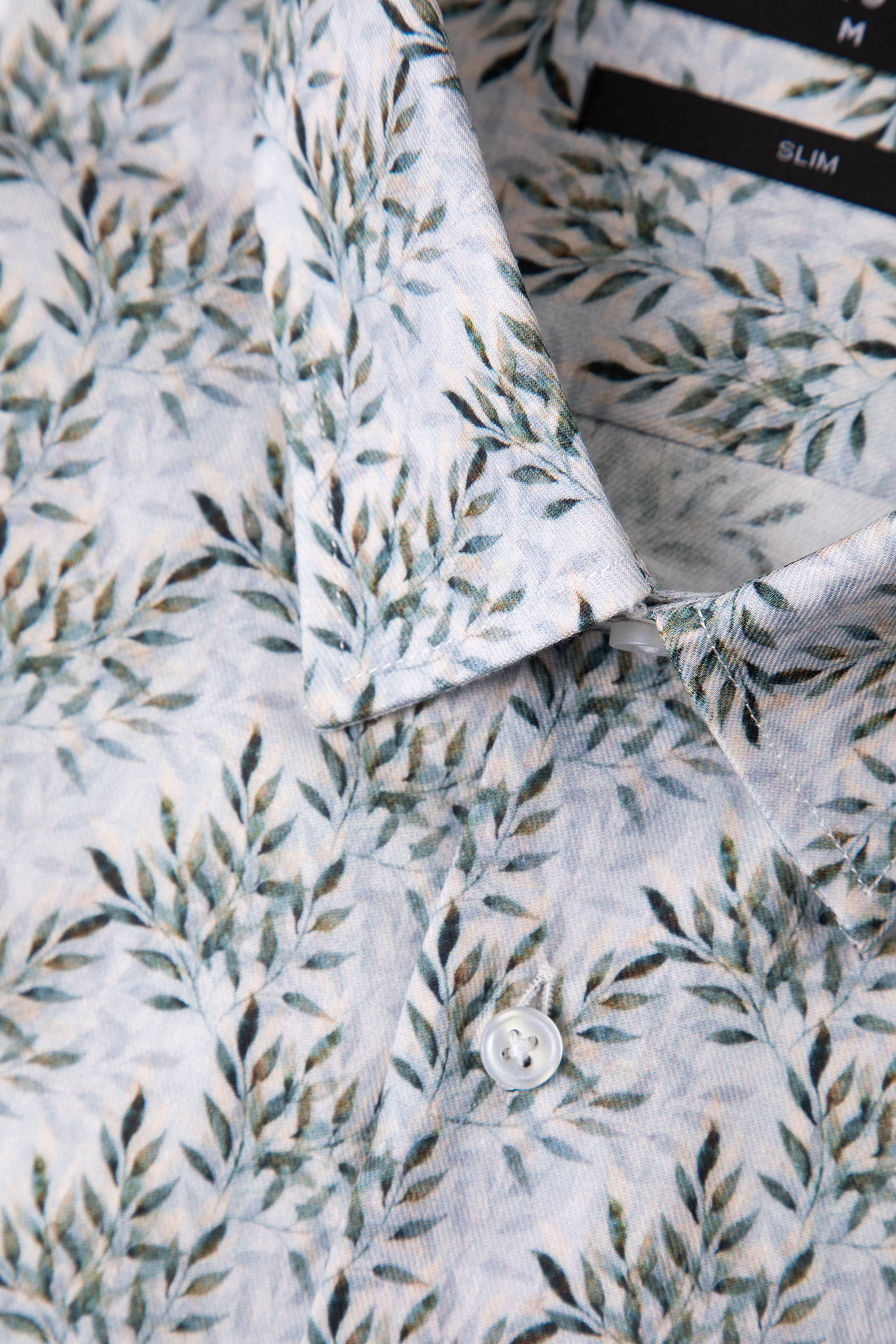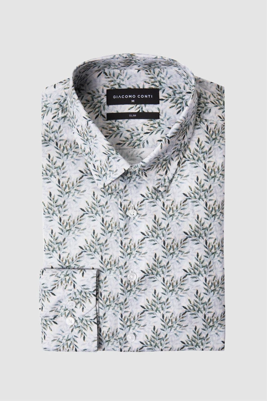 Szara tkanina została ozdobiona florystycznym wzorem, który nadaje koszuli nowoczesnego i świeżego charakteru, wyróżniając ją na tle klasycznych, gładkich modeli.