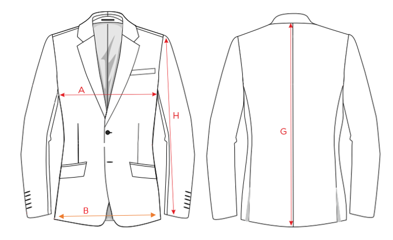 | ROZMIAR | WZROST | OBWÓD KLATKI PIERSIOWEJ | OBWÓD PASA | OBWÓD KLATKI PIERSIOWEJ "A" | DŁUGOŚĆ ŚRODKA TYŁU "G" | DŁUGOŚĆ RĘKAWA "H" | OBWÓD PASA "B" |