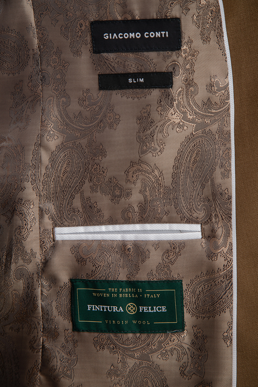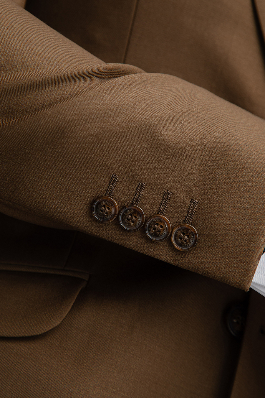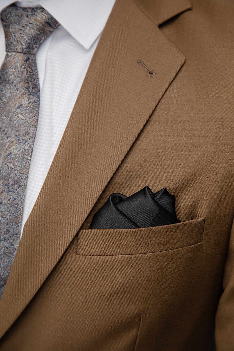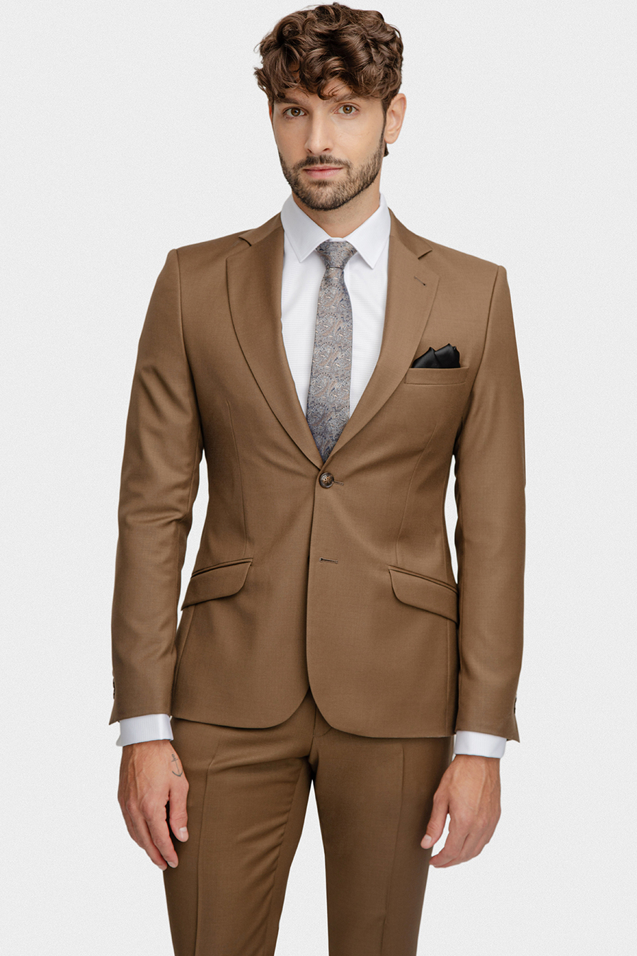 Szlachetny odcień brązu podkreśla indywidualny styl i stanowi doskonałą alternatywę dla klasycznych granatów czy szarości. Dopasowany krój akcentuje męską sylwetkę, a starannie skrojone detale – takie jak klapy w szpic, kieszenie z patkami i jednozapięciowy front – nadają całości wyrafinowanego charakteru.