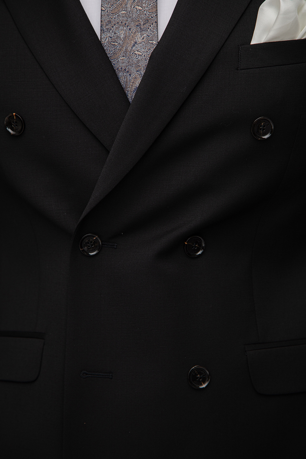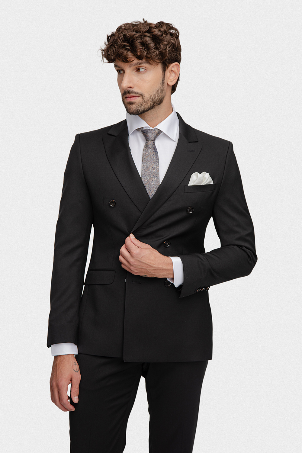 Klasyczna czerń w połączeniu z dwurzędowym zapięciem tworzy ponadczasowy, szykowny efekt. Boczne kieszenie z patkami oraz cięta brustasza dodają marynarce funkcjonalności, a jednocześnie podkreślają jej charakter premium. Dopasowany, smukły krój akcentuje męską sylwetkę, gwarantując elegancki, nowoczesny wygląd.