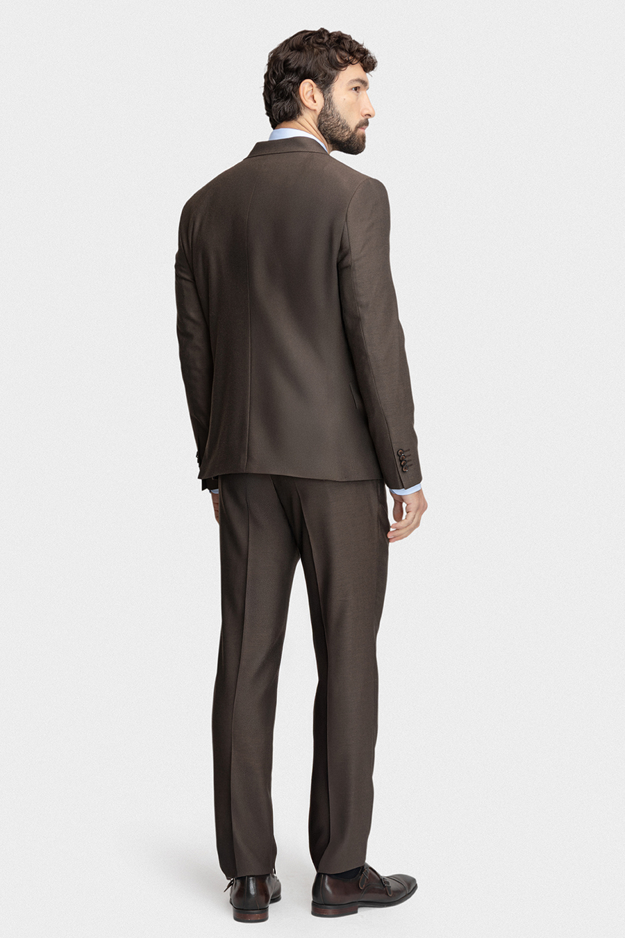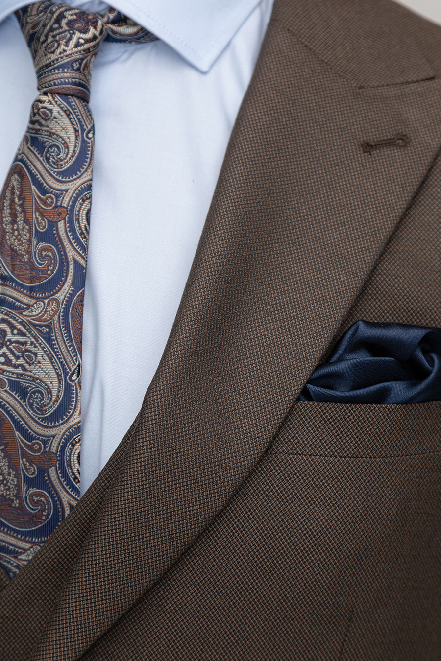 Marynarka w chłodnym odcieniu brązu o gładkiej strukturze i dopasowanym kroju typu slim to elegancki, a zarazem nowoczesny element męskiej garderoby. Jej minimalistyczny charakter podkreślają jednorzędowe zapięcie na dwa guziki oraz prosto wszyte kieszenie z patkami. Wyjątkowego wyrazu dodaje kontrastowa, bogato zdobiona podszewka o intensywnym kolorze i oryginalnym wzorze – stylowy detal, który wprowadza subtelną nutę indywidualizmu.