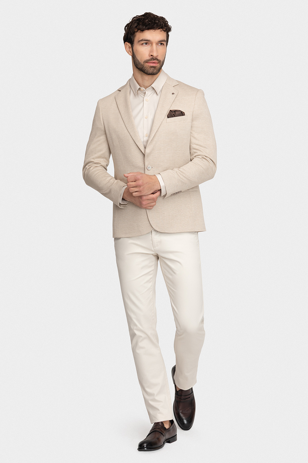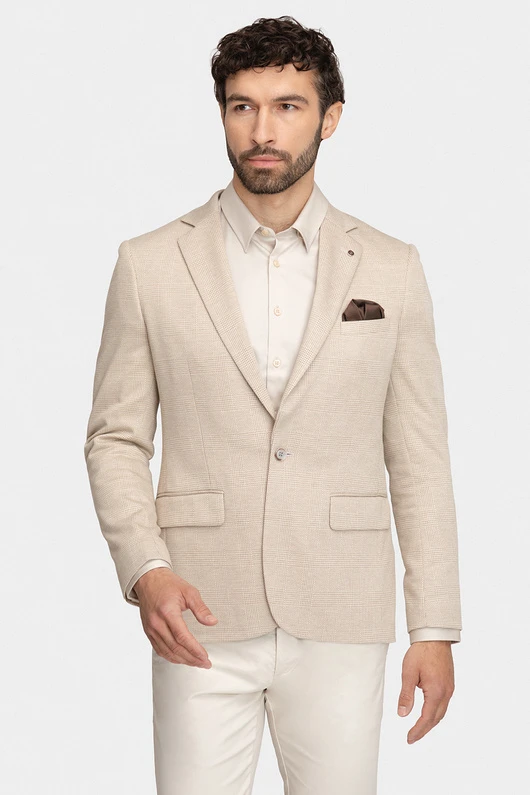 Model utrzymany jest w beżowej kolorystyce, wzbogaconej o subtelną kratę, która dodaje całości charakteru i ponadczasowego stylu. Fason typu comfort zapewnia wygodę i nieco luźniejsze dopasowanie, dzięki czemu marynarka świetnie sprawdzi się zarówno w codziennych, jak i bardziej dopracowanych stylizacjach. Możesz nosić ją casualowo, na przykład z T-shirtem i jeansami, lub zestawić z koszulą, tworząc bardziej elegancki look.