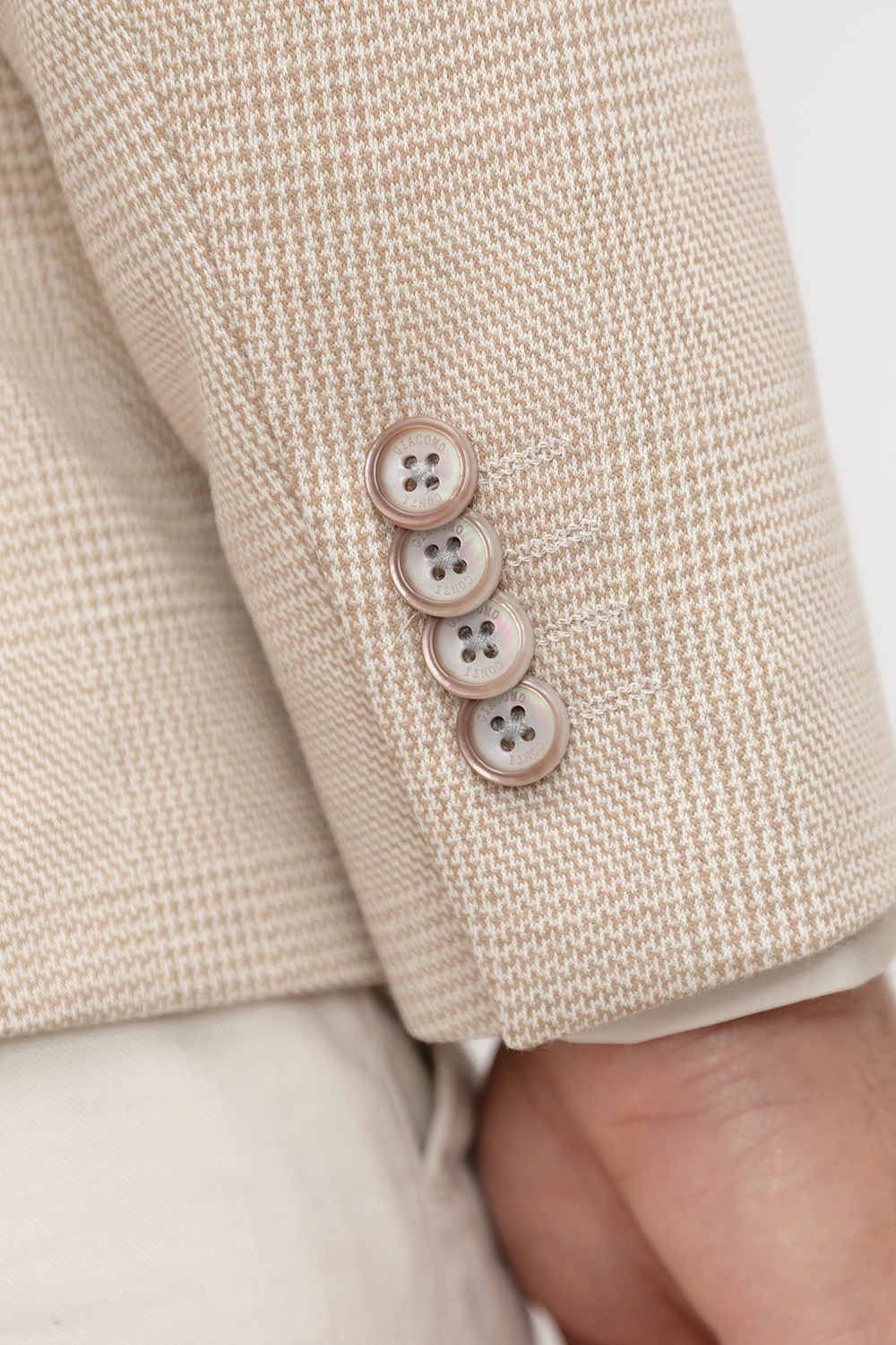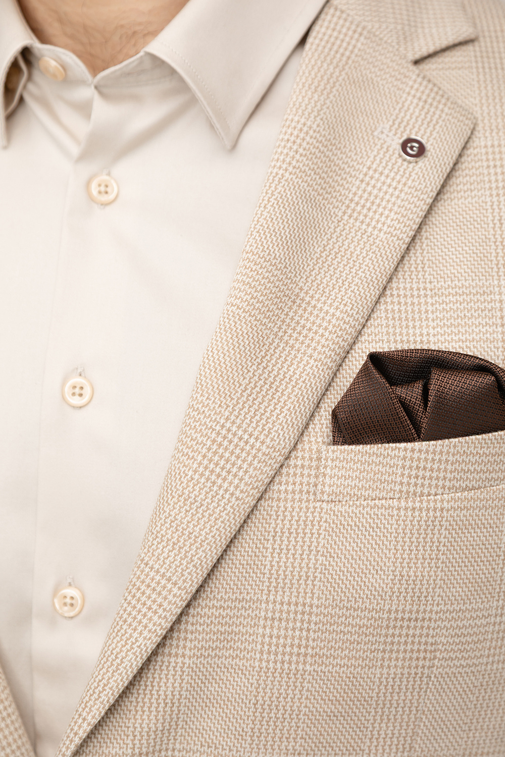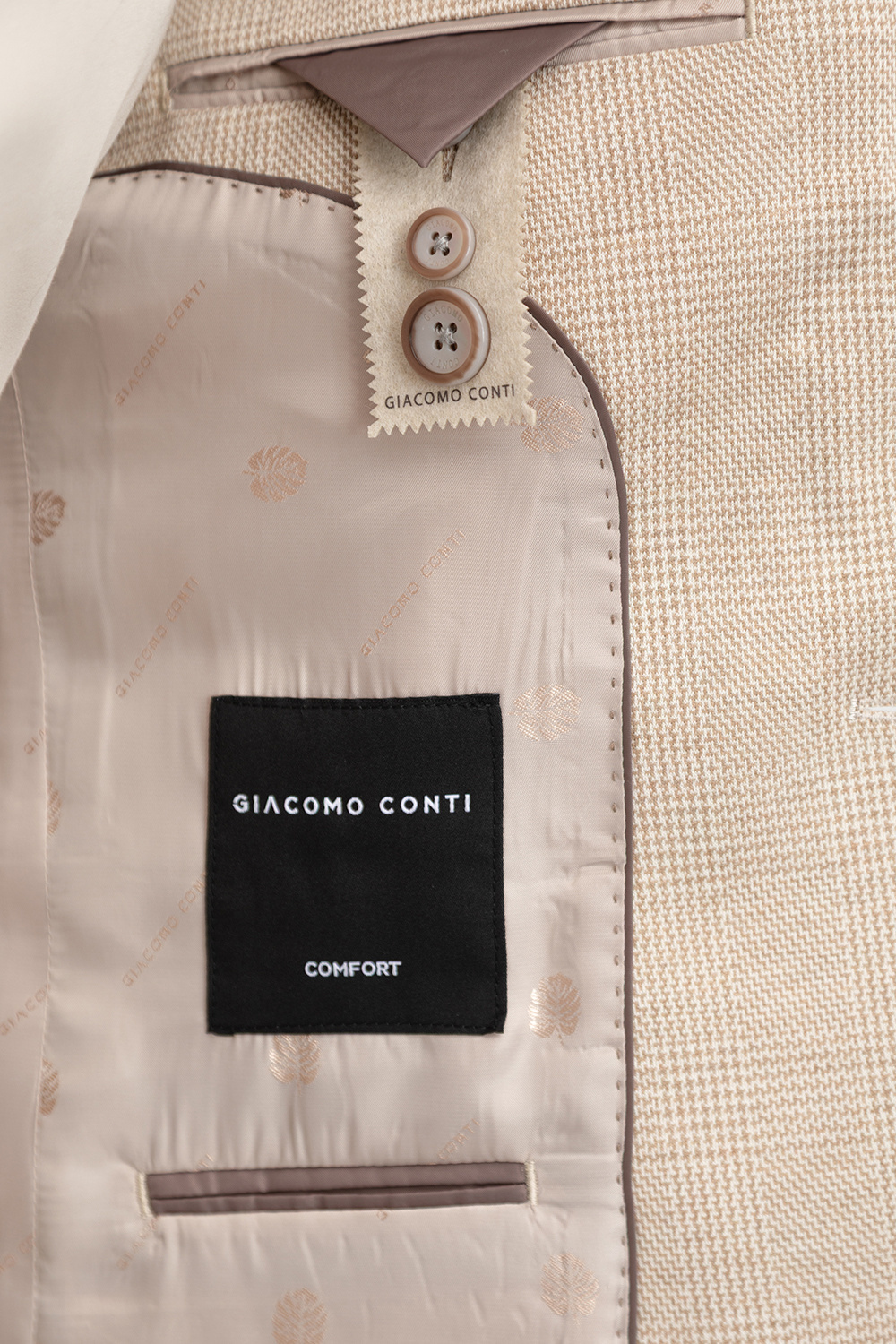 Marynarka posiada dwie kieszenie z patkami oraz klasyczną brustaszę, czyli miejsce na poszetkę, która pozwala podkreślić indywidualny charakter stylizacji. Wnętrze wykończono podszewką z mieszanki poliestru i wiskozy, ozdobioną subtelnym wzorem, który dodaje całości wyrafinowanego akcentu.
