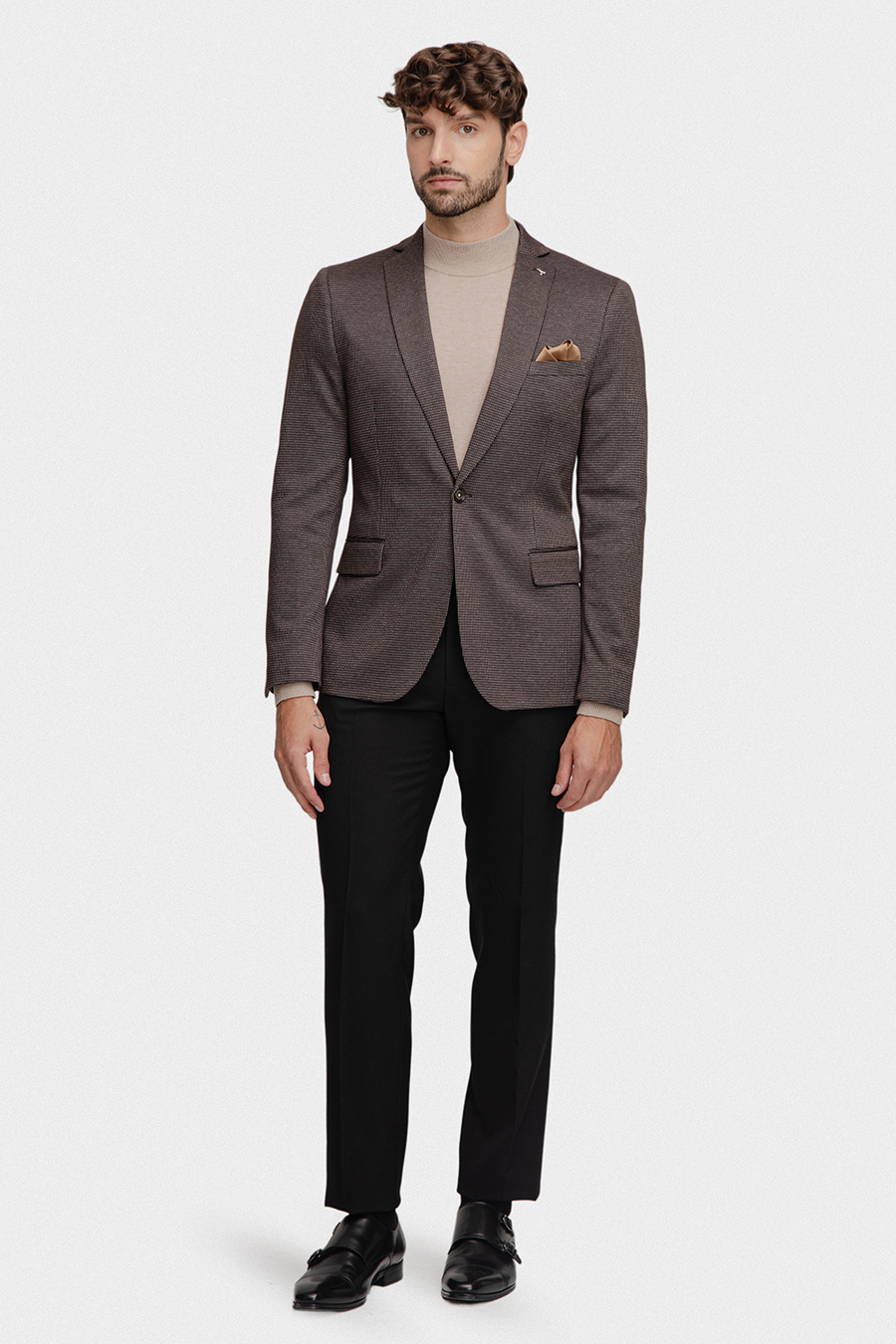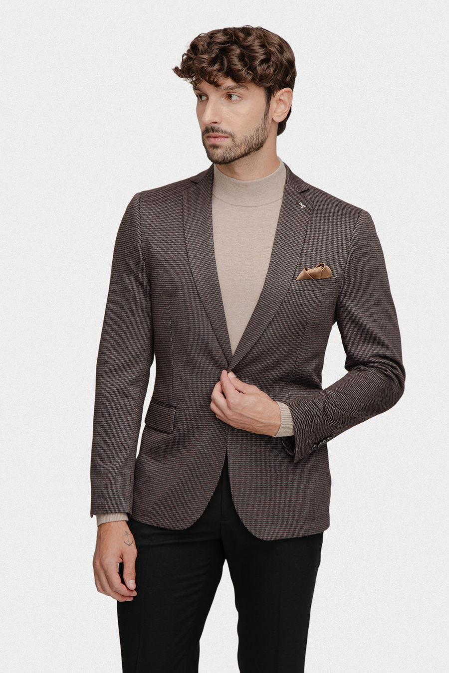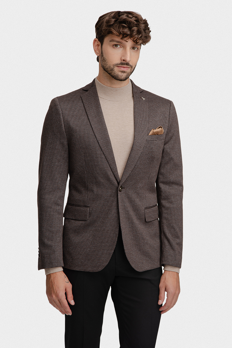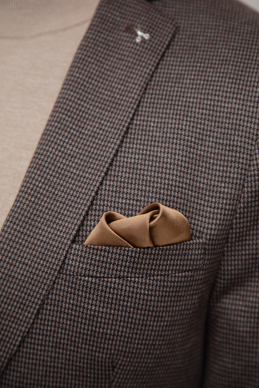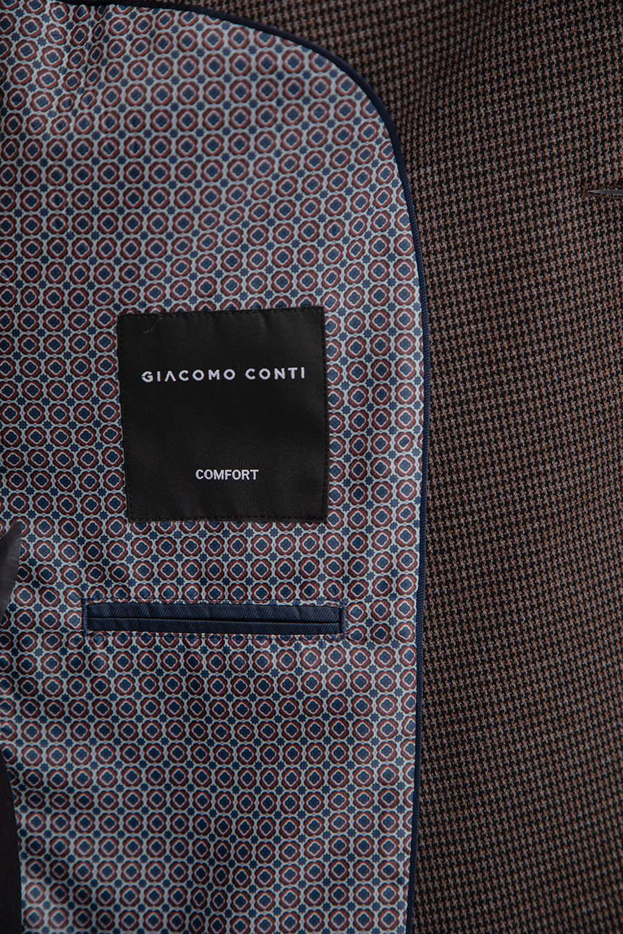 Marynarka jednorzędowa, zapinana na brązowy guzik, posiada dwie kieszenie z patkami. Subtelny wzór w pepitkę oraz stonowany kolor dodają całości elegancji i ponadczasowego charakteru. Fason typu comfort zapewnia swobodę ruchów i wygodę użytkowania. Wnętrze marynarki wykończono podszewką w elegancki brązowo-niebiesko-granatowy mikrowzór, który dodaje całości stylowego, nowoczesnego akcentu i sprawia, że model zyskuje oryginalny charakter.