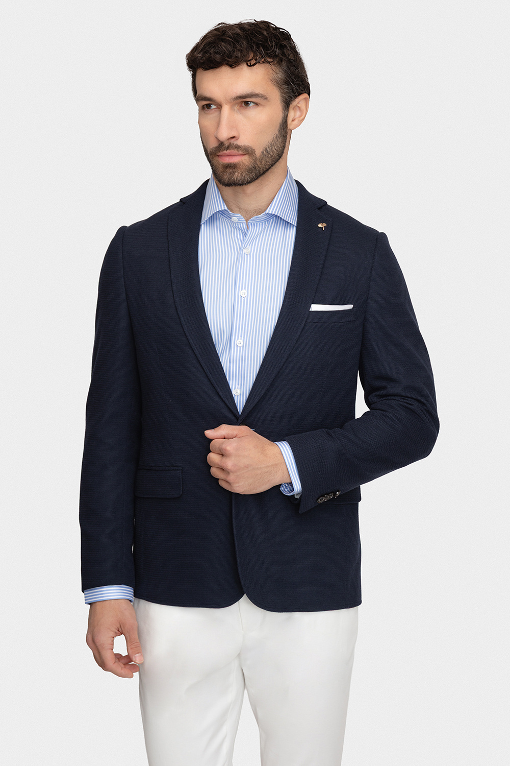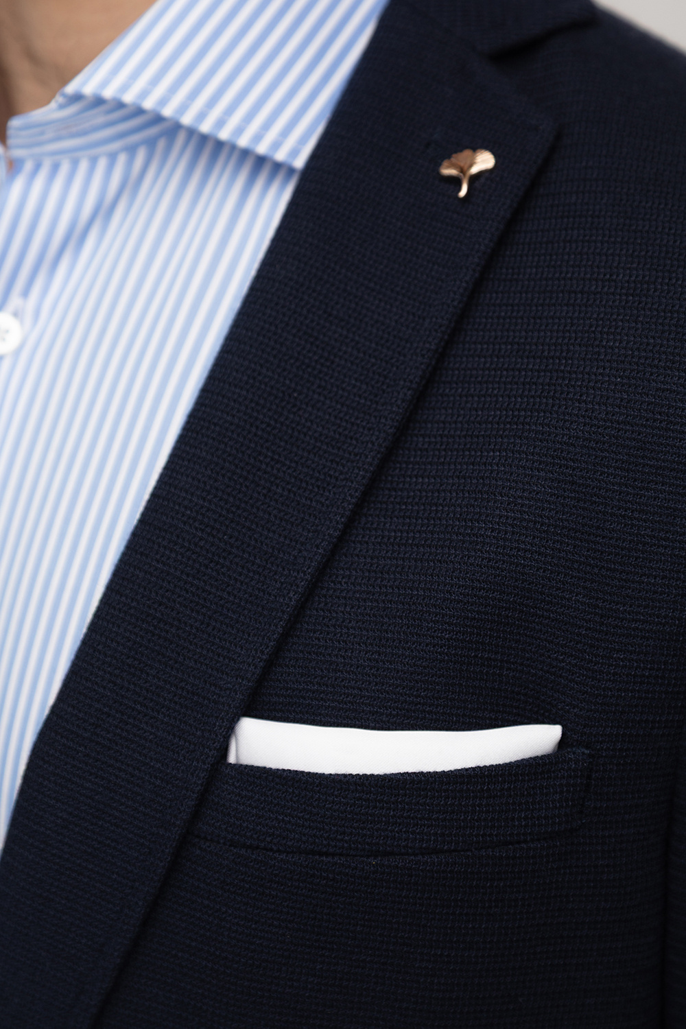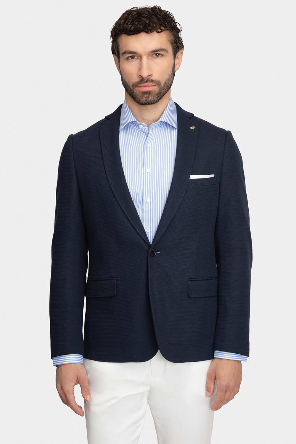 Jednorzędowa marynarka w granatowym odcieniu o subtelnej strukturze stanowi uniwersalny element garderoby, idealny zarówno do stylizacji formalnych, jak i smart casual. Model wyposażono w dwa szlice, które zwiększają swobodę ruchów, oraz kieszenie z patkami, łączące funkcjonalność z estetyką. Zapięcie na dwa guziki oraz fason typu comfort gwarantują wygodę.