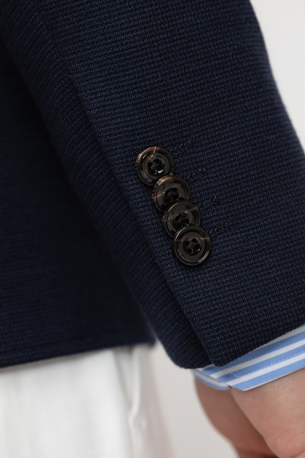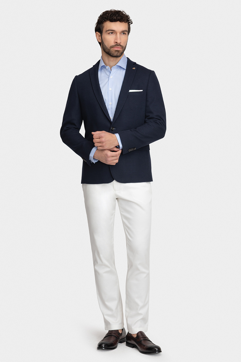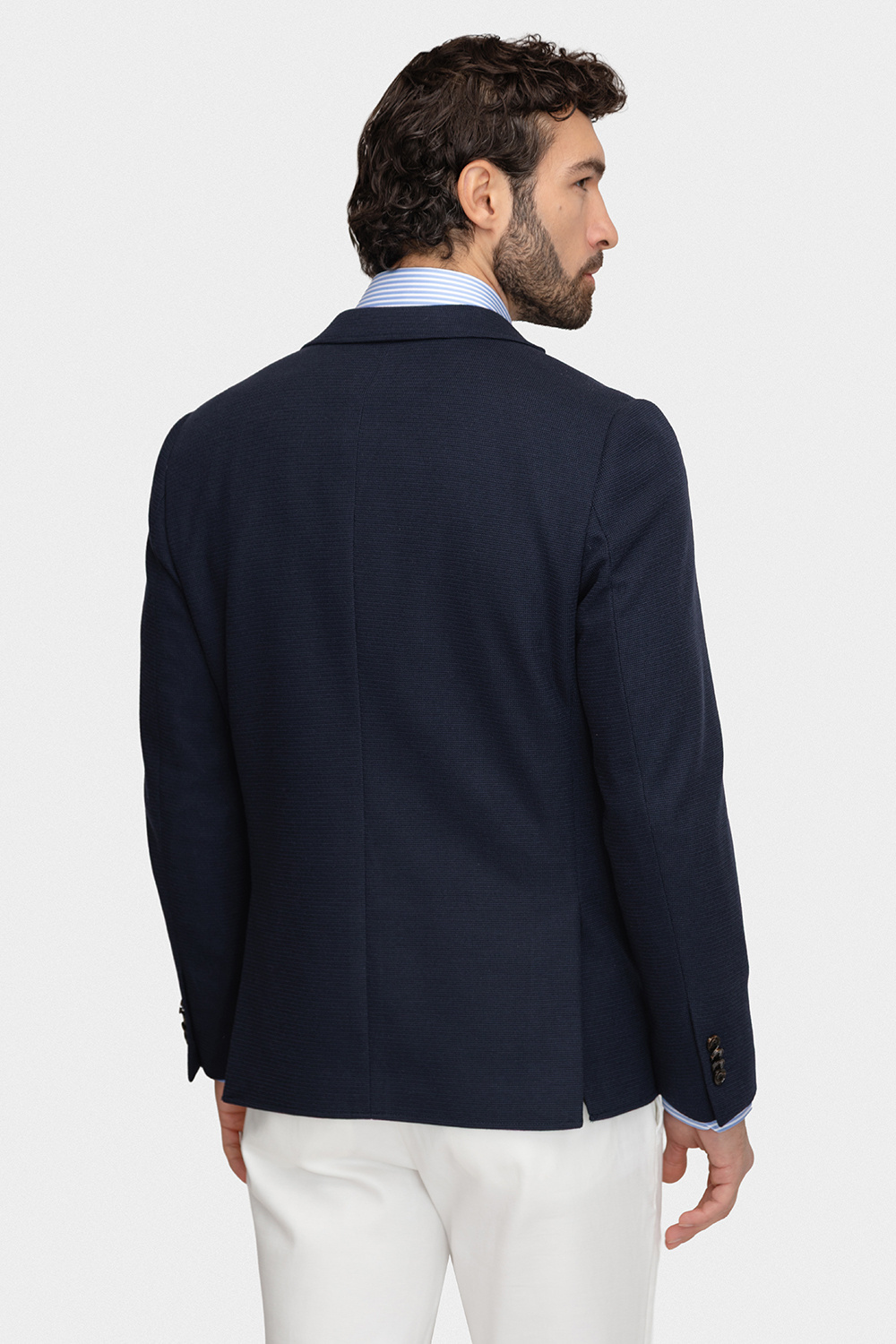 Jednorzędowa marynarka w granatowym odcieniu o subtelnej strukturze stanowi uniwersalny element garderoby, idealny zarówno do stylizacji formalnych, jak i smart casual. Model wyposażono w dwa szlice, które zwiększają swobodę ruchów, oraz kieszenie z patkami, łączące funkcjonalność z estetyką. Zapięcie na dwa guziki oraz fason typu comfort gwarantują wygodę.