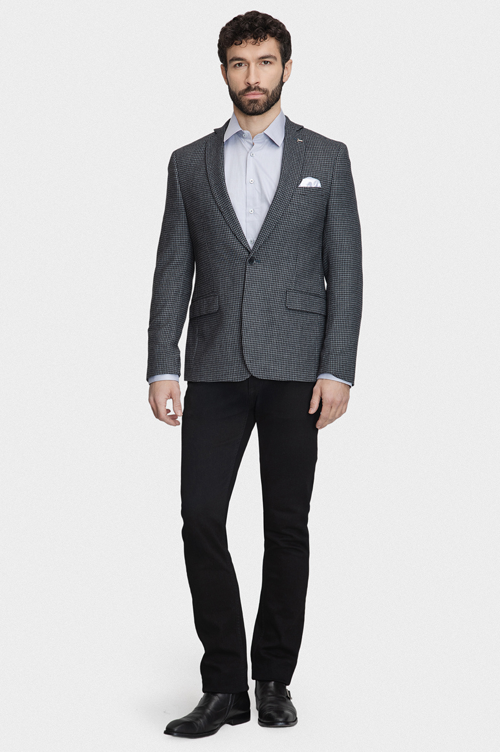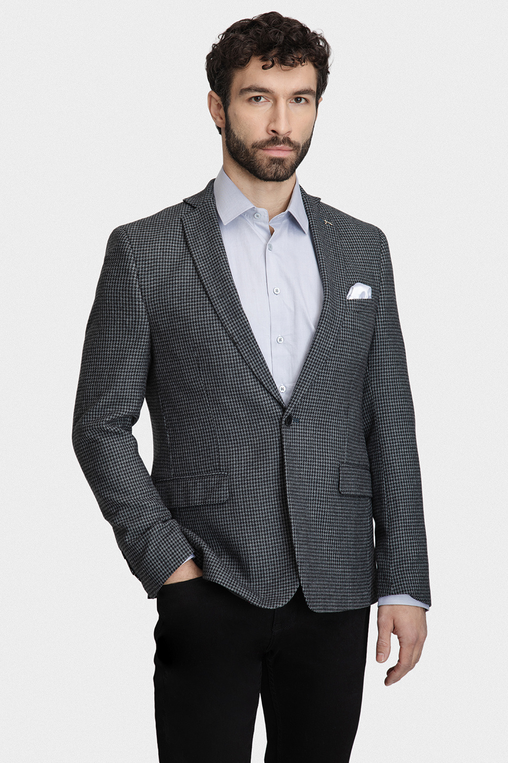 Jednorzędowa marynarka zapinana na jeden guzik posiada dwie praktyczne kieszenie z patkami. Subtelny wzór w pepitkę w połączeniu ze stonowaną kolorystyką nadaje całości ponadczasowego charakteru i wyrafinowanej elegancji. Fason typu comfort sprawia, że marynarka doskonale dopasowuje się do sylwetki, zapewniając wysoki komfort użytkowania.