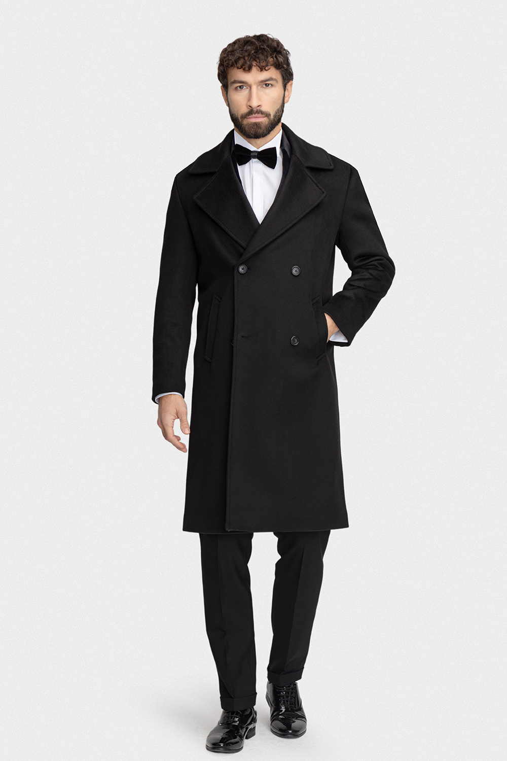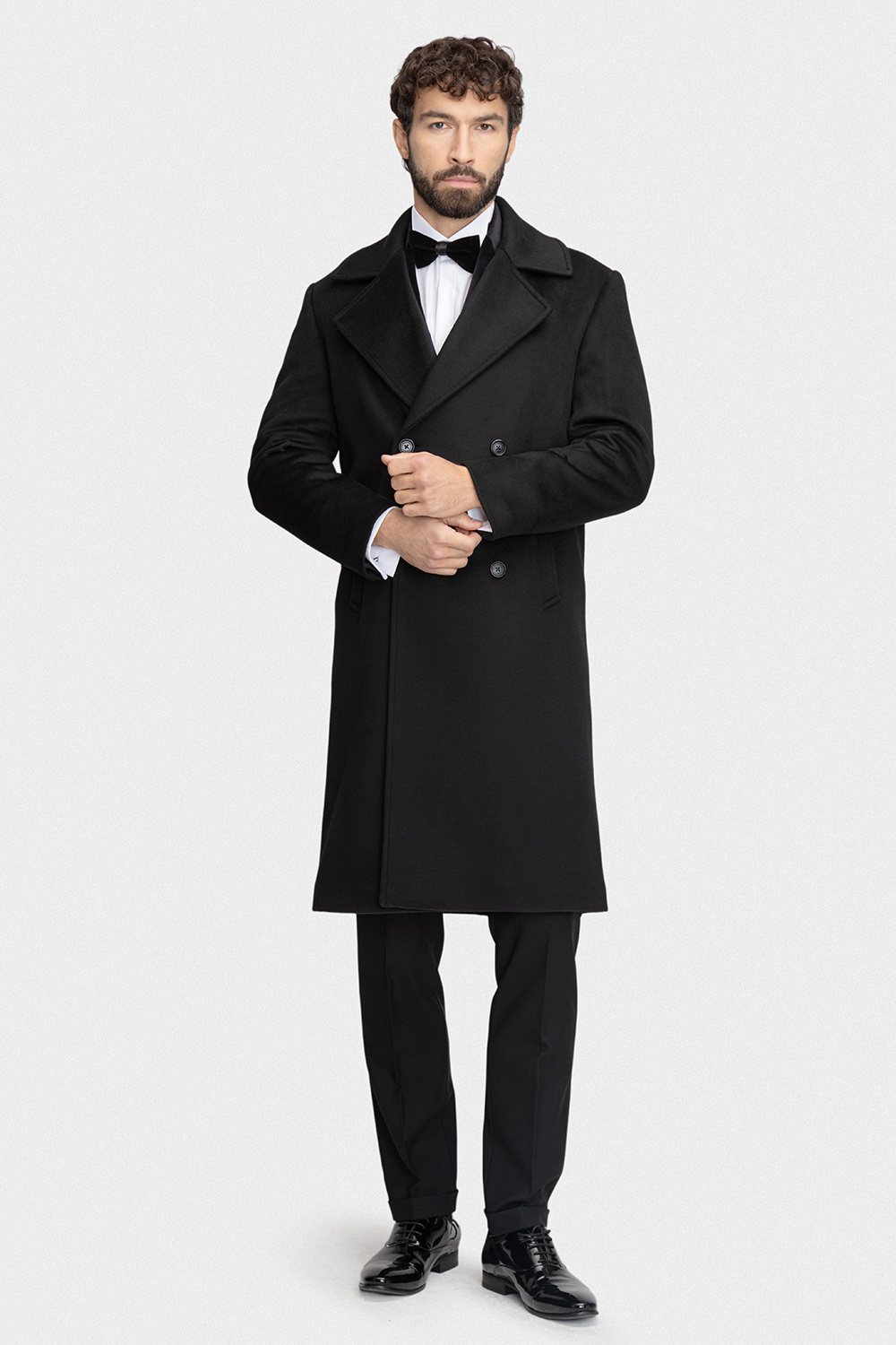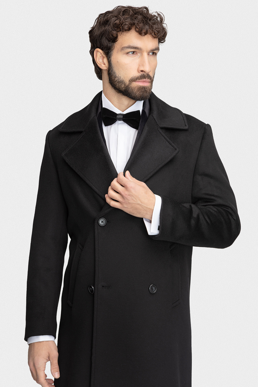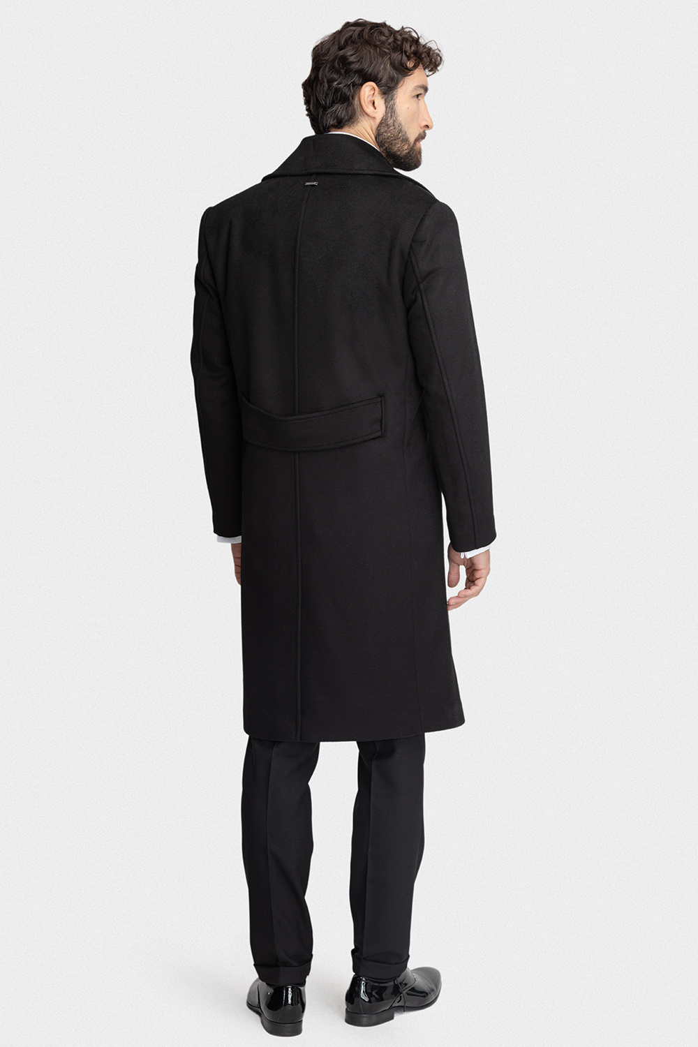 Głęboka, czarna barwa nadaje całości wyjątkowej elegancji i uniwersalności – płaszcz doskonale sprawdzi się zarówno w zestawieniu z garniturem, jak i w bardziej casualowych stylizacjach.