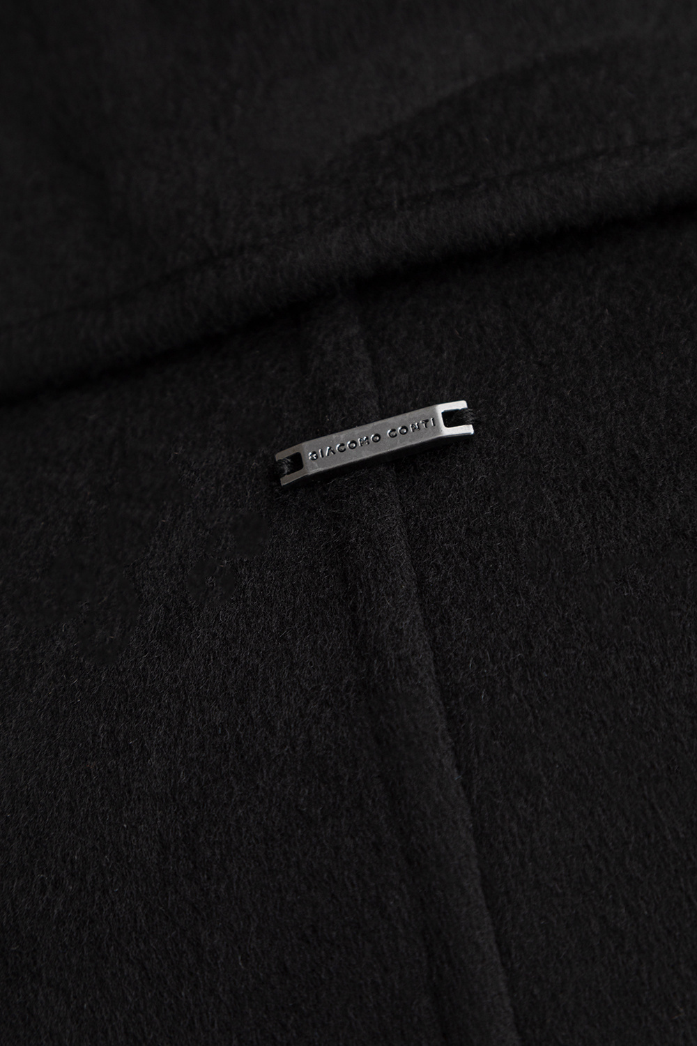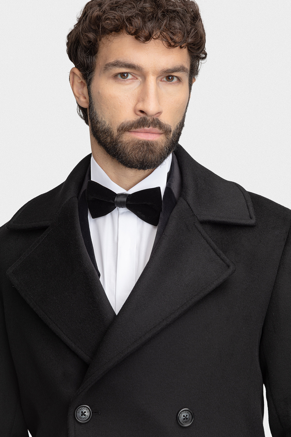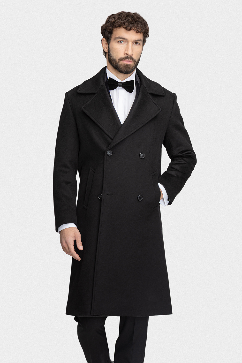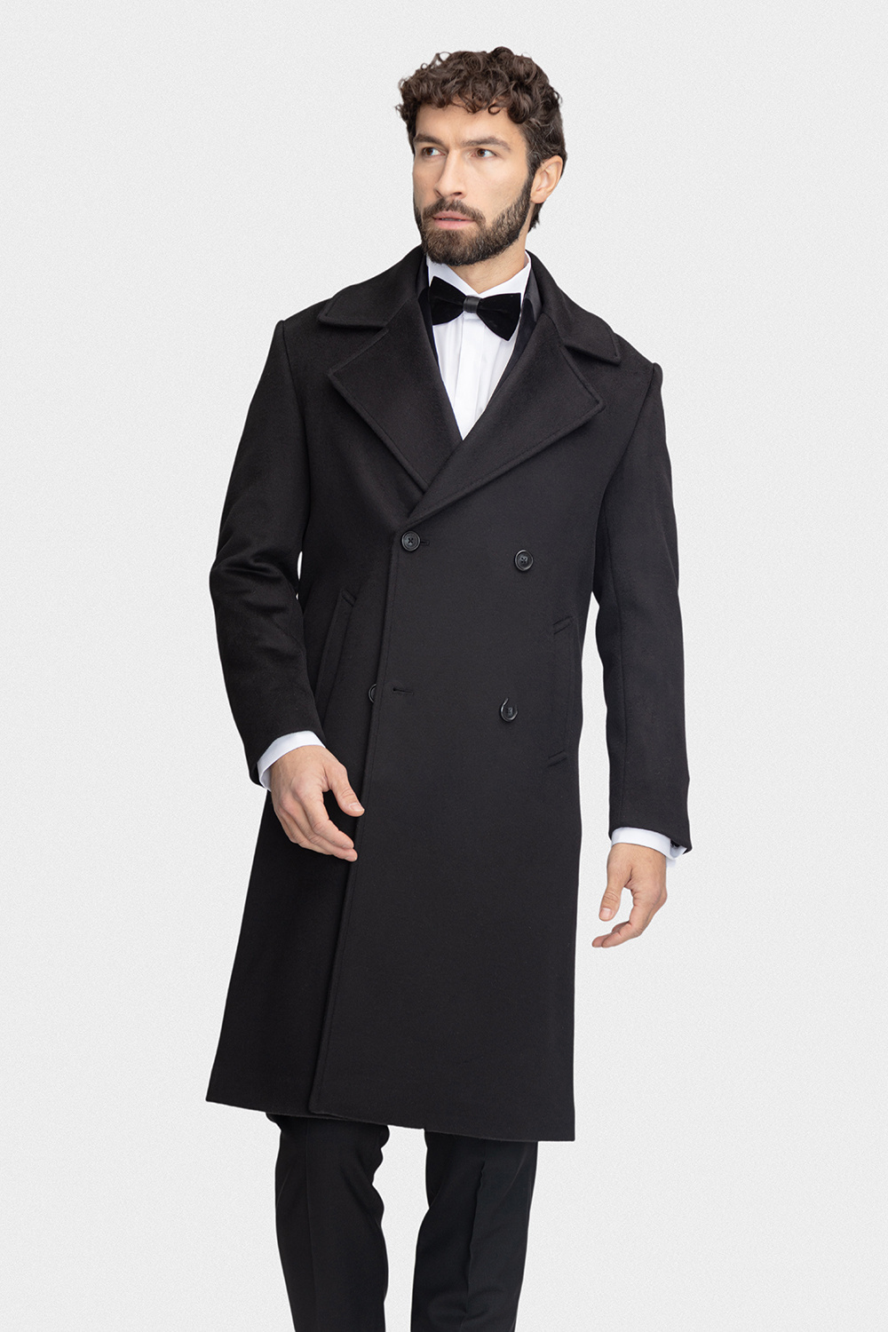 Głęboka, czarna barwa nadaje całości wyjątkowej elegancji i uniwersalności – płaszcz doskonale sprawdzi się zarówno w zestawieniu z garniturem, jak i w bardziej casualowych stylizacjach.
