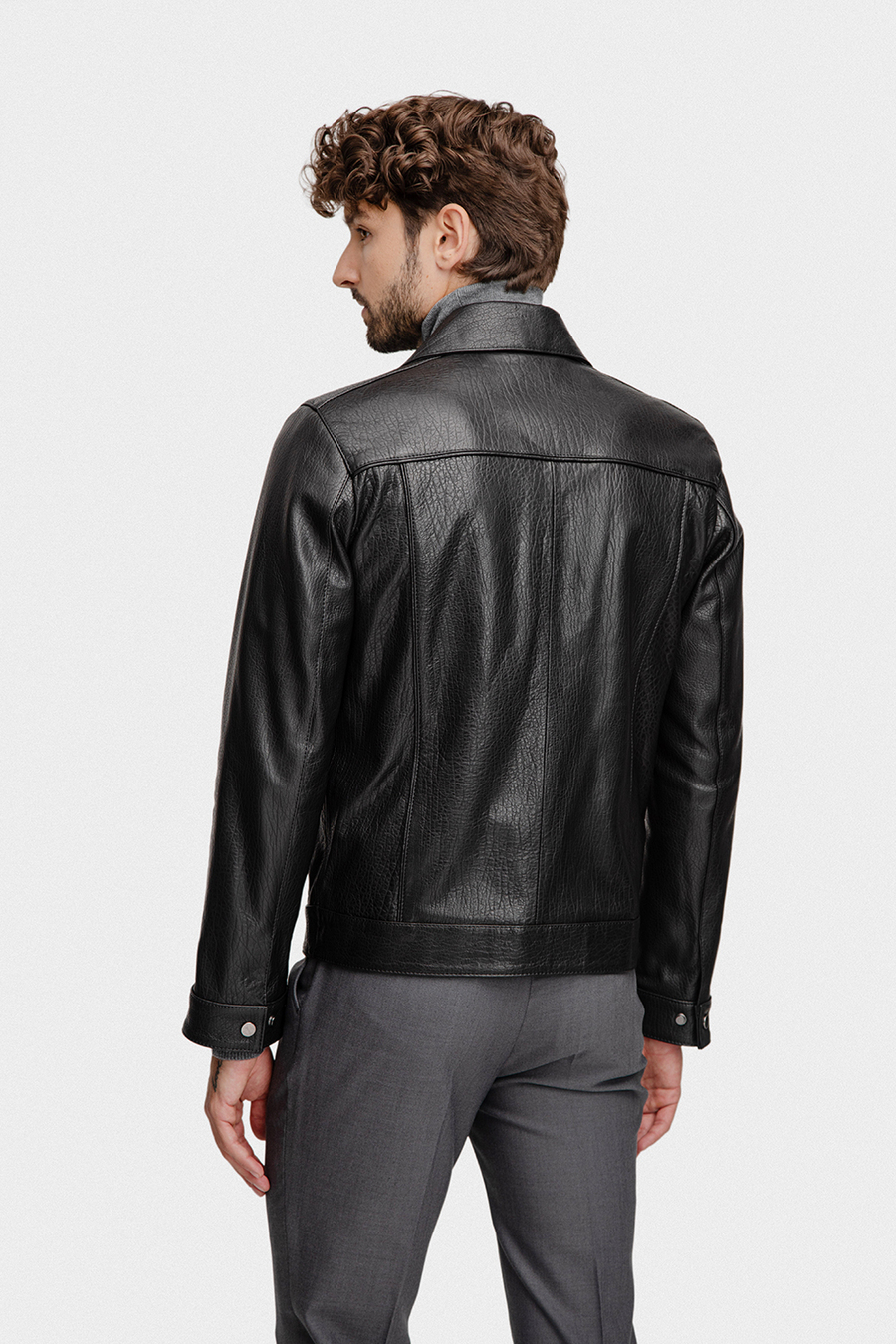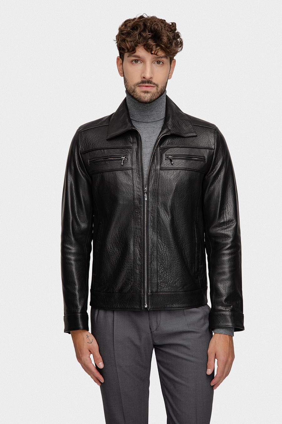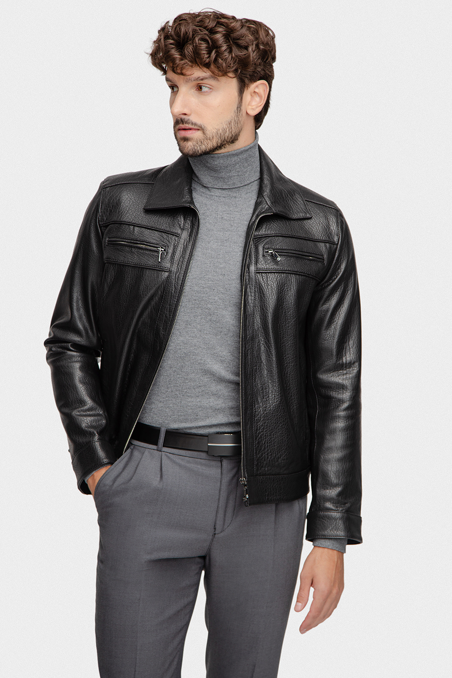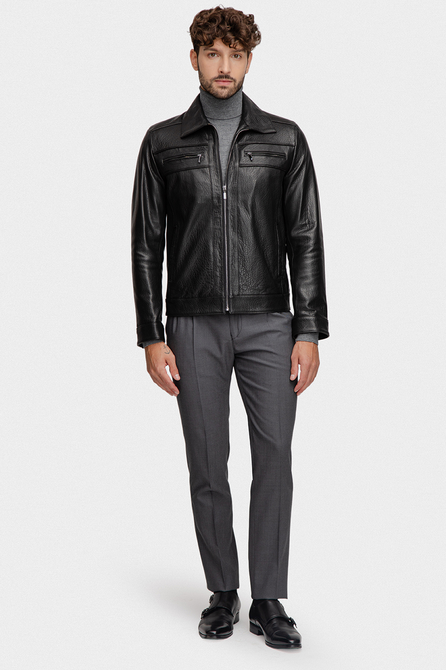 Czarny kolor skóry podkreśla elegancję modelu, nadając mu wyrafinowany, bardziej klasyczny charakter. Kolor ten doskonale wpisuje się w męską paletę barw, świetnie komponując się zarówno z formalnymi zestawami, jak i z bardziej swobodnymi stylizacjami. Dopasowany fason subtelnie akcentuje sylwetkę, a minimalistyczne detale i funkcjonalne rozwiązania świadczą o wysokim poziomie krawieckiego kunsztu.