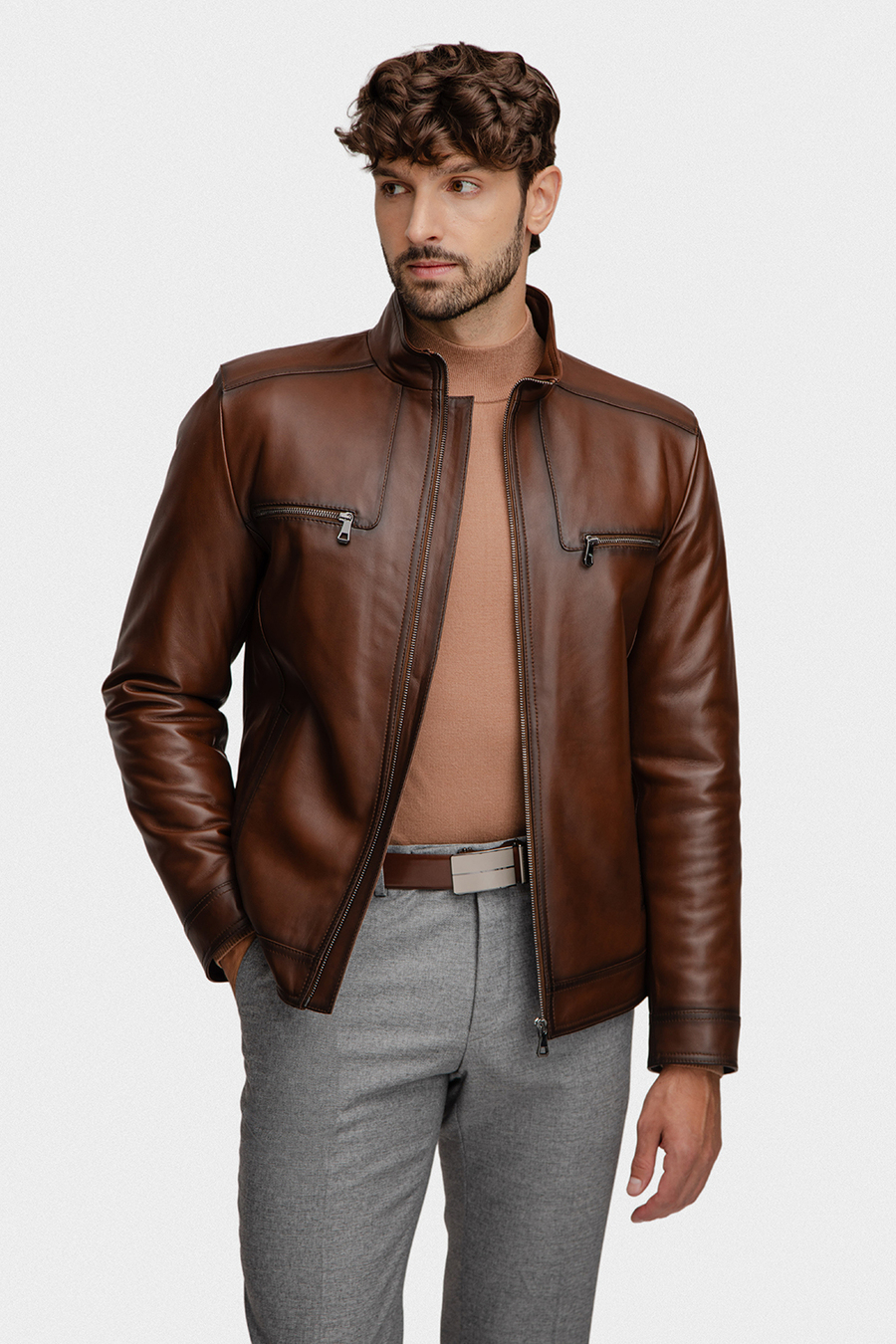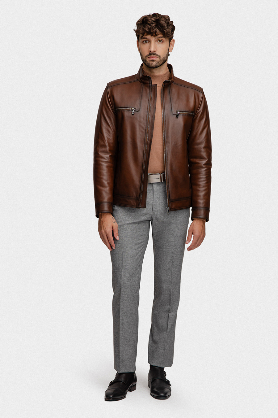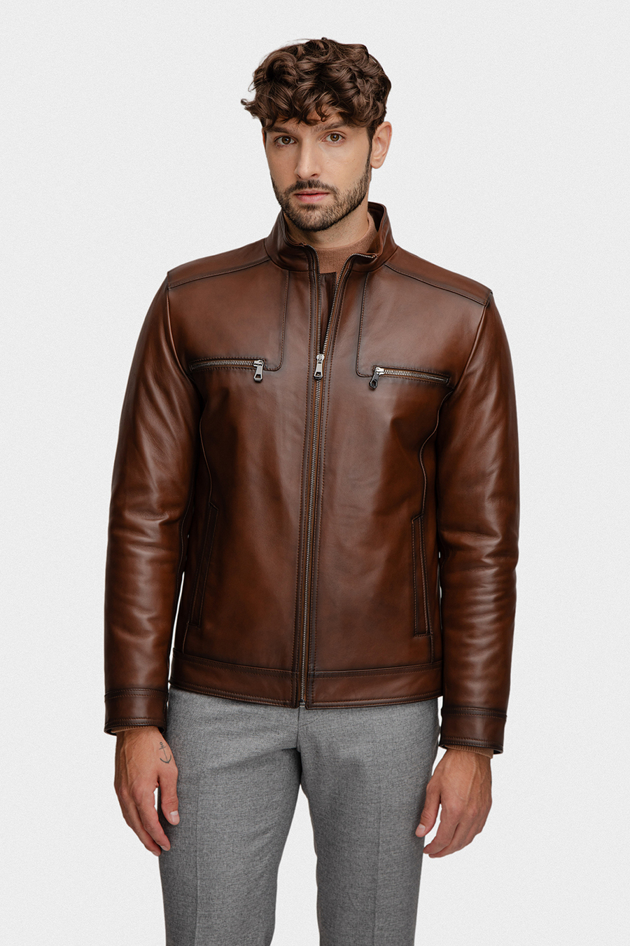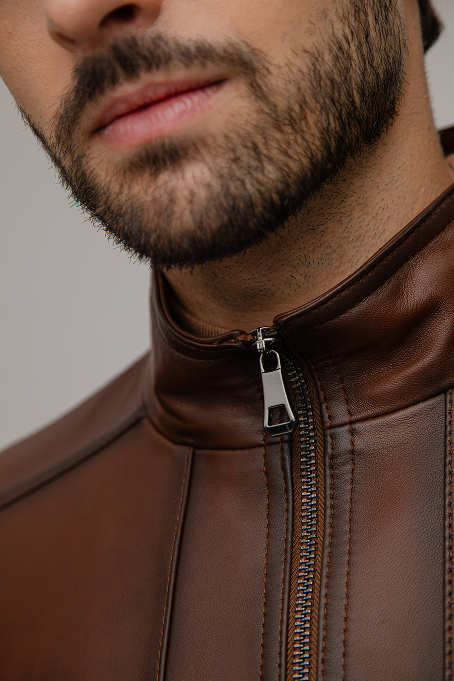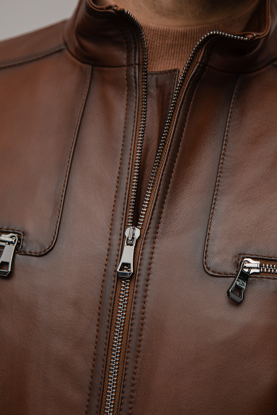 Kurtka utrzymana jest w ciepłym, brązowym odcieniu i charakteryzuje się gładką strukturą, wzbogaconą o subtelne przeszycia w okolicach klatki piersiowej, które dodają jej elegancji i nowoczesnego charakteru. Całość uzupełniają wysokiej jakości zamki, podkreślające dbałość o detale. Model posiada jednorzędowe zapięcie na solidny zamek błyskawiczny, co zapewnia wygodę i trwałość użytkowania.