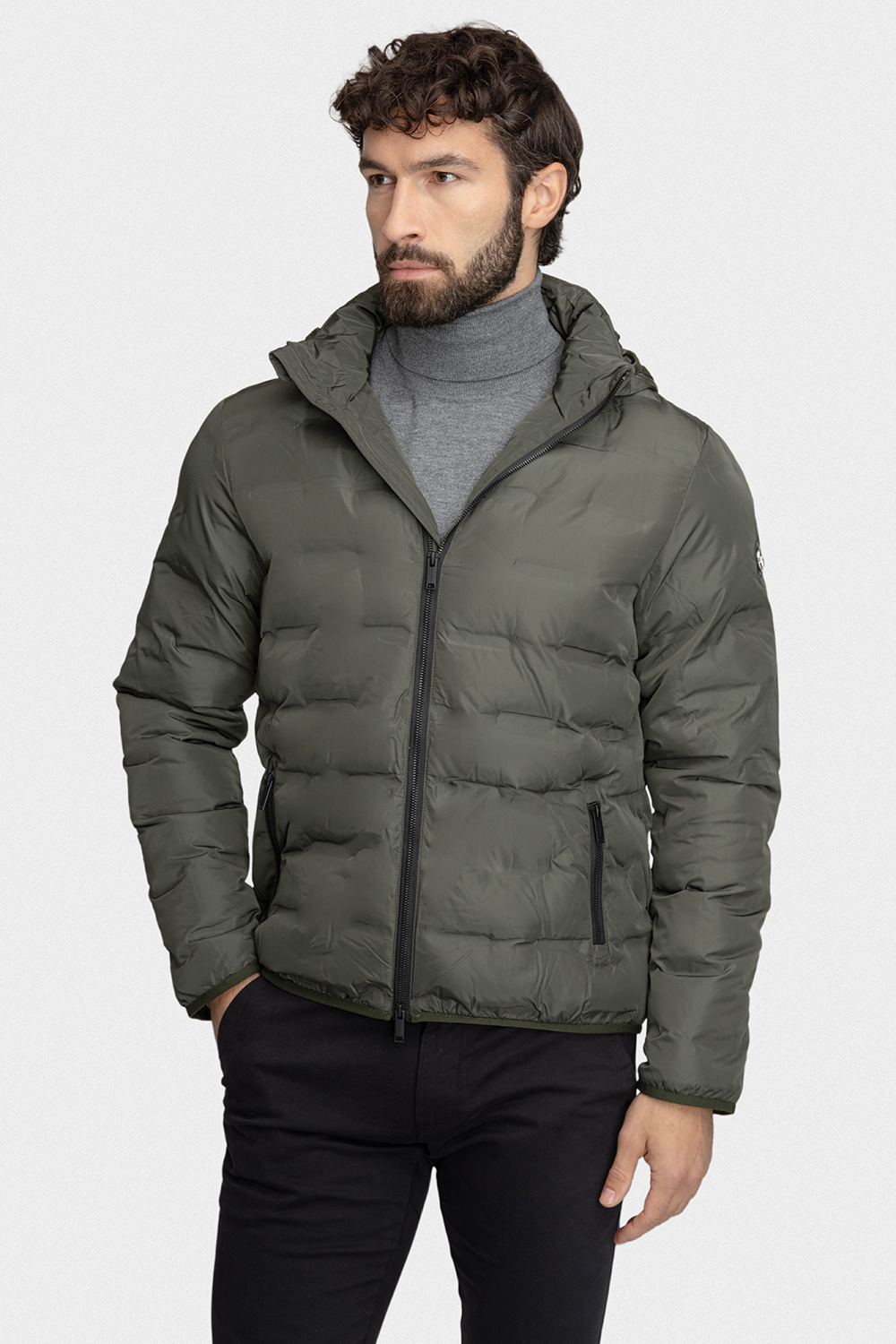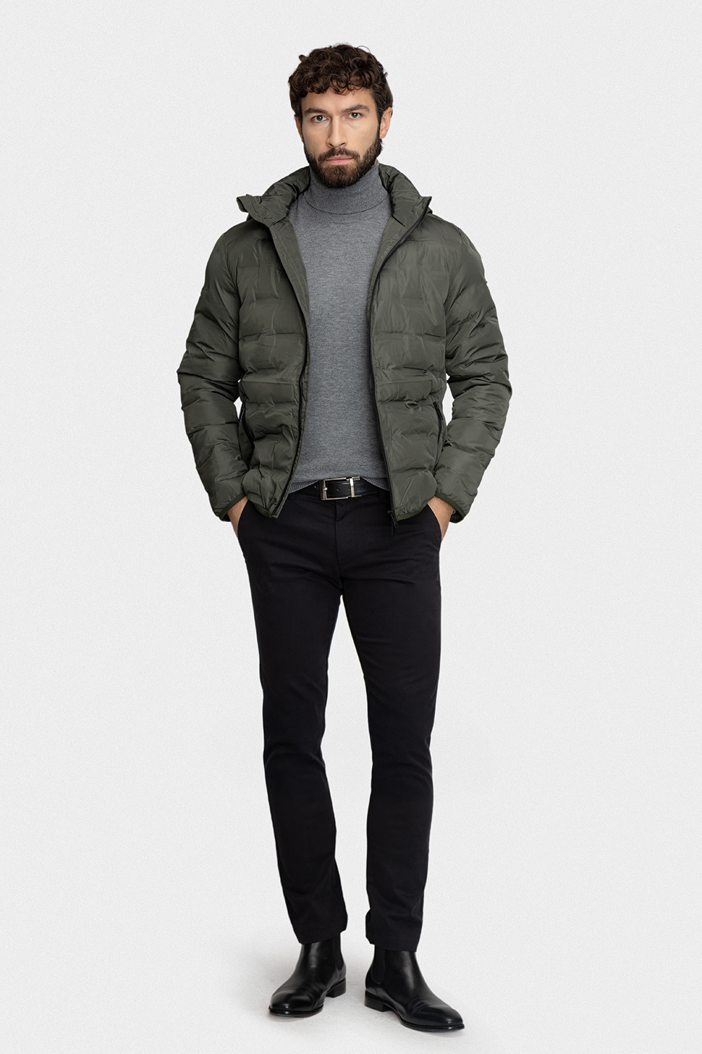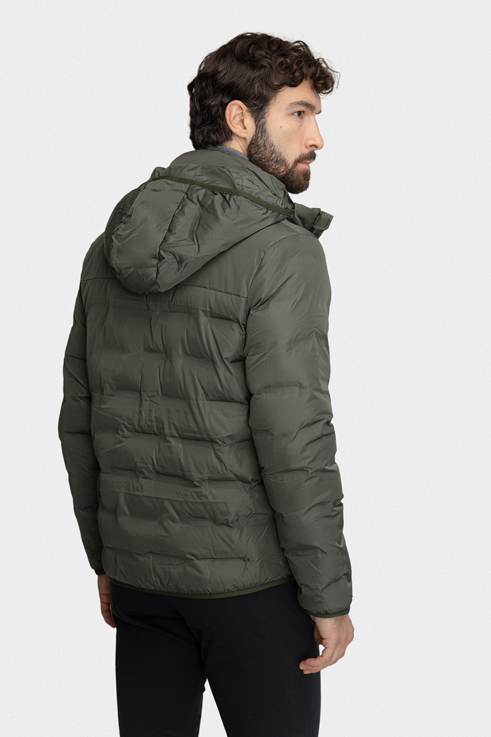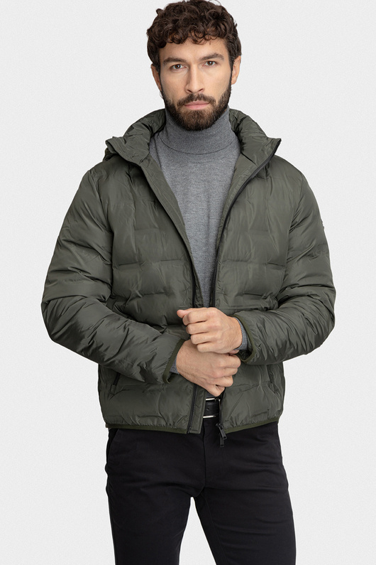 Kurtka ma fason slim, który doskonale dopasowuje się do sylwetki, podkreślając jej męski charakter. Ciemnozielony kolor nadaje jej subtelnego wyrazu i nowoczesnego stylu. Praktyczny kaptur zapewnia dodatkową ochronę przed wiatrem i deszczem, a funkcjonalne kieszenie boczne zapinane na zamek zwiększają wygodę użytkowania. Starannie zaprojektowane detale perfekcyjnie dopełniają całość modelu.