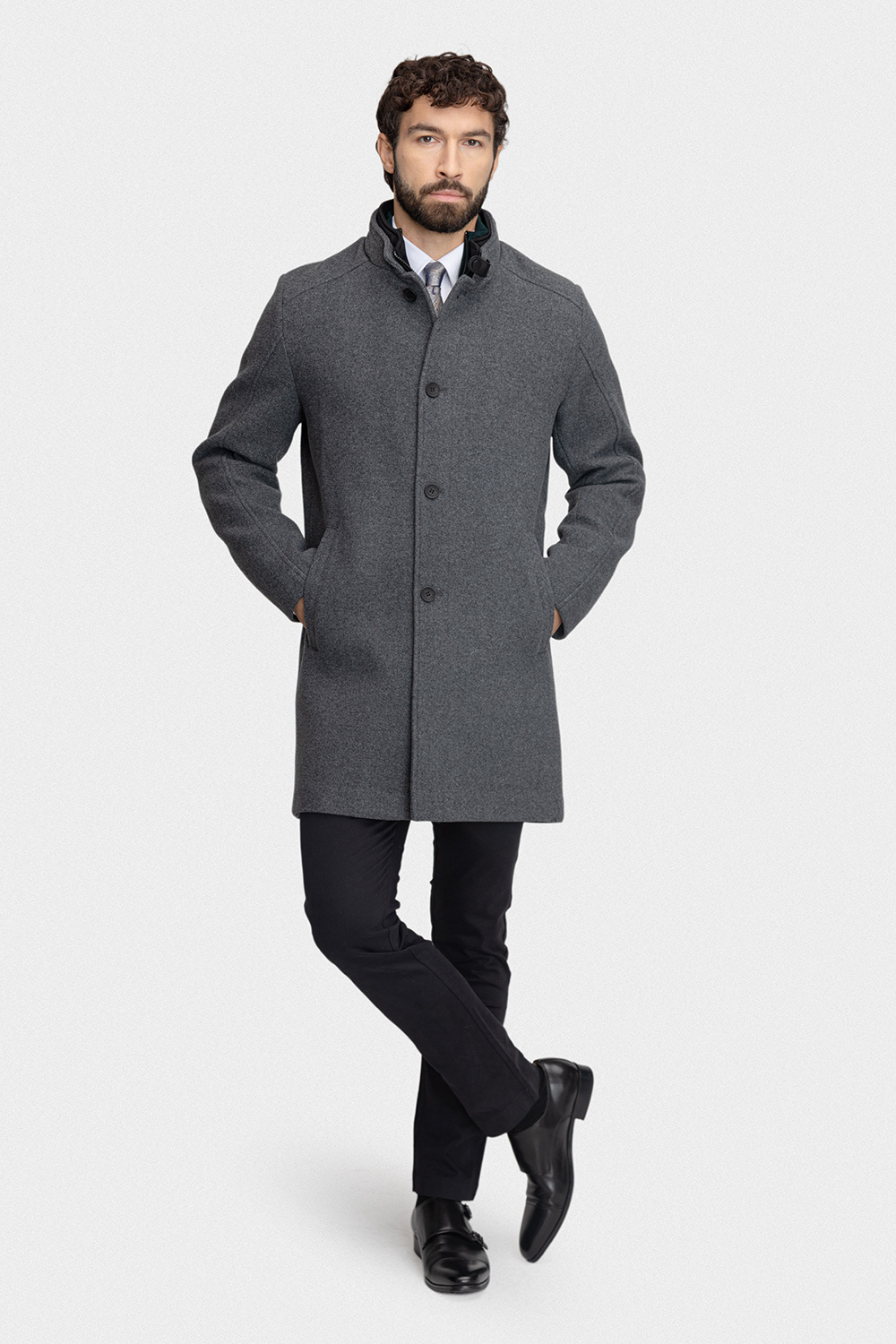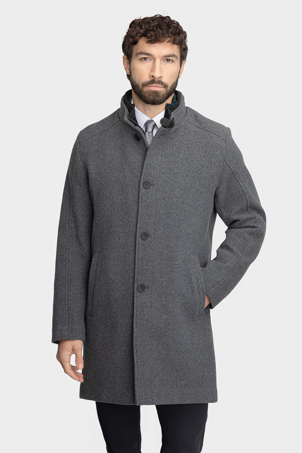 Popielaty kolor o gładkim wzorze sprawia, że płaszcz jest niezwykle uniwersalny – doskonale pasuje zarówno do eleganckiego garnituru, jak i do codziennych stylizacji. Podpinka zapinana na zamek, skutecznie chroni przed wiatrem, zapewniając dodatkowy komfort w chłodniejsze dni. Pionowe kieszenie nadają płaszczowi indywidualnego charakteru, a ich funkcjonalność jest na najwyższym poziomie, oferując wygodę przechowywania drobnych przedmiotów. Fason slim oraz odpowiednio zaprojektowana długość płaszcza wpływają na jego elegancki i nowoczesny wygląd, podkreślając sylwetkę i dodając całości subtelnej klasy.
