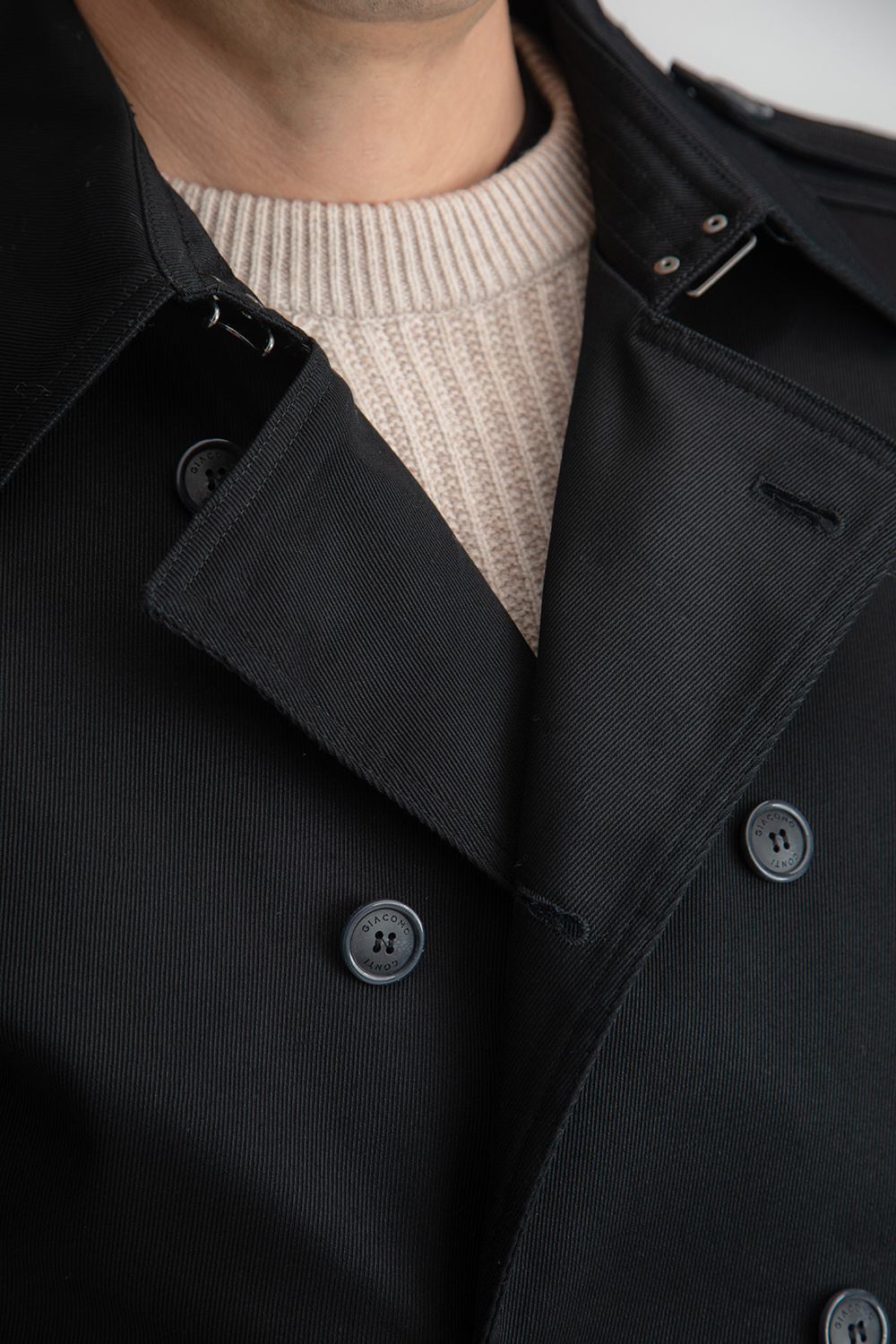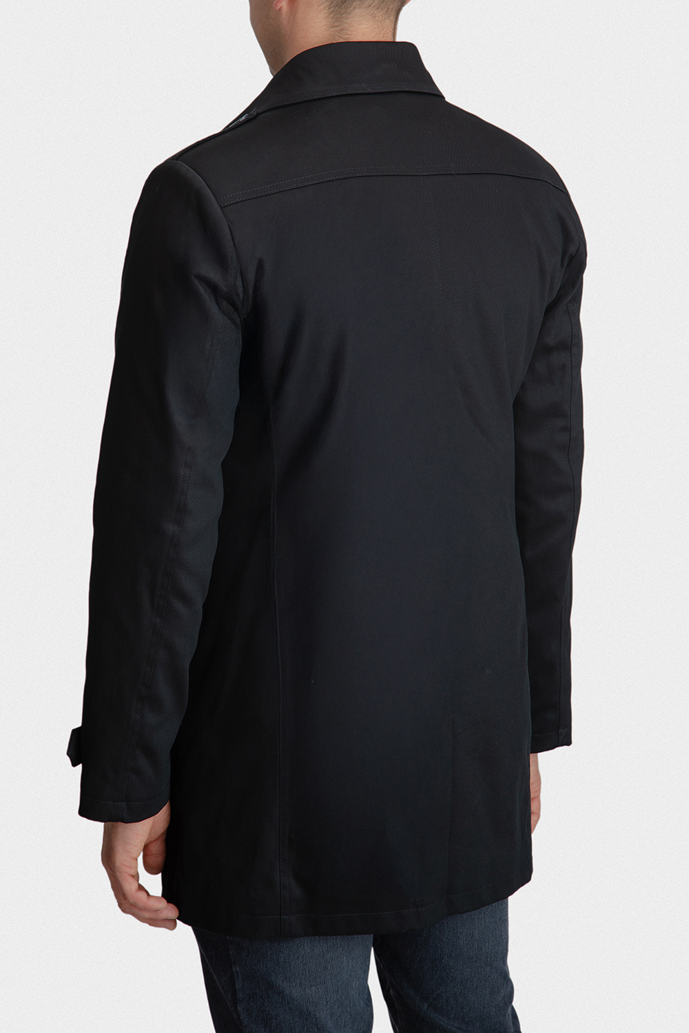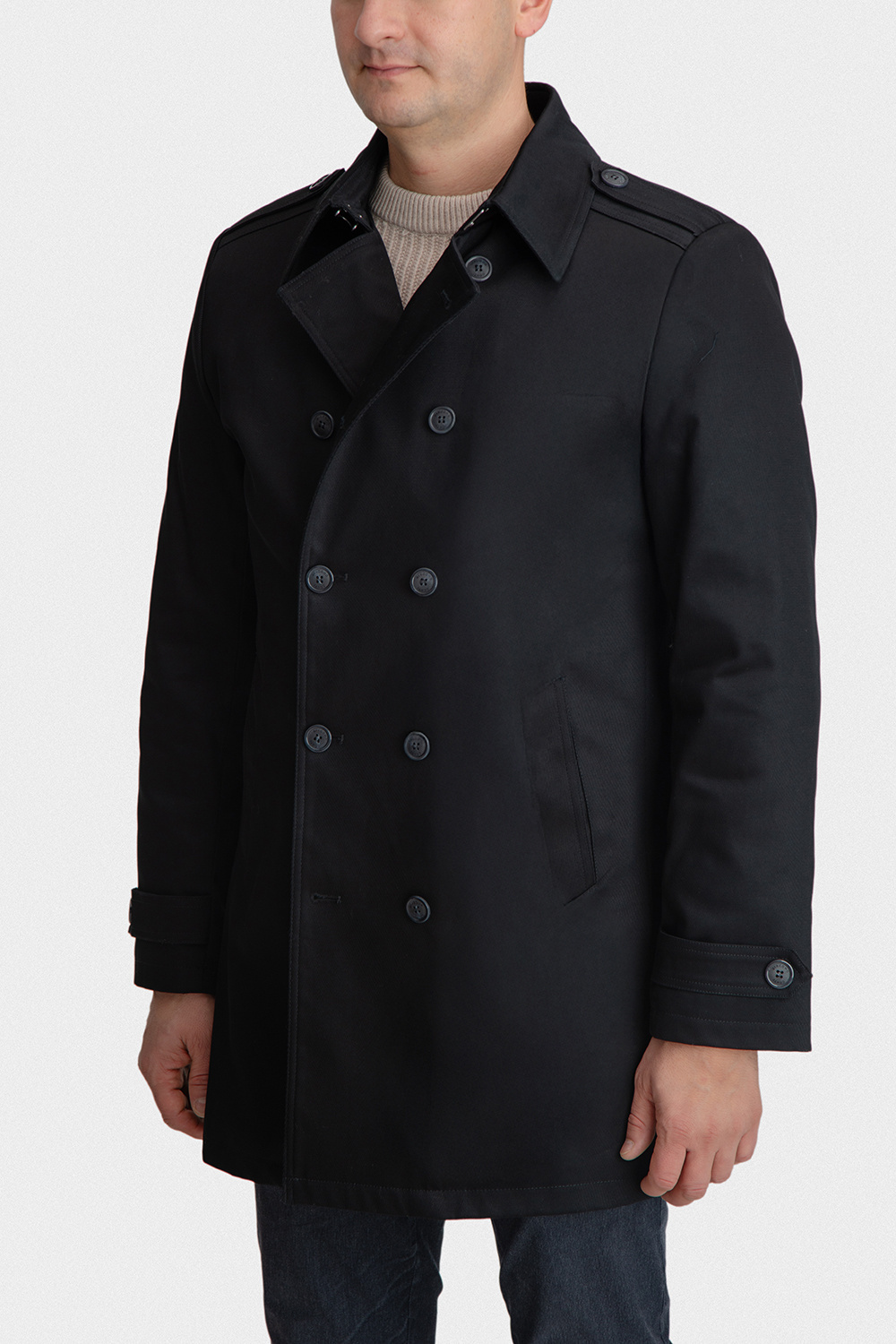 Klasyczny czarny odcień o gładkiej strukturze to zdecydowanie uniwersalna i ponadczasowa propozycja. Płaszcz zapinany na dwurzędowe zapięcie na guziki co czyni go niezwykle eleganckim. Fason slim dopasowuje się do sylwetki.