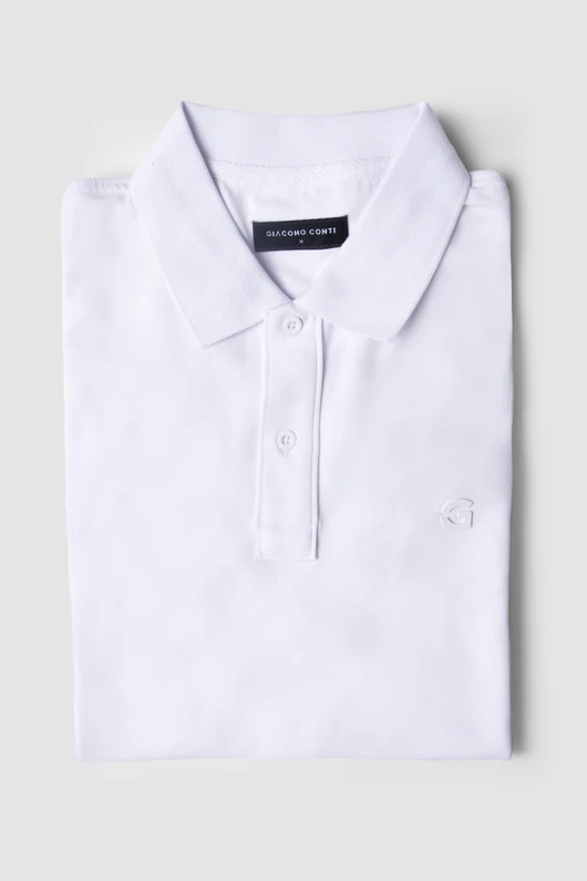 Biały kolor w połączeniu z gładką, lekko aksamitną strukturą tkaniny nadaje koszulce elegancki, uniwersalny charakter, który sprawdza się zarówno w stylizacjach casualowych, jak i bardziej formalnych. Delikatnie usztywniony kołnierzyk i zapięcie na dwa guziki podkreślają klasyczny styl, a dopasowany krój typu slim subtelnie eksponuje sylwetkę, zapewniając przy tym pełen komfort noszenia.