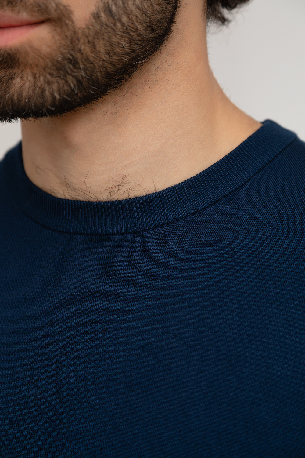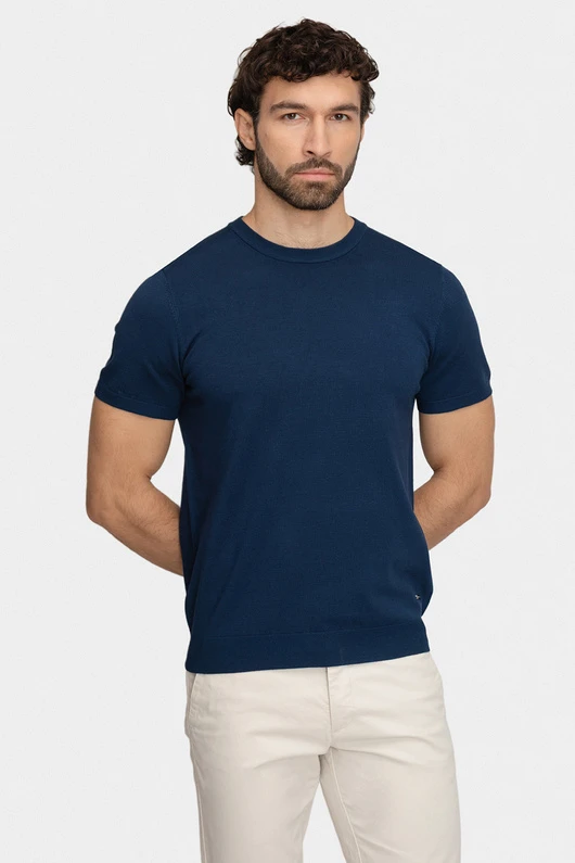 Gładka struktura tkaniny nadaje całości nowoczesnego i estetycznego wyglądu, a granatowy, uniwersalny odcień sprawia, że koszulka łatwo komponuje się z różnymi elementami garderoby. Fason slim perfekcyjnie dopasowuje się do sylwetki, podkreślając jej atuty, a jednocześnie nie ogranicza swobody ruchów.