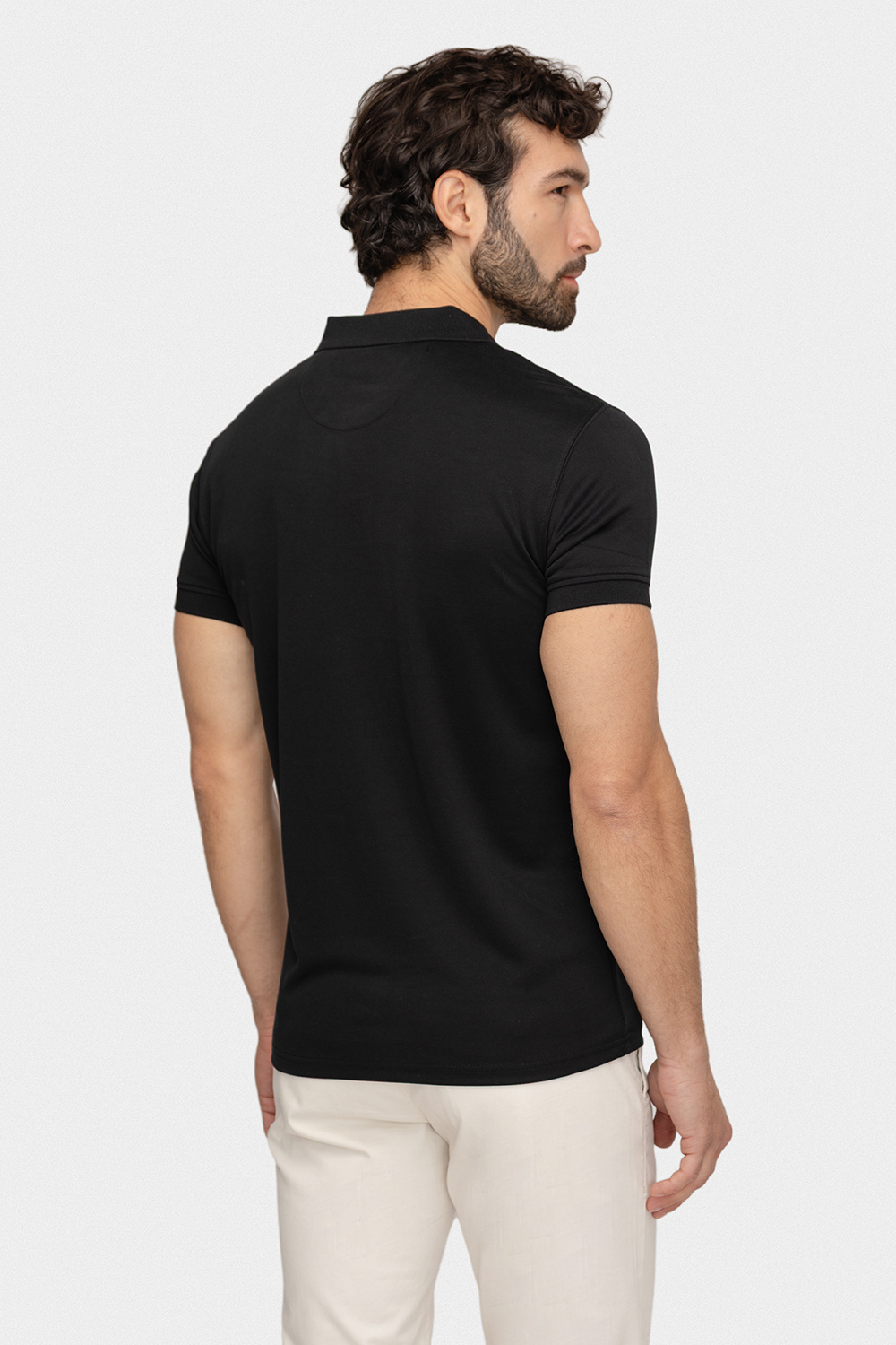 Czarny odcień oraz gładka, subtelnie miękka struktura tkaniny nadają modelowi uniwersalny i nowoczesny wygląd. Delikatnie usztywniony kołnierzyk oraz zapięcie na dwa guziki podkreślają elegancki styl koszulki, a fason slim dobrze układa się na sylwetce, akcentując jej atuty, nie ograniczając przy tym swobody ruchów.