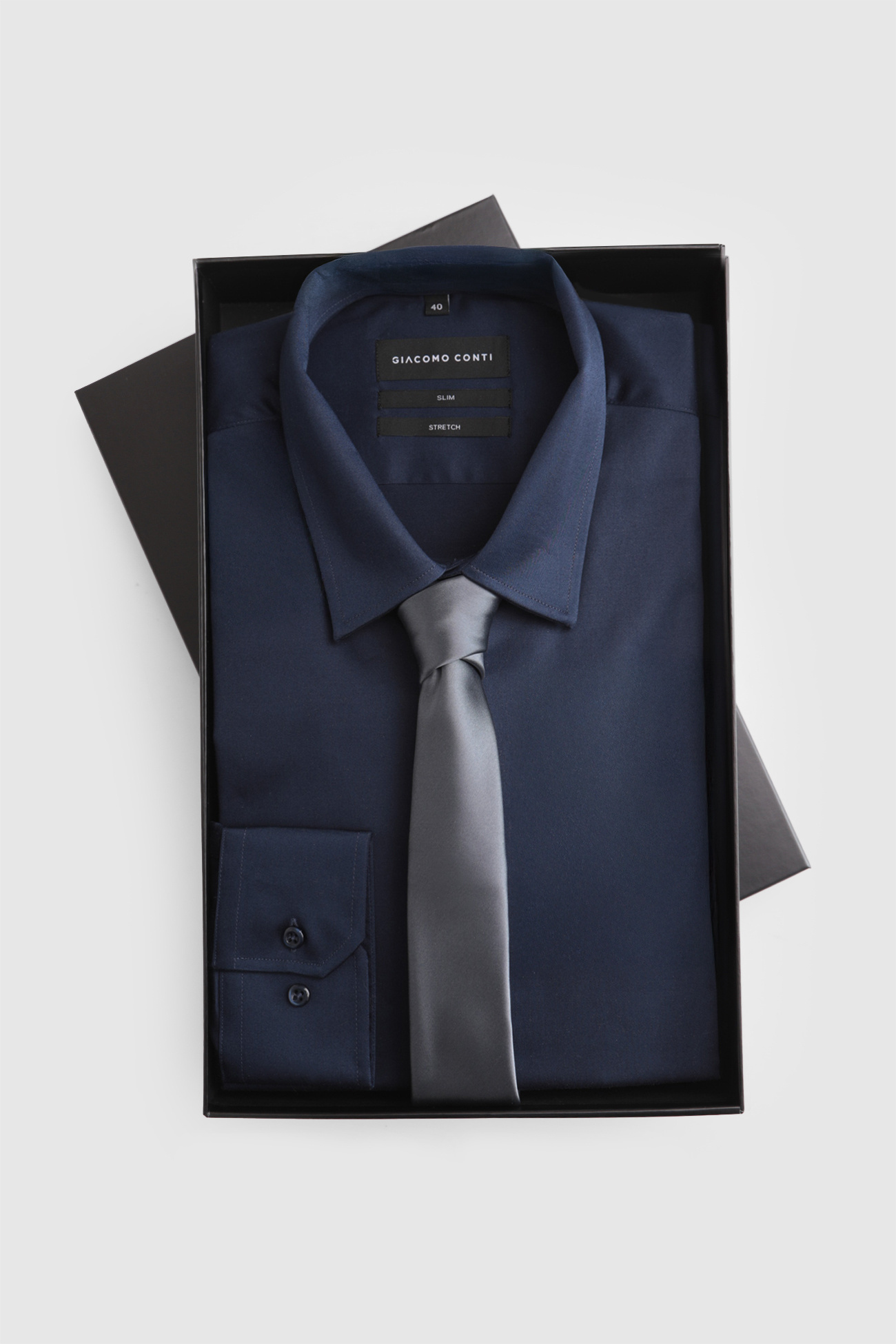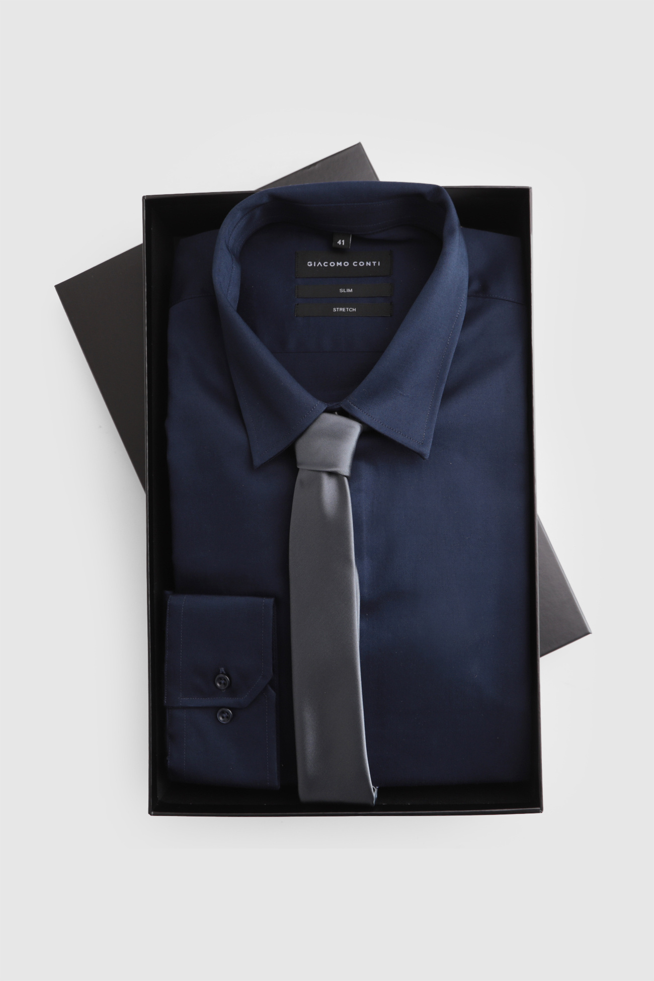 Elegancki zestaw prezentowy składający się z męskiej koszuli i krawat, zapakowany w ekskluzywne pudełko prezentowe Giacomo Conti. To idealny pomysł na stylowy i praktyczny upominek.