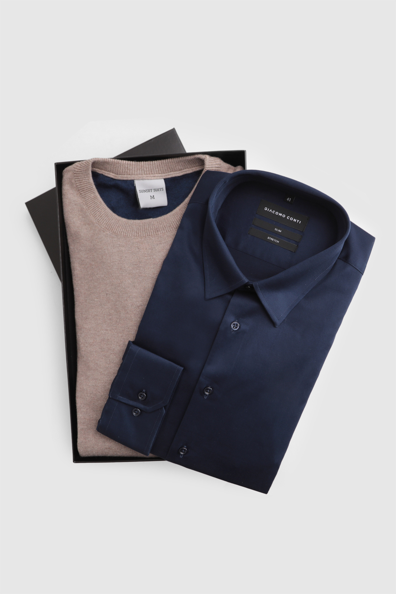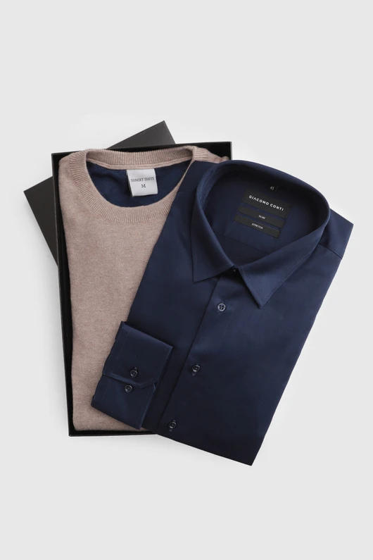 Elegancki zestaw prezentowy składający się z męskiej koszuli SIMONE oraz swetra EDDY zapakowany w ekskluzywne pudełko prezentowe Giacomo Conti. To idealny pomysł na stylowy i praktyczny upominek.