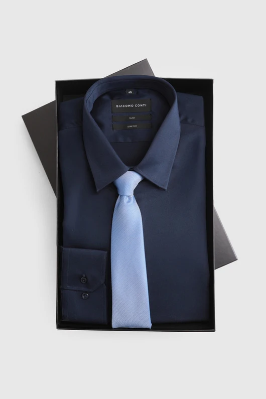 Elegancki zestaw prezentowy składający się z męskiej koszuli SIMONE oraz krawatu, zapakowany w ekskluzywne pudełko prezentowe Giacomo Conti. To idealny pomysł na stylowy i praktyczny upominek.