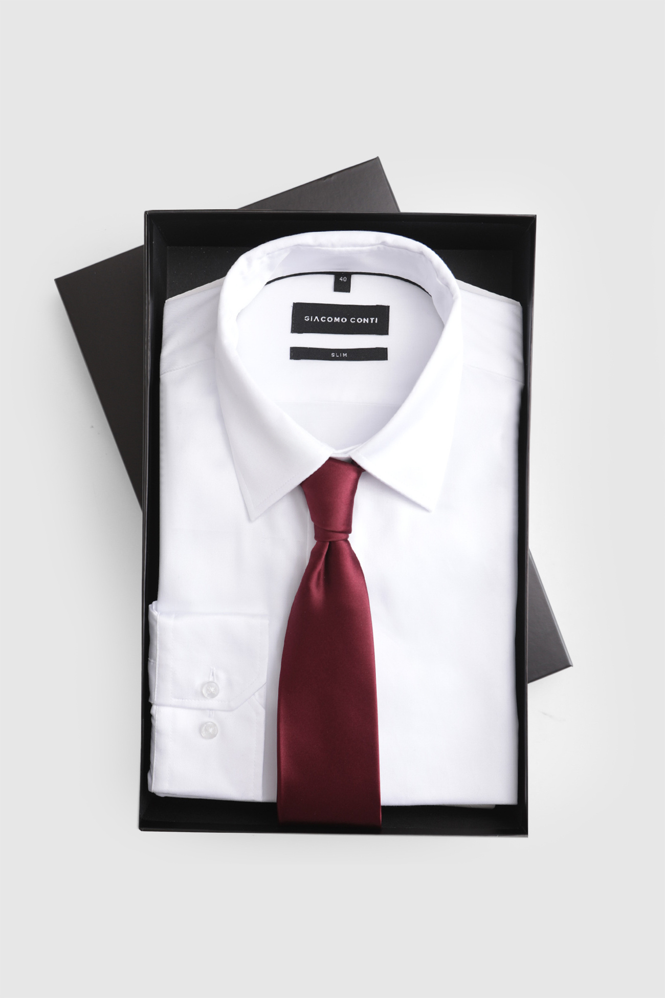 Elegancki zestaw prezentowy składający się z męskiej koszuli SIMONE oraz krawatu, zapakowany w ekskluzywne pudełko prezentowe Giacomo Conti. To idealny pomysł na stylowy i praktyczny upominek.