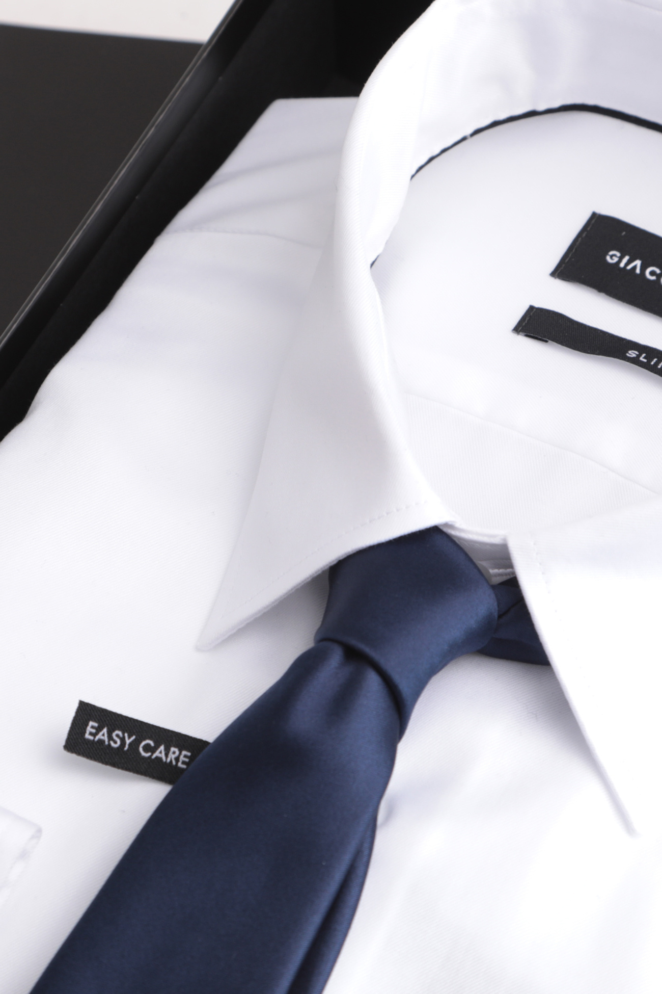 - Śnieżnobiały kolor i gładka struktura koszuli