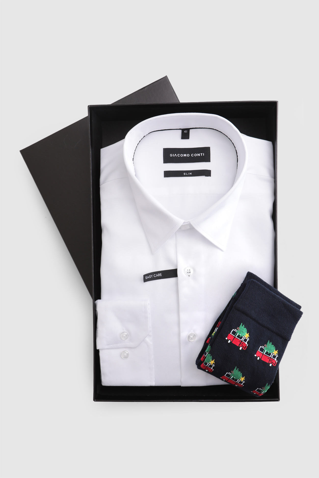 Elegancki zestaw prezentowy składający się z męskiej koszuli SIMONE oraz wzorzystych skarpet, zapakowany w ekskluzywne pudełko prezentowe Giacomo Conti. To idealny pomysł na stylowy i praktyczny upominek.